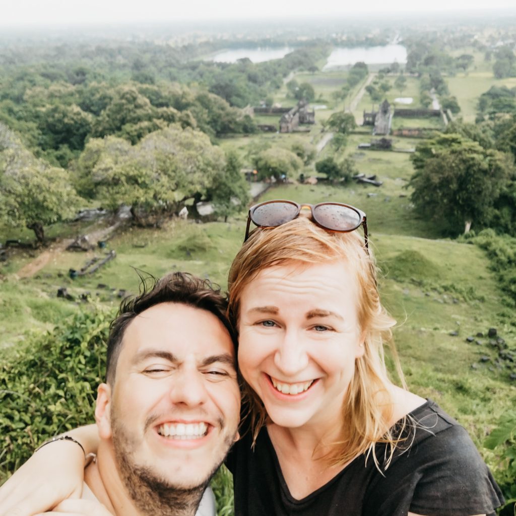 Konsti testet heute den Semi-Automatik-Roller. Wir sind schließlich kleine Spar-🦊🦊 und gleichzeitig wollen wir (sagen wir besser Konsti) die Rollervariante schon mal testen. Für den Ha Giang Loop in Vietnam soll die schaltbare Version deutlich besser sein. Wir machen uns also mit unserem Gefährt auf den Weg zu unserem heutigen Programmpunkt: Wat Phou. Auf der ca. 50 minütigen Fahrt sind wir schnell aus der Stadt draußen und folgen dann einer Straße dem Mekong entlang. Um uns herum sind lauter Reisfelder, ab und zu stehen winkende Kinder am Rand. Allein die Fahrt ist traumhaft schön und alles hier ist so schön grün. Nur das Wetter scheint etwas zuzuziehen. Wir haben natürlich keine Regenjacken dabei. Dabei haben wir die Ankündigung des Regens (deutsch wie wir sind) natürlich vorab noch in unseren Wetter-Apps gecheckt.