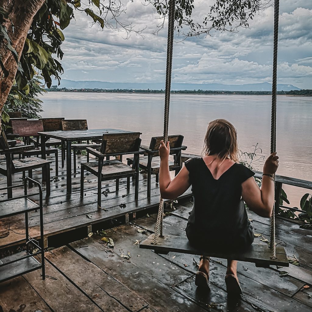 Nicht etwa eine Liebeserklärung unsererseits an das nächstgelegene Dorf, sondern der Name des Restaurants, das unsere Mägen wieder füllen wird. Vielleicht ist dafür doch eine Liebeserklärung angebracht. Es ist (natürlich) eine Empfehlung von Luang. Das Restaurant liegt direkt am Mekong, verfügt über eine große Terrasse und eine süße Schaukel. Es gibt vegetarisches Essen und guten Kaffee. Außer uns ist allerdings niemand da. Das verhältnismäßig große Restaurant, eine Hand voll Angestellte und wir.