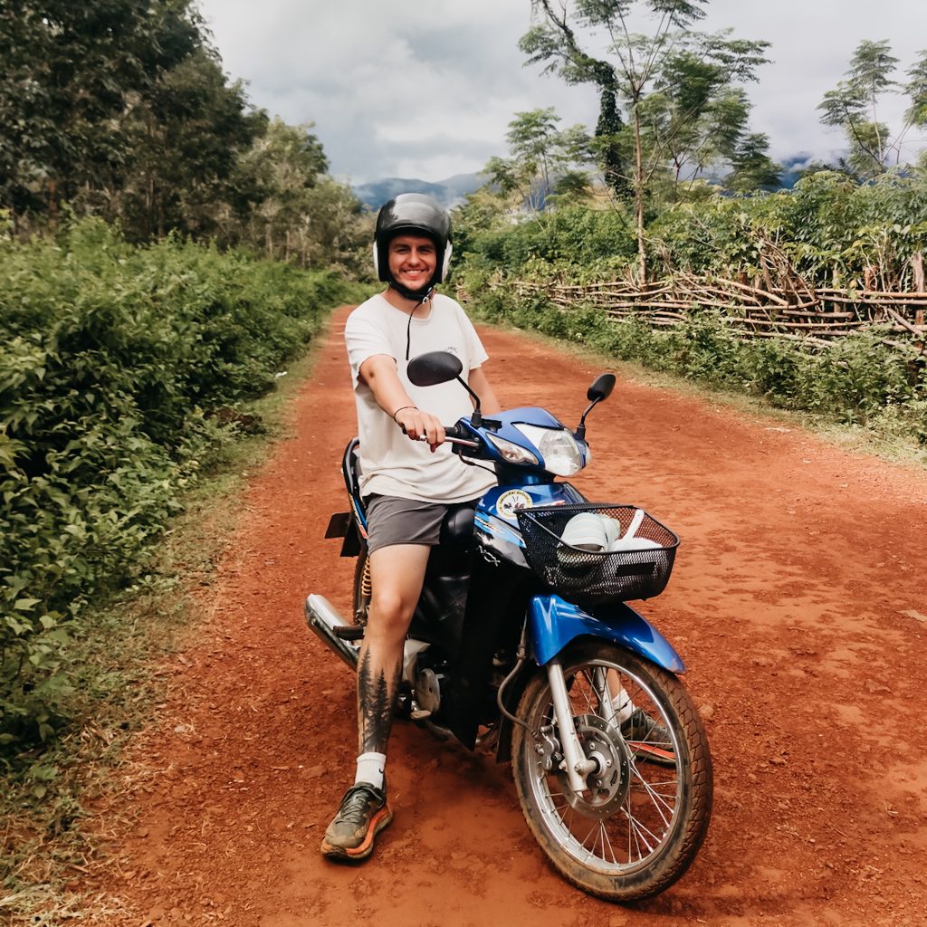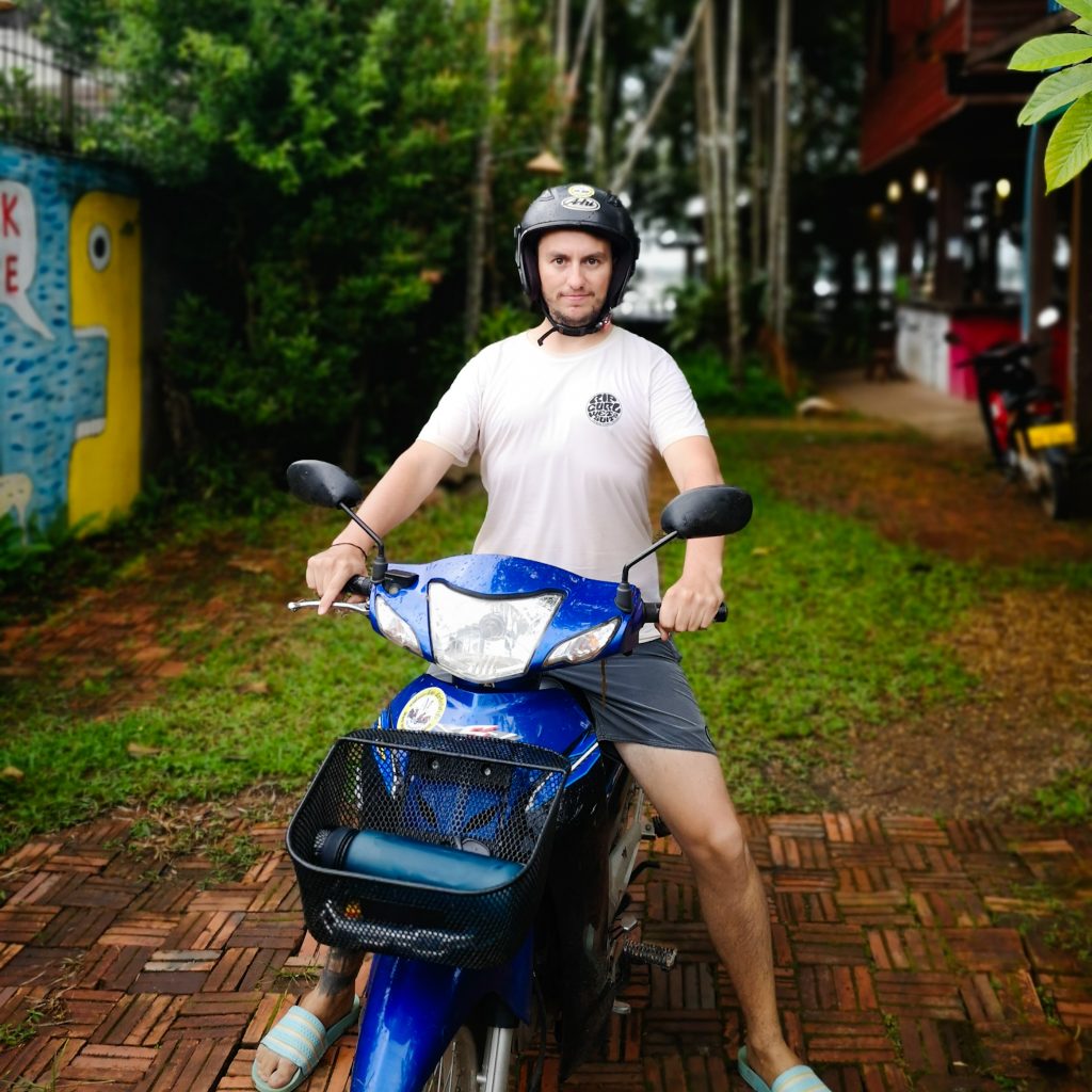 Caro steigt sicherheitshalber ab und Konsti fährt mit dem Motorrad vorsichtig weiter. Was ihr wissen solltet: Wir sind von Luang genau instruiert worden, dass wir den Roller immer gut abschließen sollen. Darüber hinaus ist es ratsam, den Roller nie einfach nur am Straßenrand abzustellen. Am besten wir parken immer im Innenhof von Restaurants und Cafés. Der Grund ist simpel: Rollerdiebstahl. Das passiert hier wohl gar nicht mal so selten. Je länger wir uns darüber Gedanken machen, desto deutlicher wird uns, dass bis auf die meist ausländischen Mieter:innen der Rolle alle profitieren. Der Rollerverleih durch eine ausgleichende Finanzspritze, die es mit Sicherheit in sich hat. Der Dieb sowieso. Die Verkäufer:innen von Rollern, schließlich bleibt auch hier das Geschäft „am Rollen“. Auf den entsprechenden Seiten des auswärtigen Amtes wird man sogar vor einem abgekaterten Spiel gewarnt, bei dem Vermietungen und Diebe zusammenarbeiten. Etwas fies ist, dass es absolut normal ist, dass der Pass einbehalten wird als Pfand, bis der Roller eben wieder vor der Tür steht.