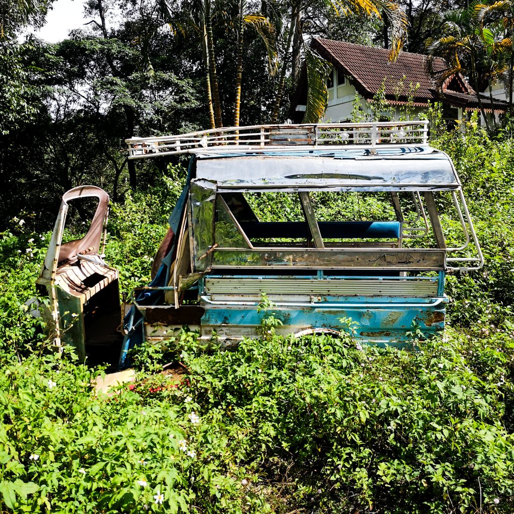 Von hier gehen wir ein ganz schönes Stück entlang der Straße. Obwohl die Uhr noch keine 10 anzeigt, ist es sehr heiß und wir kommen (mal wieder) ordentlich ins Schwitzen. Zwischendurch kommt mal ein Häuschen, ansonsten ist hier kaum etwas los. Weit kann es nicht mehr sein, wir laufen an Ruinen vorbei, wo vor ein paar Jahren noch ein kleines Resort direkt am Fluss gestanden hat. Jetzt sind die Scheiben eingeschlagen und auch das alte Tuktuk schmiegt sich in das verlassene Gesamtbild ein. Das wäre etwas für Lost-Place-Fans hier.