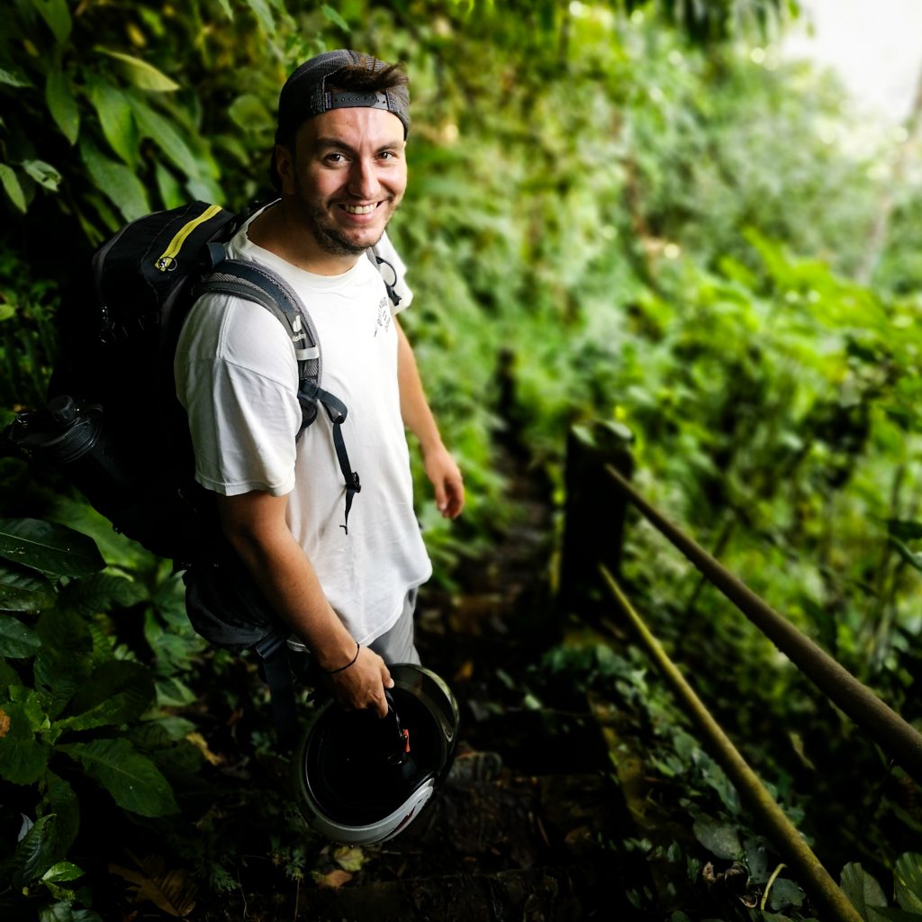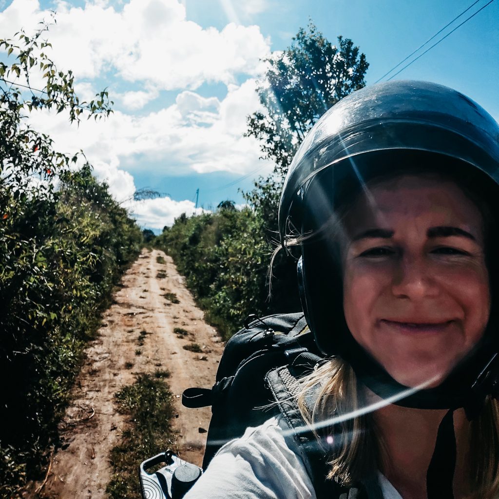 Etwas weiter die Hauptstraße runter, biegen wir erneut auf einen lehmigen Weg ab. Bis zum Wasserfall ist es ein ganz schönes Stück. Zwischendurch steigt Caro sicherheitshalber immer mal wieder ab, während Konsti unseren Roller durch die Pfützen und über den glitschigen Boden manövriert. Kurz zum Verständnis: Der Boden ist so rutschig, dass es sich selbst zu Fuß so anfühlt, als würde man über Eis laufen.