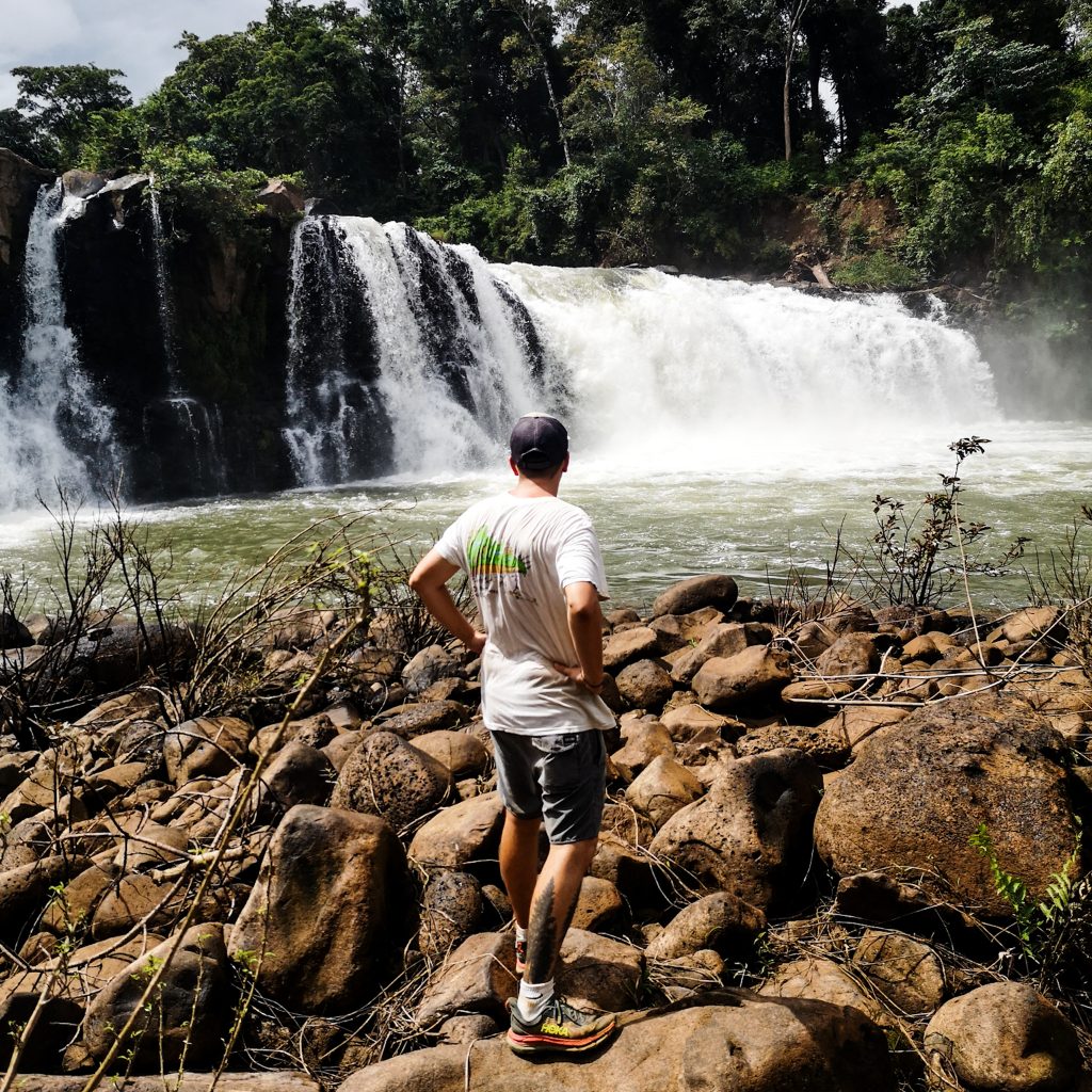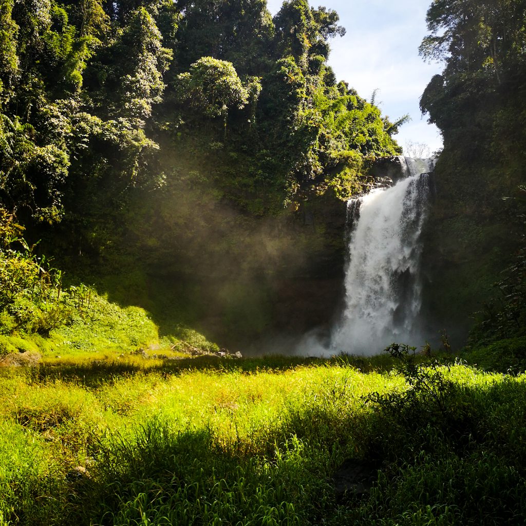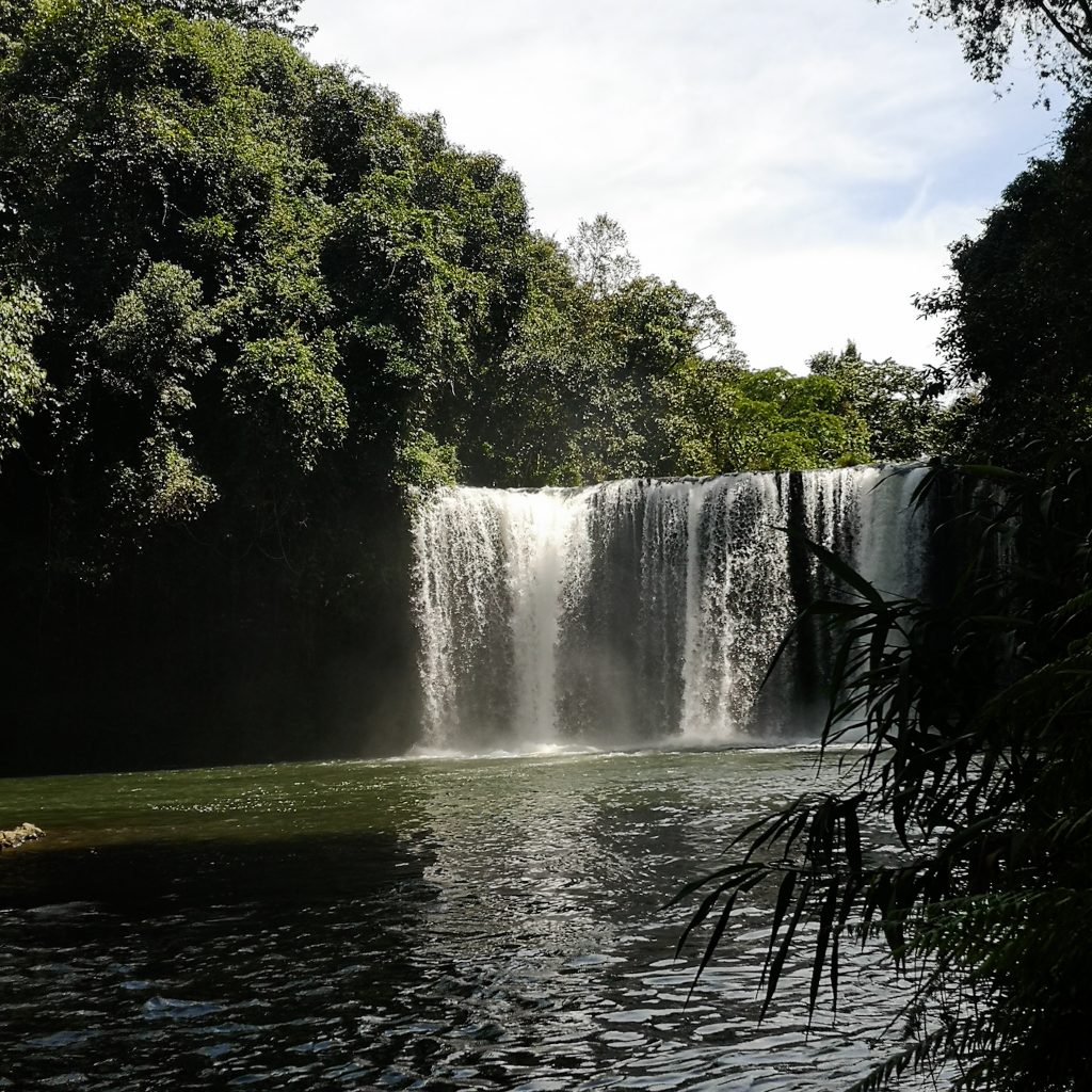 Aaaaber nun zu den schönen Dingen. Der Tad Gneuang bekommt eine sehr gute 2+ von uns. Er ist wahnsinnig beeindruckend. Mit einer Höhe vom 42 m ist er zwar längst nicht so hoch wie der erste, aber hier sind wir deutlich näher am Geschehen. So nah, dass wir richtig nass von der Gischt werden. Einfach schön und vor allen Dingen: sehr erfrischend. Besonders die grünen Pflanzen und großen Bananenblätter setzen den Wasserfall schön in Szene. Auf dem Rückweg ziehen wir schnell an den Ständen vorbei und setzen unsere Fahrt fort.