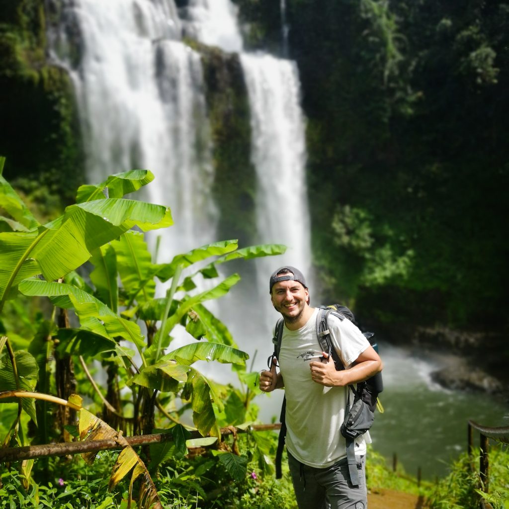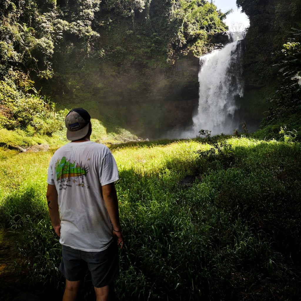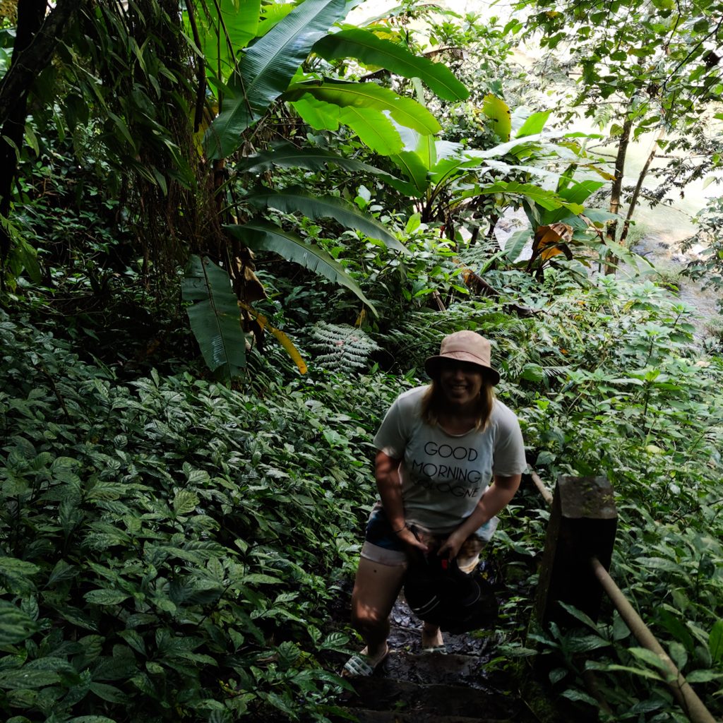 Wir können schon das Rauschen des Wasserfalls hören, allerdings ist er noch nicht im Sichtweite. Von jetzt müssen wir den Weg etwas erahnen, es ist ein total zugewachsener Trampelpfad, der bergab geht. Konsti (heute ausnahmsweise mit seinen Trailrunning-Schuhen bekleidet) geht vor, Caro in Adiletten hinterher. Stets auf der Hut, ob nicht irgendeine Schlange ihr Sonnenbad auf dem Weg genießt. Nach ca. 10 Minuten Jungletrek kommen wir unten an. Der E-TU Wasserfall ist wunderschön und zeigt sich mit dem einfallenden Sonnenlicht von seiner besten Seite. Wir klettern über ein paar Steine und bewundern diesen schönen Wasserfall mitten im Grünen. Das beste daran, wir sind ganz alleine. Kein Eintritt, kein Resort (mehr), keine anderen Menschen.