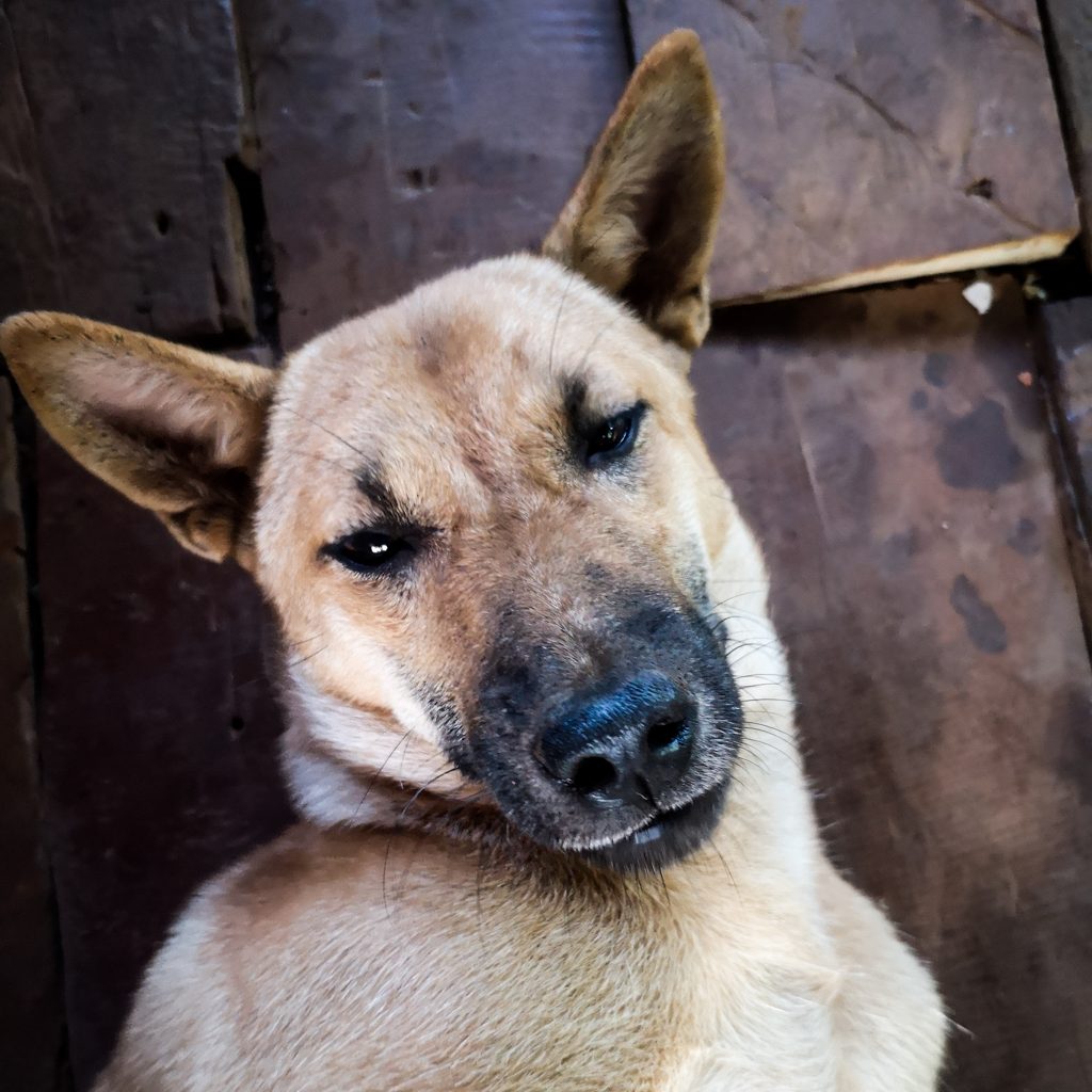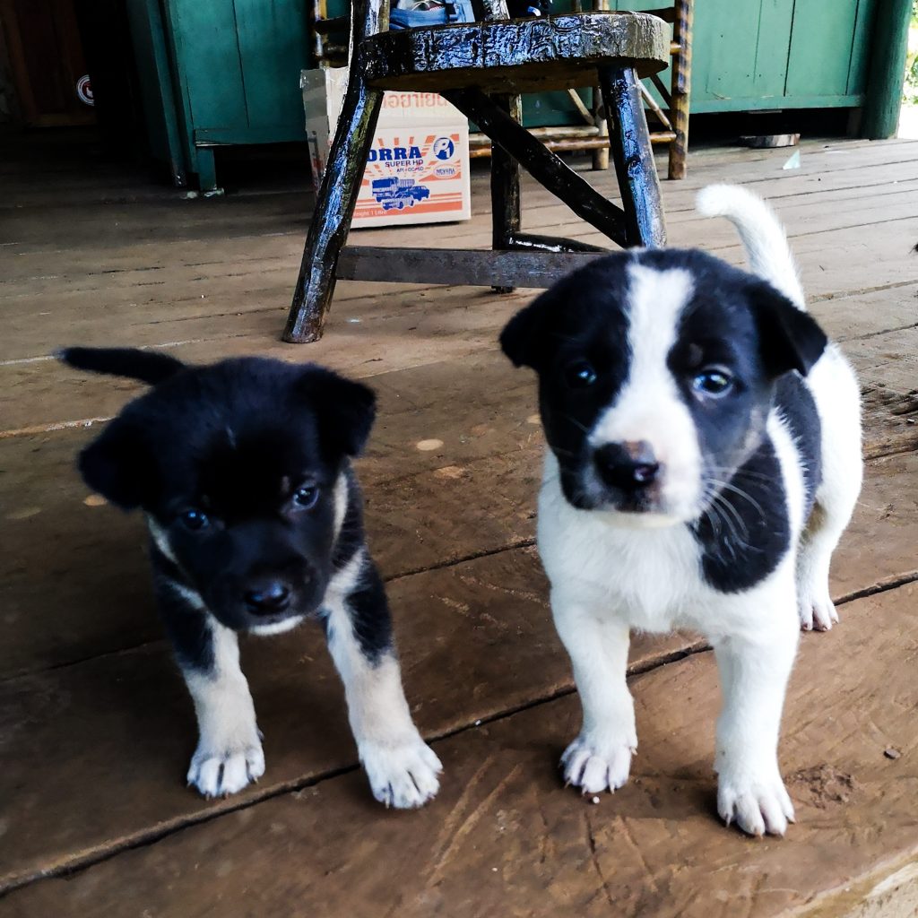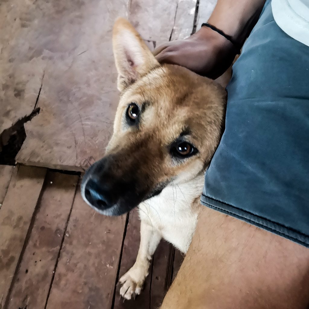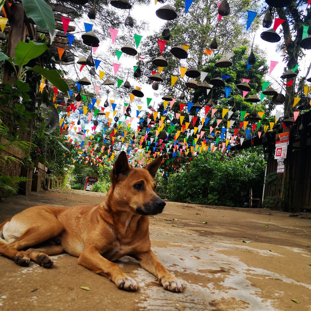 Es gibt eine Art „Haupt-Haus“. Es ist auch ein Bambushaus, überdacht, aber zu den Seiten offen. Es gibt einen großen Tisch und Baumstämme zum Sitzen. Daneben ist die Küche. Sie besteht aus einer Art kleinen Feuerstelle, eine richtige Ablage gibt es nicht. Geschnibbelt wird auf dem Boden auf einem Holzbrett. Fließendes Wasser gibt es nur über einen Hahn im Hof. Die anderen sitzen schon am Tisch. Wir stoßen dazu und bekommen erstmal eine Tasse Tee. Wir kommen mit dem einen französischen Pärchen ins Gespräch. Sie sind super nett und berichten, dass sie schon seit zwei Tagen hier sind. Die anderen haben sich quasi schon etwas eingelebt und wissen, wer hier wozu gehört. Sie erzählen uns auch, dass das andere französische Paar sehr gut mit Kindern kann. Das erklärt auch das überschwängliche und leidenschaftliche Entertainment mit den Kindern. Wir merken, dass unsere Stärken eher im Umgang mit den Tieren liegen. Eine Hündin hat es sich schon wieder neben uns bequem gemacht und lässt sich von uns kraulen.