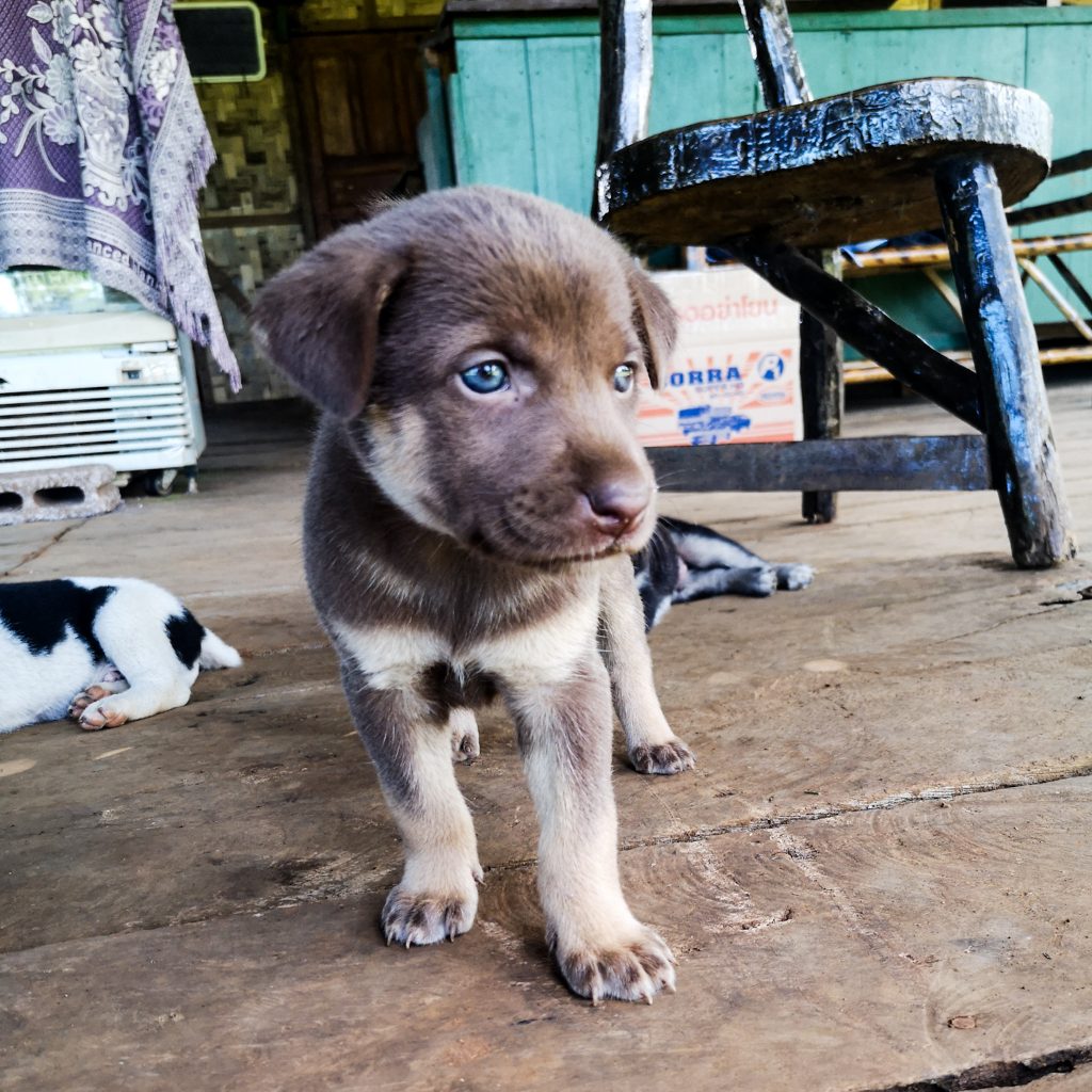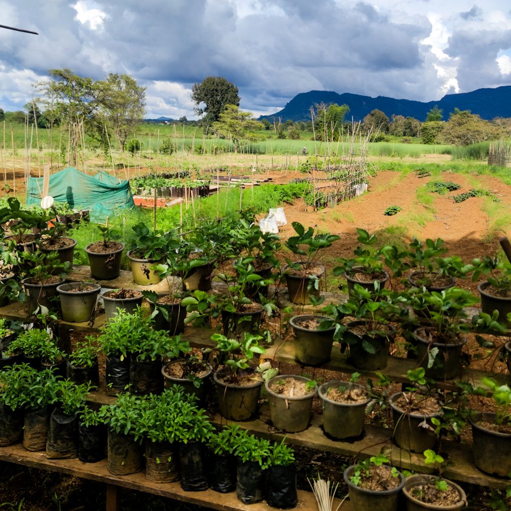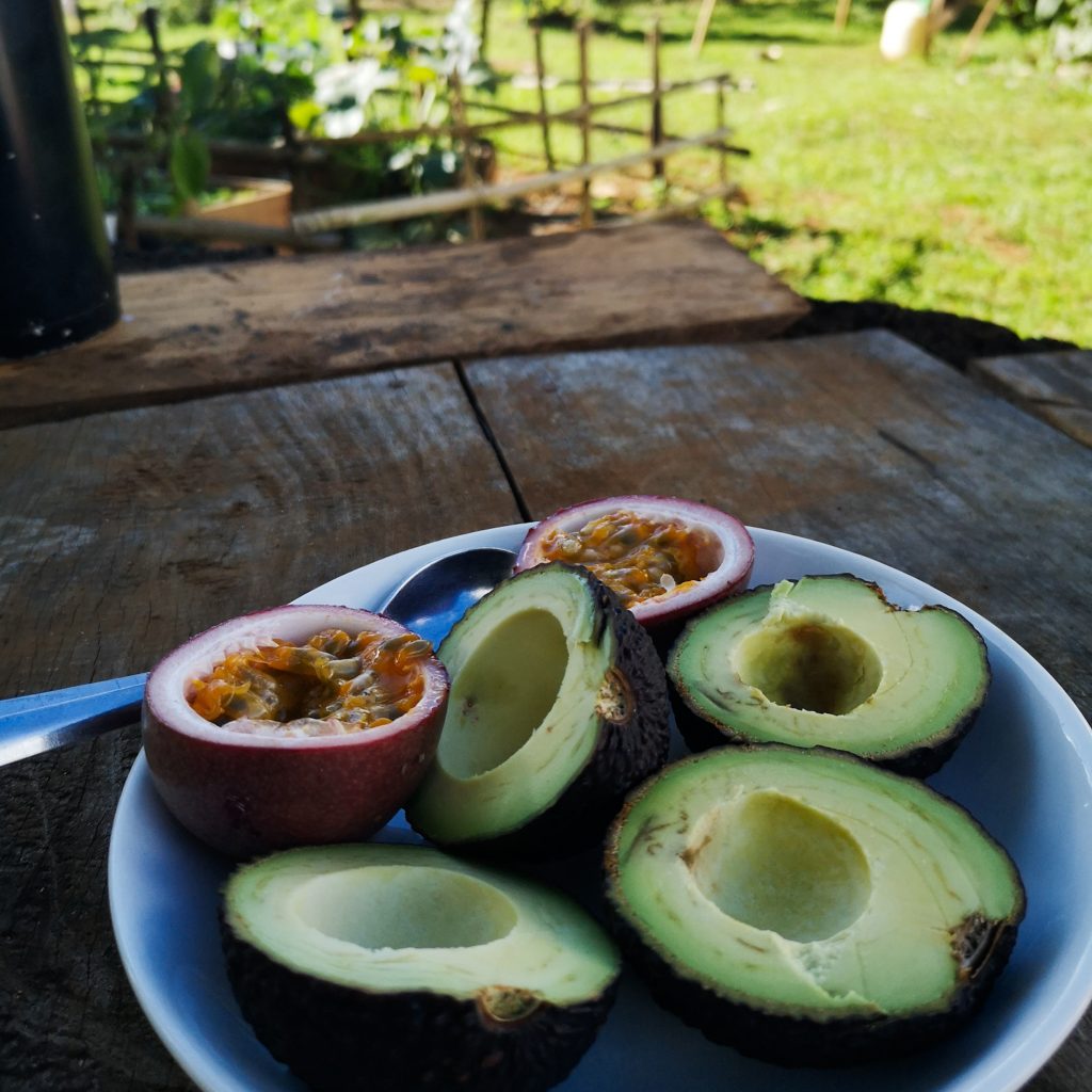 Nach mehr als 15 Minuten biegen wir zu einer kleinen Farm ab. Hier ist ansonsten weit und breit nichts anderes als Wiese und Natur zu sehen. Etwas zurückhaltend (mit dem Gedanken, wo wir hier wieder gelandet sind) stellen wir den Roller ab und schauen uns um. Eine ältere Dame sitzt auf dem Boden und topft kleine Pflanzen um. Sie lächelt uns an „Sabaidee!“. Dann kommt von weiter hinten ein junger Mann und begrüßt uns auf Englisch. Wir erklären ihm, dass Luang uns den Besuch hier empfohlen hat. Er sagt, wir sollen uns erstmal im den Garten setzen. Er verschwindet und kommt mit Zitronengras-Tee, Maracujas und Avocados zurück. Mit von der Partie ist ein ganz flauschiger, 3 Monate alter Welpe, später kommen auch noch zwei ganz kleine Katzenbabys dazu. Dann beginnt Nai zu erzählen. Er und seine Familie betreiben die kleine Farm und bauen hier jede Menge Obst und Gemüse an. Es sind immer nur kleine Mengen, aber dafür gibt es hier so viel Verschiedenes. Er gibt uns eine kleine Führung. Wir konnten uns nicht alles merken und mussten tatsächlich nach unserem Besuch ein paar Dinge mit Google Lens identifizieren: