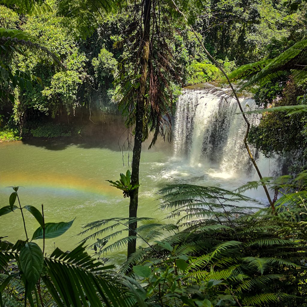 Am Häuschen vorbei gehen wir ein paar Schritte und schon von hier haben wir einen tollen Blick auf den Champee Wasserfall. Er ist auch ziemlich bewachsen und genau zum richtigen Zeitpunkt türmt sich ein Regenbogen vor uns auf. Wir gehen weiter den Weg entlang. Der Shortcut sieht schon von weitem gefährlich aus, weshalb wir uns für die längere Variante entscheiden. Unten angekommen, zeigt sich, dass wir die richtige Entscheidung getroffen haben. Der Shortcut existiert einfach nicht mehr. Wir entdecken nur noch Teile einer abgestürzten Treppe. Ebenso wie die Teile einer abgestürzten Brücke, die früher wohl Menschen trockenen Fußes auf die andere Seite des Flusses gebracht hat. Schade, von der anderen Seite hätten wir super ins Wasser gekonnt. So aber heißt es auch hier wieder – kein Schwimmen beim Wasserfall. Mal wieder haben wir das Gefühl, dass der Ort früher besser im Schuss war und mittlerweile etwas in die Jahre gekommen ist. Wir folgen dem Weg wieder nach oben. Ab zu den Welpen und der kalten Cola. Dem Champee Wasserfall verleihen wir die Gesamtnote 2. Früher war auch hier wahrscheinlich alles ein kleines bisschen besser. Schade, dass der Ort nicht etwas mehr in Schuss gehalten wird. Ein bisschen stellen wir uns die Frage, was genau eigentlich mit der (zugegebenen sehr günstigen) Ticketgebühr passiert. An sich ist der Wasserfall und besonders die Aussicht von oben sehr schön.