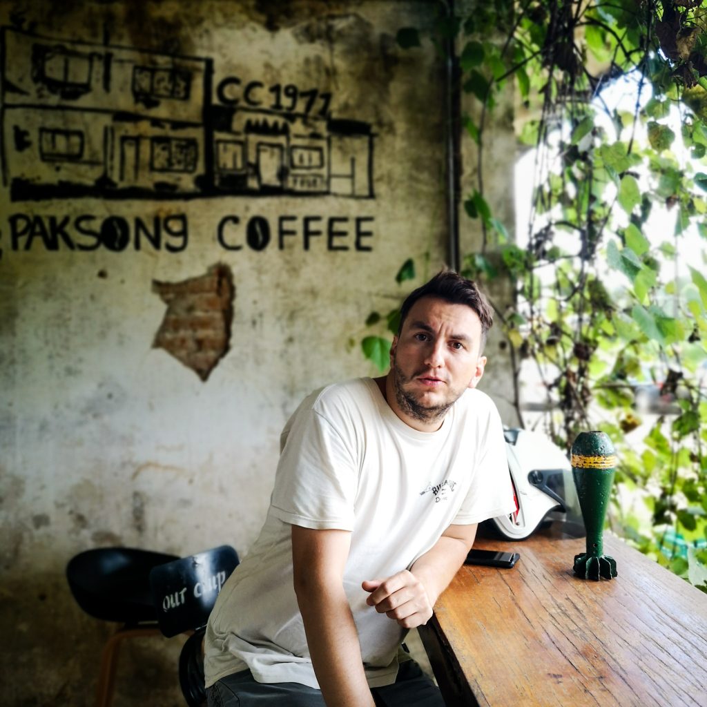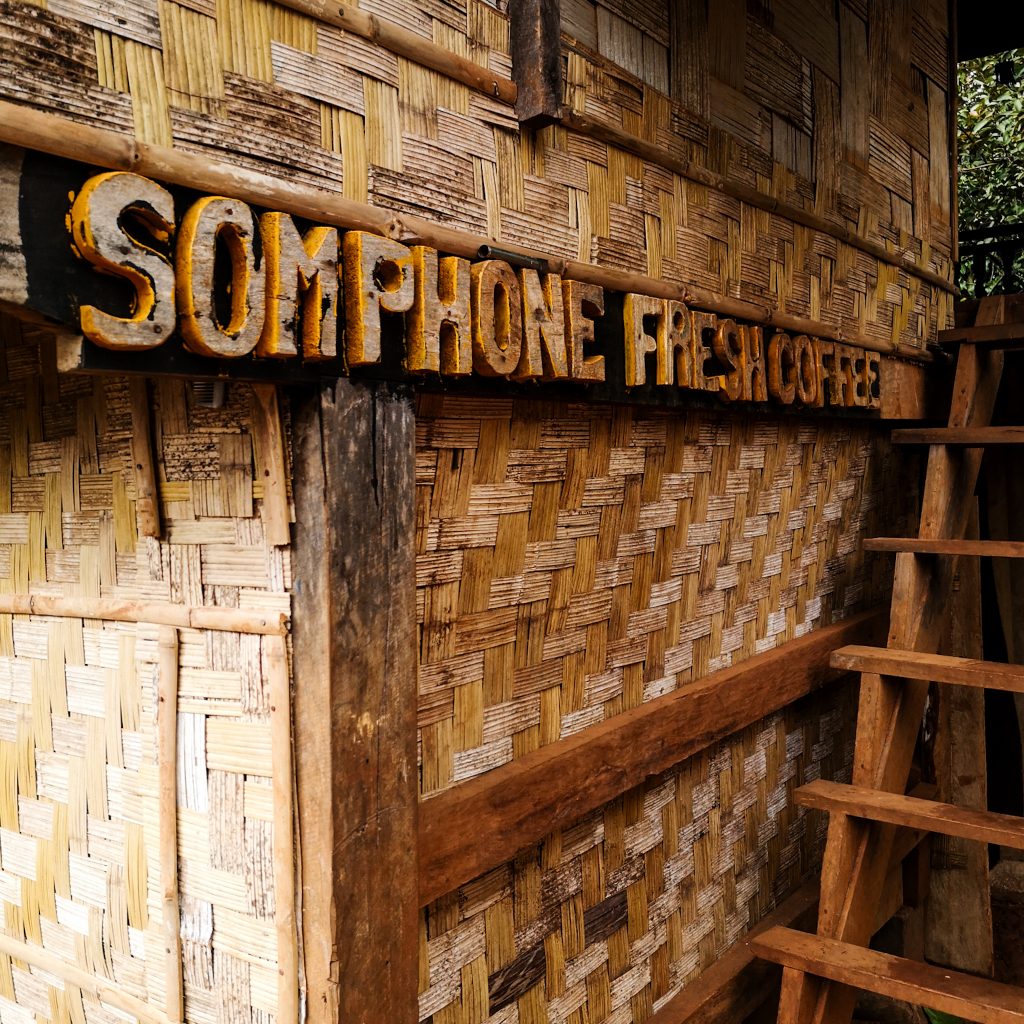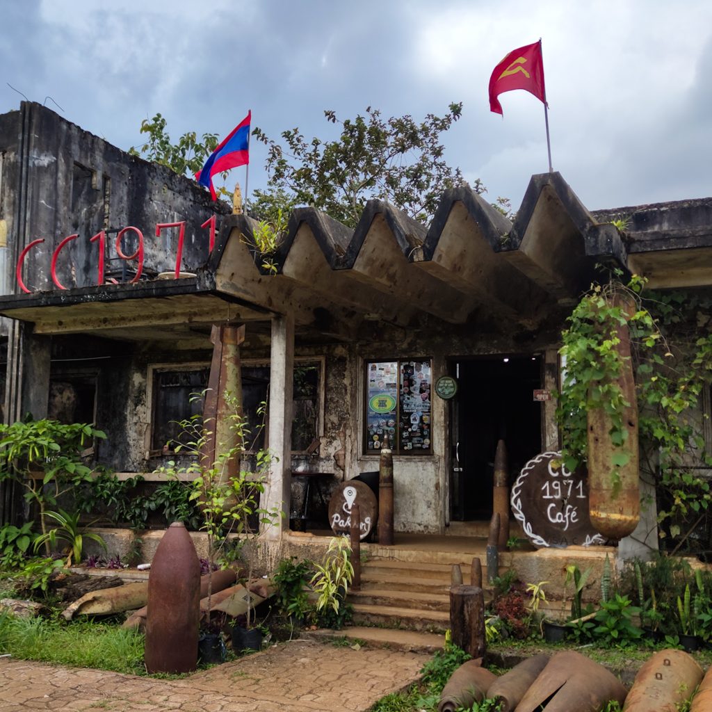 Langsam merken wir das frühe Aufstehen, da hilft nur noch ein Kaffee! Und wo könnte man besser Kaffee trinken, als mitten auf dem Bolavenplateau? Das in der Stadt Paksong gelegene CC 1971 Café serviert Kaffee, der von lokalen Kleinbauern im nachgebauten Skelett eines ausgebombten Gebäudes angebaut wird und dem Begriff „Atmosphäre“ eine neue Bedeutung verleiht. Die Fassade des Cafés ist noch im gleichen Zustand wie im Jahr 1971, außer dass Mörsergranaten, Bombenhülsen und Reste von Artillerie und abgeschossenen Jets als Dekoration verwendet werden. Eine coole und sehr modern interpretierte Lokalität inmitten einer kleinen laotischen Stadt (naja, vielleicht auch eher großes Dorf). Irgendwie verrückt. Der Cappuccino schmeckt jedenfalls sehr gut und gestärkt machen wir uns auf die Fahrt zum nächsten Stopp.