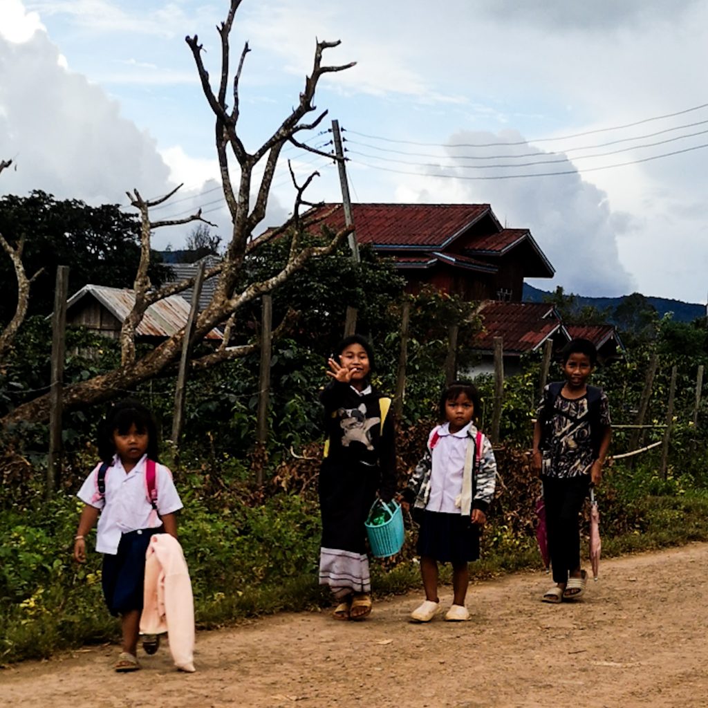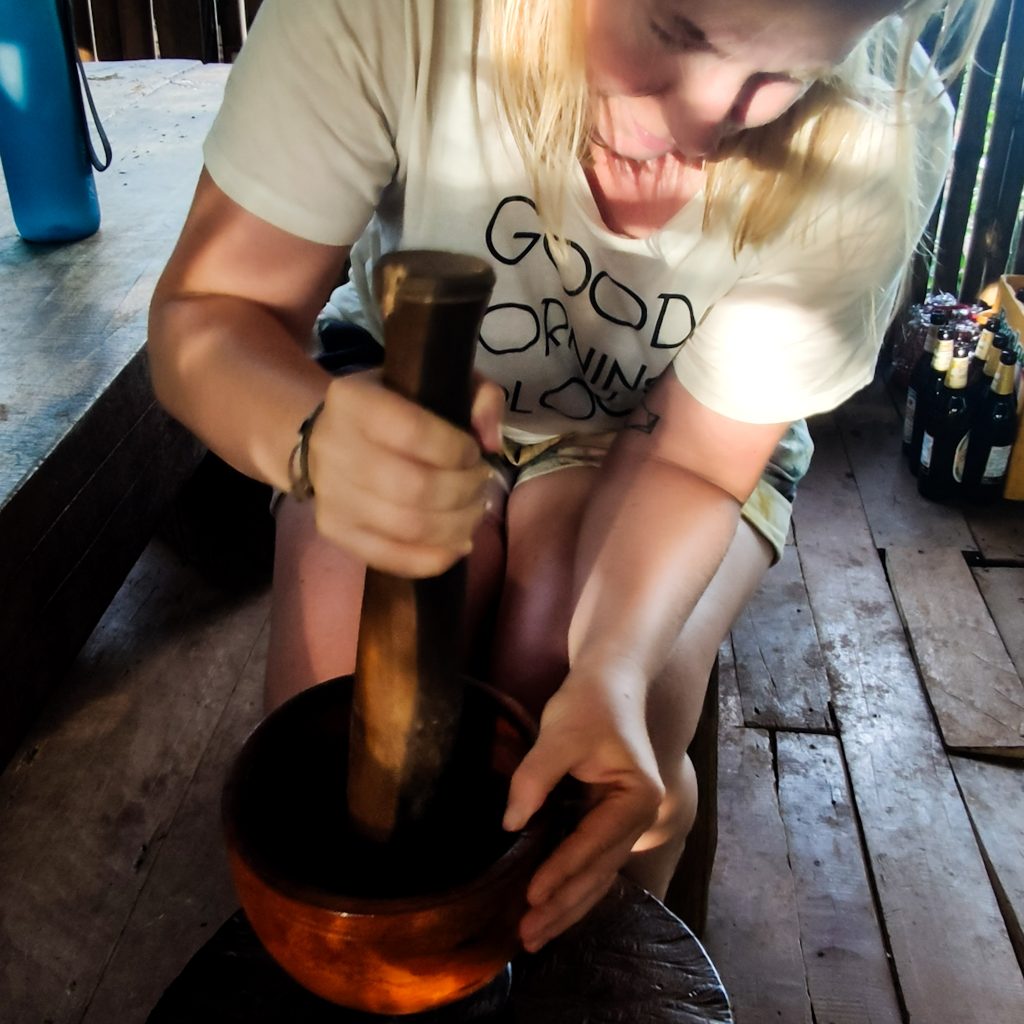 Eigentlich wollen wir früh aufstehen und uns zeitig auf den Weg machen. Wir sind auch früh wach, aber der Morgen zieht sich in die Länge. Caro braucht unbedingt eine Dusche und testet die „selfmade“ Dusche. Som ist noch unterwegs und die größeren Kinder müssen um 8 Uhr zur Schule. Dak kümmert sich also gerade um alles gleichzeitig. Wir fragen, ob wir helfen können und werden mit Mörser und Kaffeebohnen ausgestattet. Erstmal Kaffee machen.