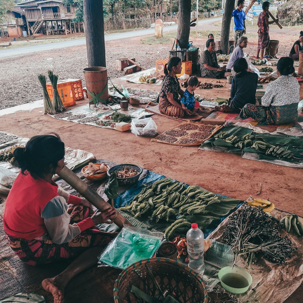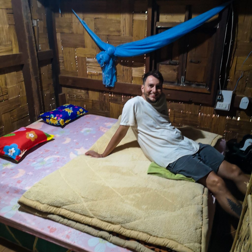 Echt laotisch. Unser Zimmer ist in einem typisch laotischem Bambushaus. Im ersten Stock, über dem Rollerstellplatz, der widerum direkt neben dem Schlafplatz der Familie ist, damit nachts keiner die Roller der Gäste klaut. Im Zimmer gibt es eine Matratze und Licht, thats it. Wir ruhen uns einen Moment aus und kommen erstmal an. Draußen hören wir wieder lautstark die Kinder toben und spielen. Irgendwann raffen wir uns auf und gesellen uns zu den anderen.