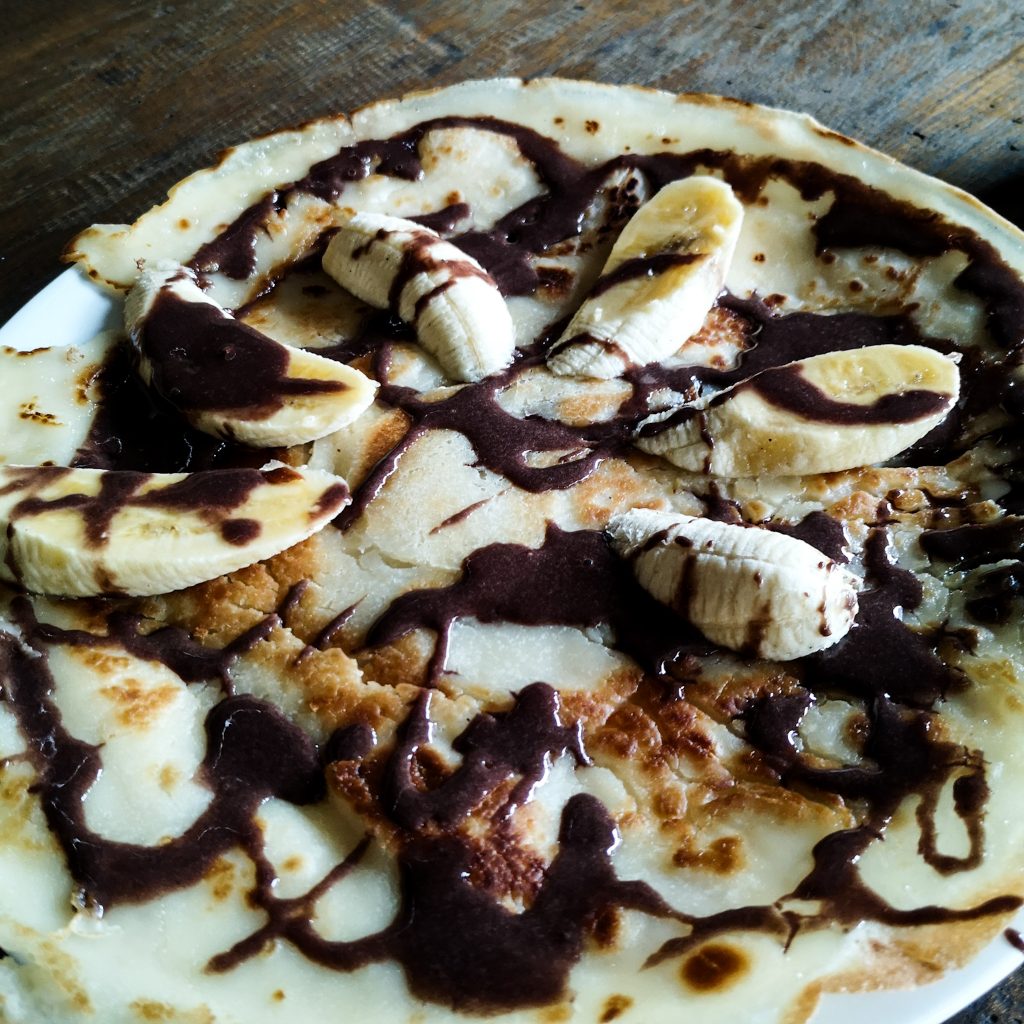 Wir gehen zurück zu Mama Pap und bestellen einen Pfannkuchen sowie zwei Kaffee. Wir sitzen unter dem Vordach und sind die einzigen Gäste. Dennoch dauert es ganz schön lange, bis der Kaffee kommt. Noch viel länger, bis der Pfannkuchen fertig ist. Wir gehen zu Caros Bedauern schon davon aus, dass sie den Pfannkuchen vergessen hat, da kommt er doch noch. Er ist tatsächlich riesig und er schmeckt hervorragend.