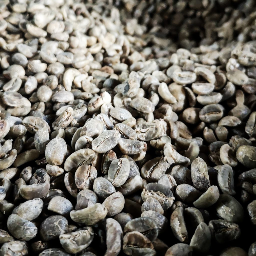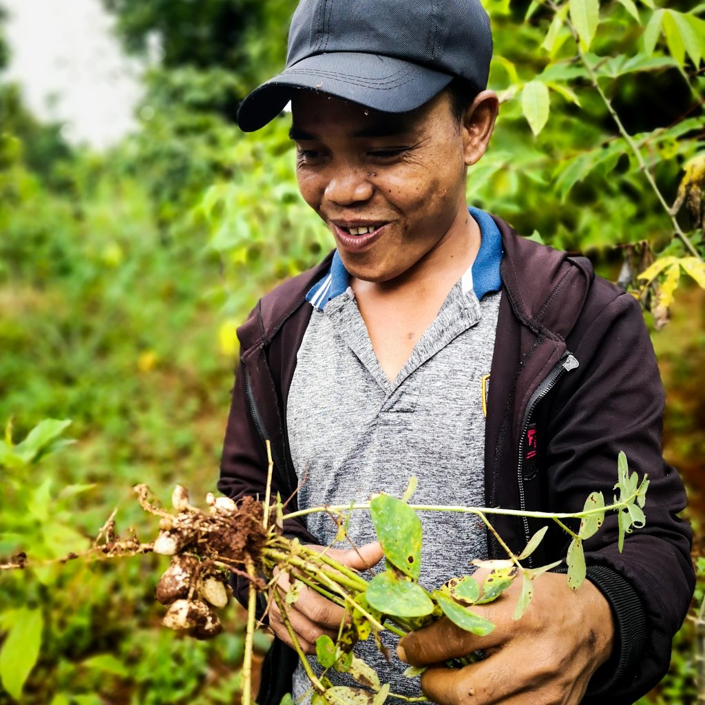 Der Regen ist fast komplett vorbei und wir bekommen nur noch ein paar Tropfen ab. Mr. Vieng, sein Name ist uns schon beinder Recherche über den Weg gelaufen und auch Luang hat uns ans Herz gelegt, hier einen Stopp einzulegen. Wir parken den Roller und sehen ihn mit drei Mädels in seinem Café sitzen. Mr. Vieng baut Kaffee, Maniok und Erdnüsse an. Er wollte den zwei Französinnen und einer Deutschen gerade eine Führung geben, wir schließen uns direkt an. Er baut sowohl Robusta, Arabica als auch Liberica Kaffeebohnen an. Im Gegensatz zu vielen anderen Bauern hat er seine eigene Röstungsmaschine. Früher hat er die Bohnen noch von Hand und über dem Feuer geröstet. Durch die Maschine ist das Ergebnis natürlich wesentlich besser steuerbar, die Temperatur ist konstanter und natürlich kann er auch größere Mengen auf einmal rösten. Sein Ertrag vertreibt er ausschließlich in seinem Café an Tourist:innen.