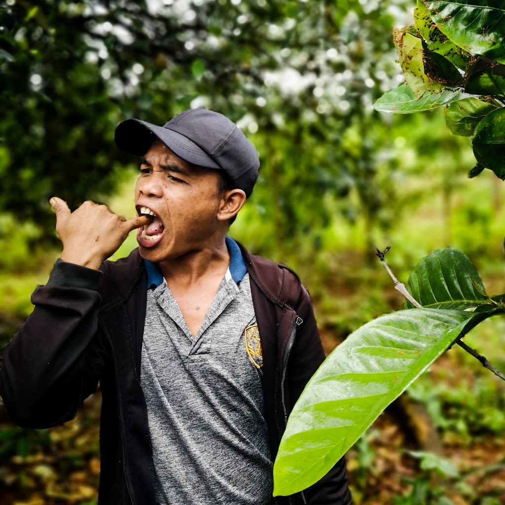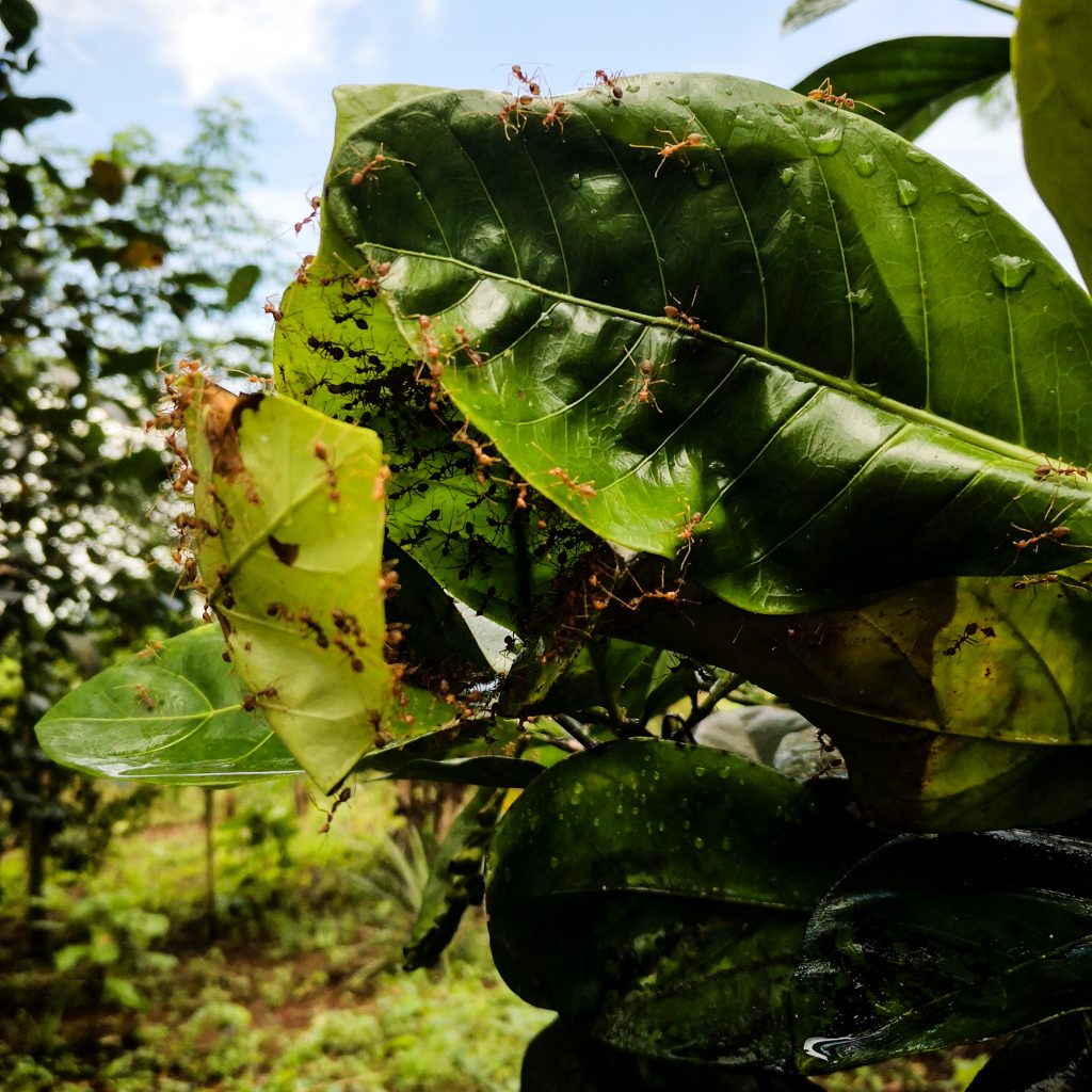 Er baut den Kaffee ohne den Einsatz von Pflanzenschutzmittel an, mal wieder alles bio. Er führt uns durch die Plantage, zeigt uns die unterschiedlichen Sorten und zeigt uns auch, was weniger gut für die Pflanzen ist: Ameisen. Sie bauen ihre Nester in die Blätter der Kaffeepflanze und schaden damit der Pflanze und den Kaffeebohnen. Was Mr. Vieng dagegen macht? Er gönnt sich vor unseren Augen erstmal eine ordentliche Portion lebender Ameisen. Angeblich besonders gut bei Kater und reich an Vitamin C. Wer möchte, kann sich selbst vom Geschmack nach Zitrus überzeugen. Uns reicht schon der beißende Geruch nach Essig, wir lehnen dankend ab. Schließlich sind ja auch Ameisen Tiere.
