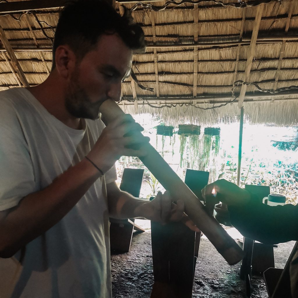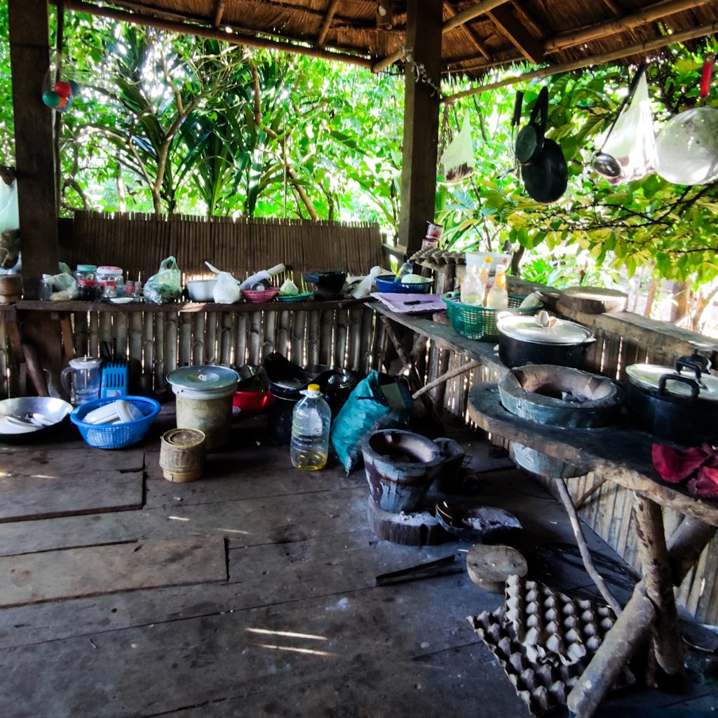 Nachdem wir die Bohnen gemörsert haben, kommt alles in die French Press und dann auf die Glut. Zum Frühstück gibt es Pfannkuchen. Nach und nach taucht auch die französische Delegation auf. Wir unterhalten uns sehr nett mit einer der älteren Damen. Sie hat bereits als Lehrerin in Französisch-Guayana gearbeitet und viel von der Welt gesehen. Wirklich super interessant. Dann taucht irgendwann Som auf. Er bringt Nudelsuppe mit. Das Frühstück der Locals. Einfach eine Tütensuppe, verfeinert mit ein bisschen Gemüse und getoppt mit einem Spiegelei. Auch sehr lecker. Ja und dann verquatschen wir uns wieder ein bisschen. Som erzählt uns von Schlangen: Bambusschlangen, Königskobras und von einer Art Nuss oder Frucht, die bei einem Biss hilft.