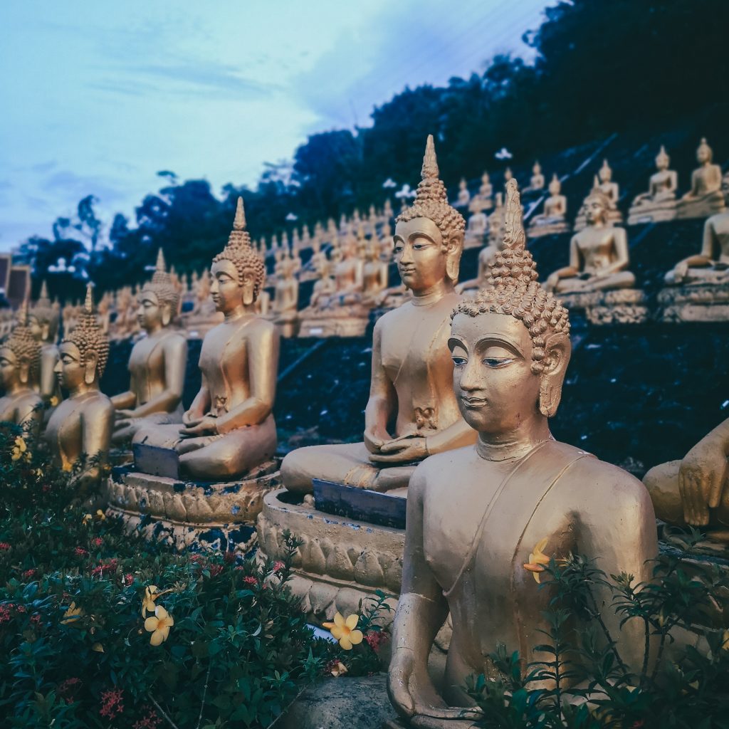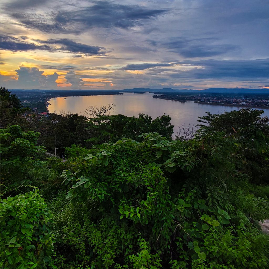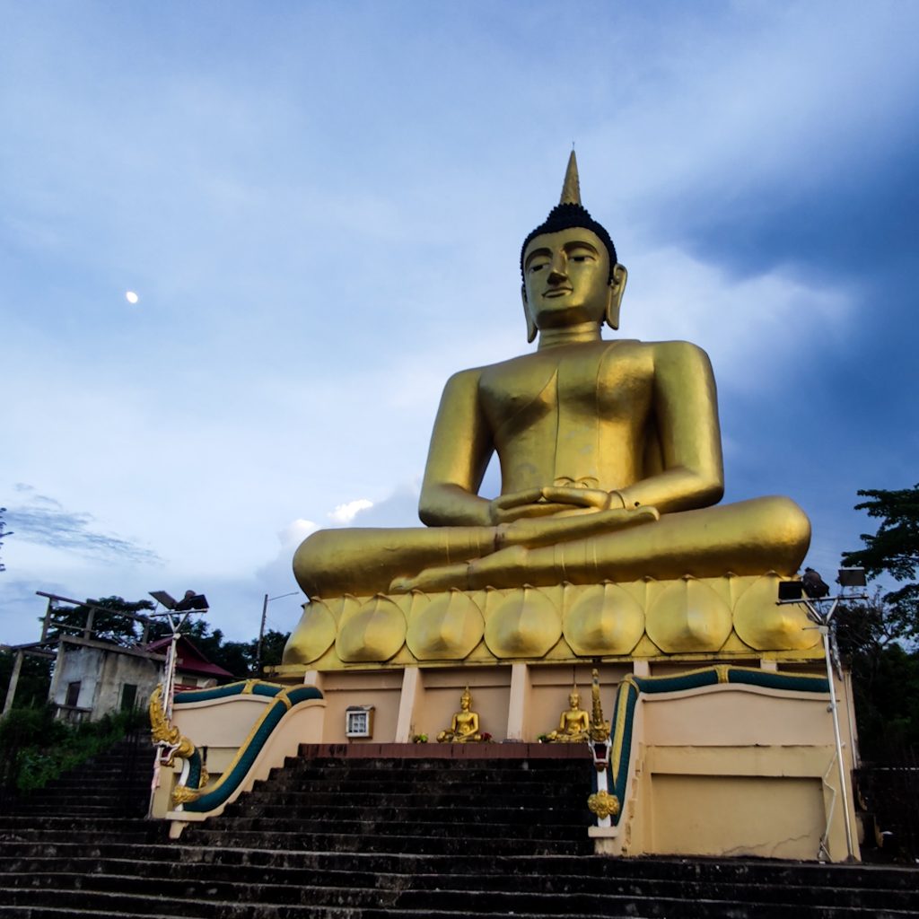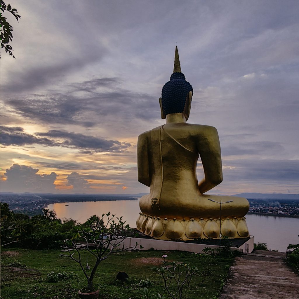 Wir fahren durch Pakse, über den Mekong und hinauf auf den Berg. Dort thront die riesige Buddha Statue mit dem besten Blick auf die Stadt. Das Timing ist perfekt und unserem Dreier-Date steht nichts mehr im Weg. Zu dritt genießen wir die wunderschöne Aussicht auf die Stadt. Hinter der Statue sind noch viele weitere Figuren, die ebenfalls ein schönes Fotomotiv sind.