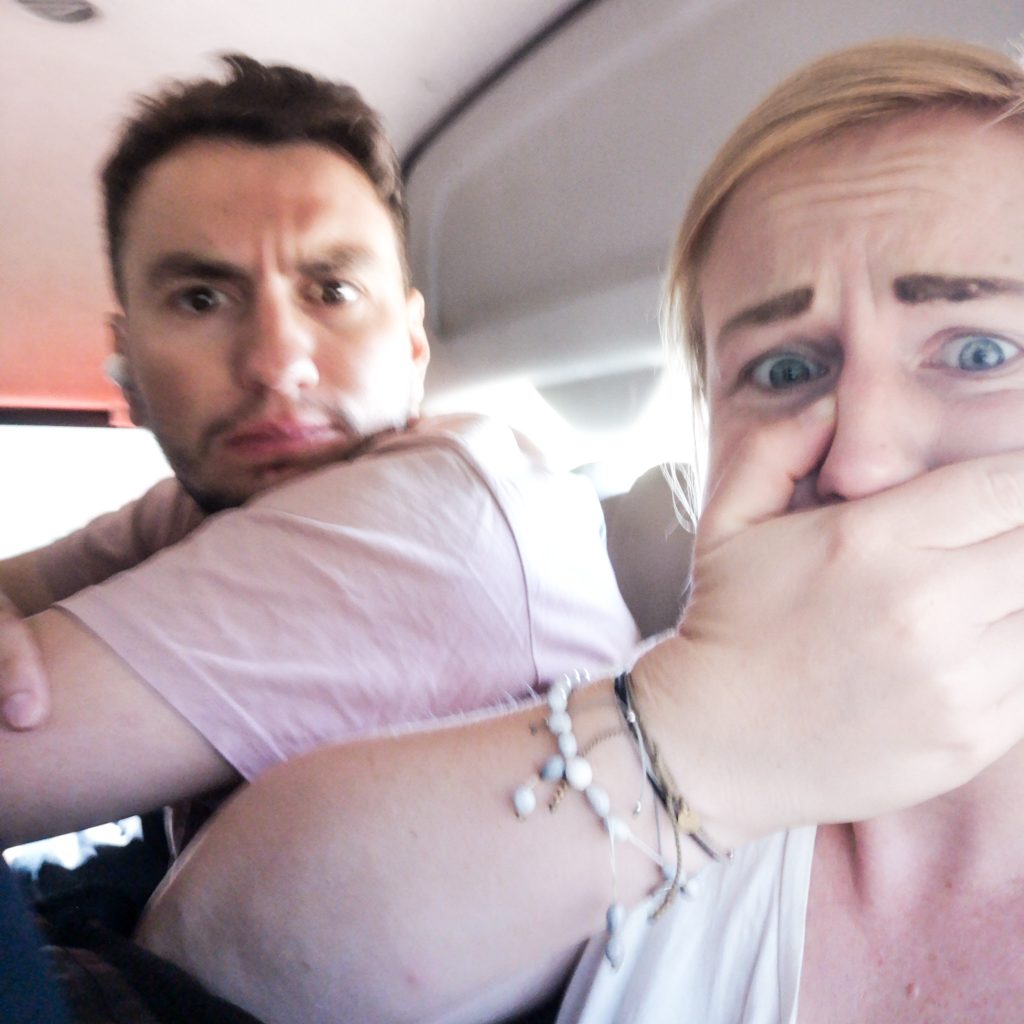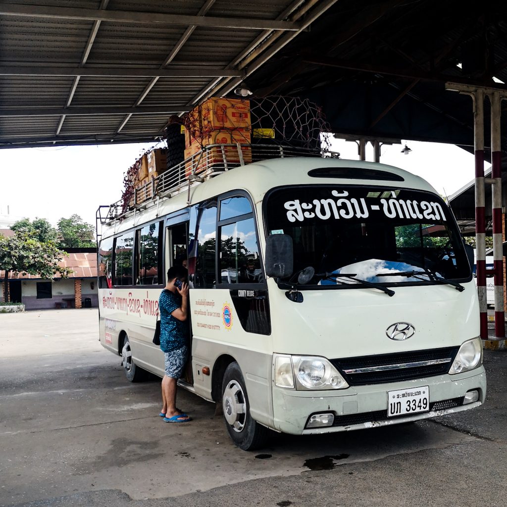 Wir stehen früh auf, denn wir werden um 7.30 Uhr abgeholt. Luang fragt uns, ob wir schon eine Unterkunft für Thakhek, also für heute Abend haben – natürlich nicht. Irgendwie hatten wir gestern keine Motivation mehr, etwas zu buchen. Sie empfiehlt uns das Hostel eines Freundes und bietet an, uns das Zimmer zu reservieren. Wir kommen uns langsam vor wie im Cluburlaub – klar gerne. Bisher waren all ihre Tipps immer super. Wir begleichen noch unsere Schulden und steigen pünktlich im den Van ein. Noch können wir uns zu zweit im der letzten Reihe ausbreiten. Das ändert sich aber recht schnell, der Van wird proppevoll und wir sitzen gequetscht im der hinteren Ecke. Die Blase macht sich nach dem Frühstückstee schnell bemerkbar, vor allem da wir mit einem Affenzahn über eine sehr sehr schlechte Straße rasen.