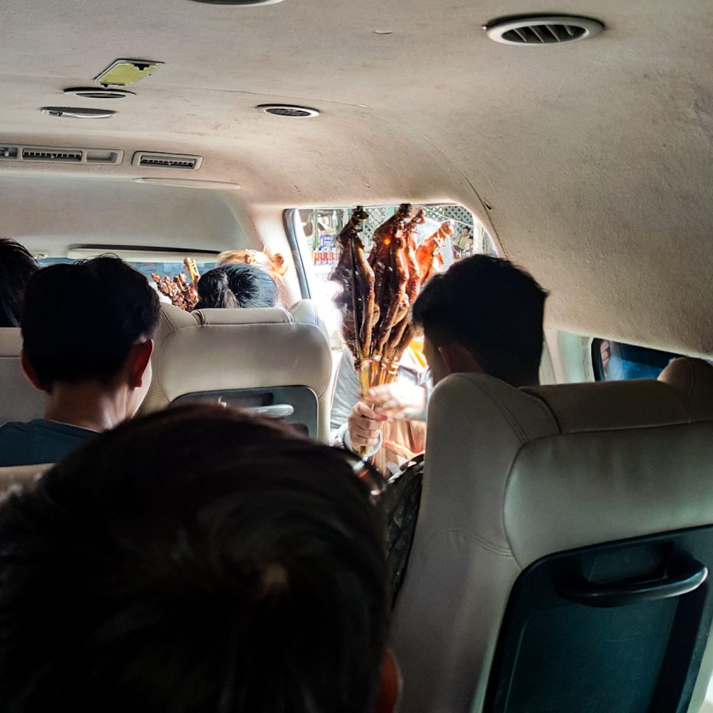Zwischendurch halten wir ab und zu kurz an, aber statt einer dringend benötigen Pipipause, wird mal kurz getankt oder ein paar Verkäufer:innen versuchen ihre gegrillten Hühner/Enten an den Mann oder die Frau zu bringen.