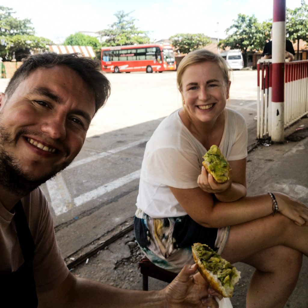Die Fahrt dauert ca. 4 Stunden und wir sind sehr froh, als wir an unserem Zwischenhalt ankommen. Hier gibt’s immerhin eine Toilette. Jetzt müssen wir den Bus einmal wechseln und auf unbestimmte Zeit auf die Weiterfahrt warten. Bei einem der kleinen Shops kaufen wir uns kleine (und leider schon harte) Baguettes, die wir mit unseren Avocados verfeinern. Als der Busfahrer sieht, dass wir uns auf die Treppen des Busses setzen, stellt er uns zwei kleine Hocker raus, wie nett! So sitzen wir da nun, essen unsere Avocado-Brote und beobachten die drei Ziegen, die auf dem Dach des Busses neben den Kisten und Kartons stehen als wäre es das Normalste der Welt… Wobei, irgendwie ist es das inzwischen auf für uns. Zumindest so normal, dass wir nicht sofort aufstehen und Fotos davon machen.
