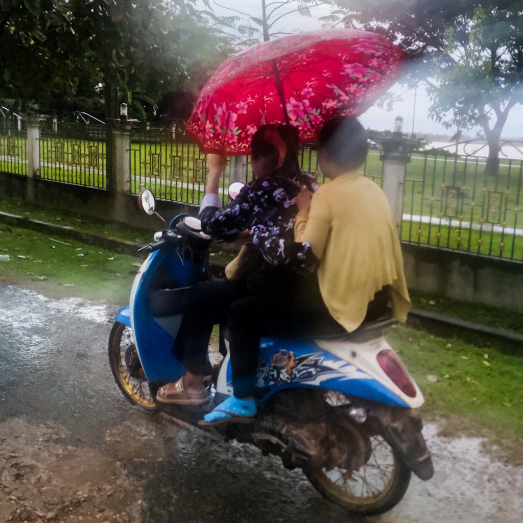 Irgendwann fängt es wieder an, zu regnen. Aber nicht ein bisschen wie eben, sondern so richtig. Man könnte fast sagen: Wir haben norddeutsches Herbstwetter, nur halt 20 Grad wärmer dabei. Mit dem Helmvisier sieht Konsti nichts, ohne auch nicht. Die Regentropfen peitschen ihm ins Gesicht. Gut, dass es nicht mehr weit ist. Den Abstecher zur Buddha-Statue haben wir schon längst abgeschrieben. Caros Aufgabe ist die Navigation. Auch das gestaltet sich schwierig, unter dem heruntergeklappten Visier schützt sie das Handy vor dem Regen und versucht Konsti die Abbiegungen anzusagen.