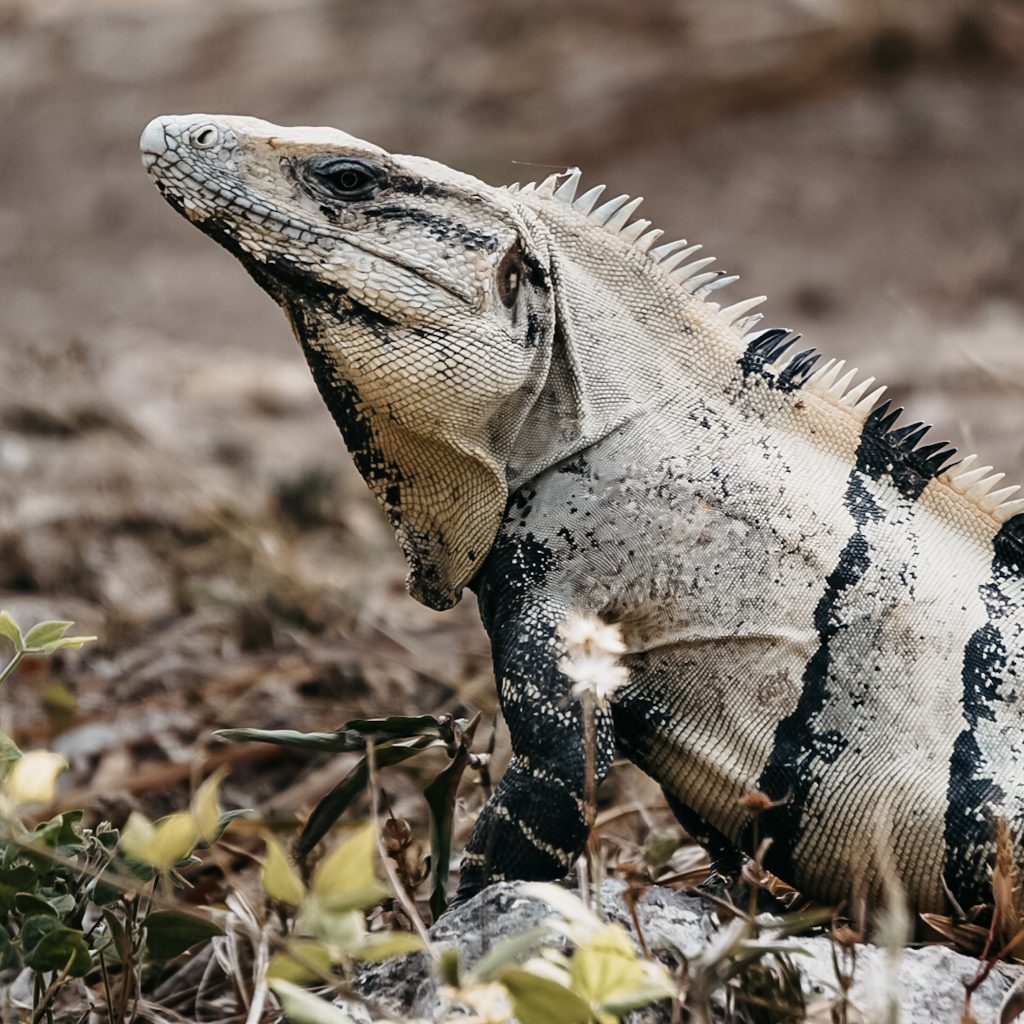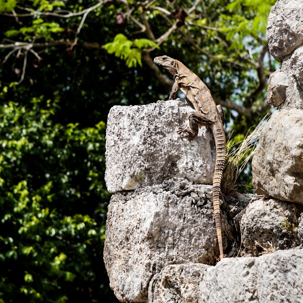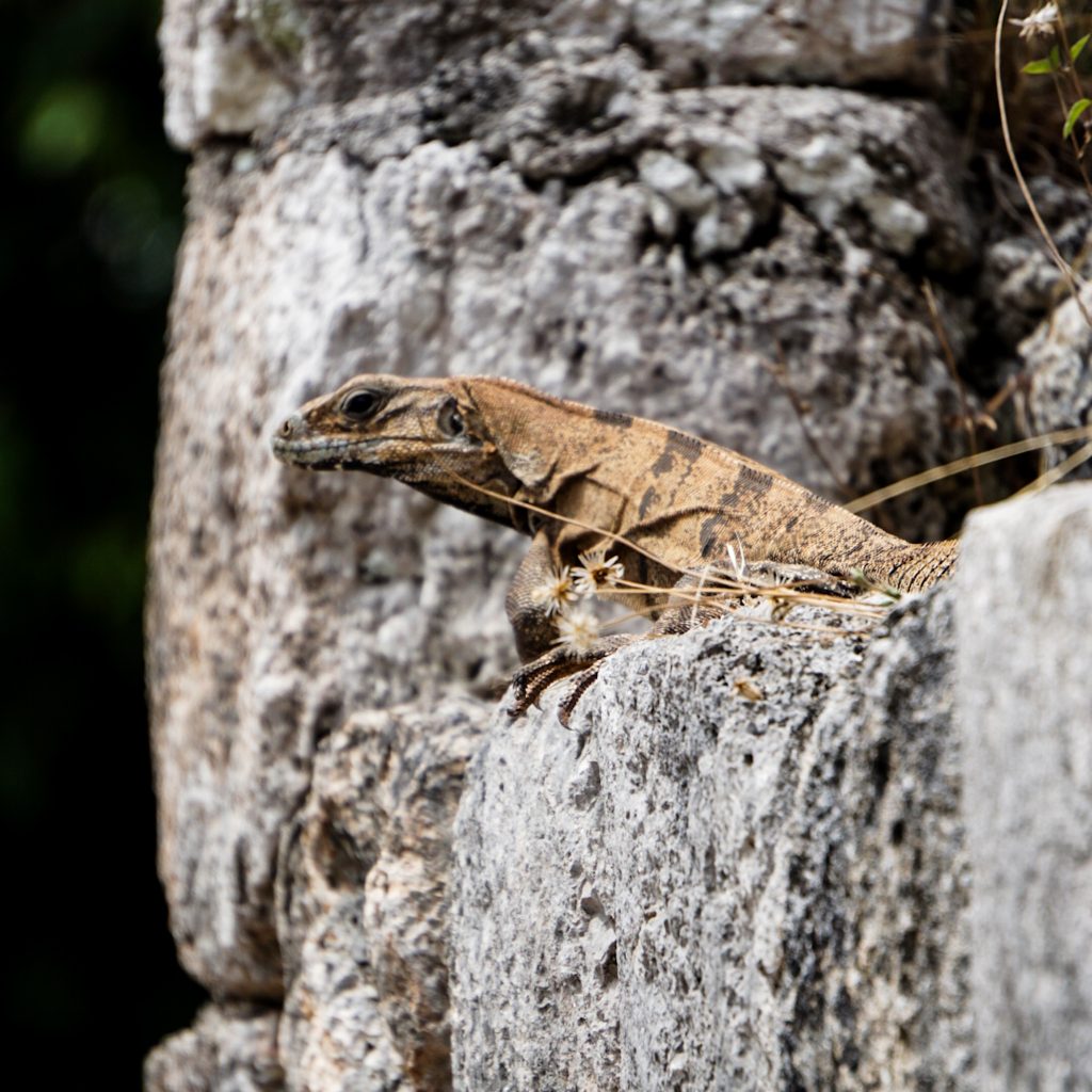 An der Kasse sind wir kurz geschockt, nur Barzahlung? Wir haben knapp kalkuliert, sehr knapp. Wir sind im Grunde davon ausgegangen, dass wir hier einfach mit Karte zahlen können. Hinzu kommt, dass die Preise im Internet nicht ganz aktuell waren. Wir zählen alles nochmal durch. Bis auf den letzten Peso sollte alles klappen, vorausgesetzt wir zahlen für die Rückfahrt auch max. 70 Pesos und finden genug Mitfahrende. Dann hätten wir übrigens nicht mal Geld für noch eine Flasche Wasser. Typisch. Wie oft ist uns das jetzt schon passiert? Aber dann folgt eine erleichternde Meldung. An der anderen Kasse können wir doch mit Karte zahlen. Zumindest den größten Teil. Den Rest müssen wir bar zahlen. Glück gehabt. Wir erstehen die Tickets und machen uns dann ohne Guide auf den Weg in den Park. Konsti liest uns wieder aus einem Online-Guide ein paar Fakten zu den einzelnen Ruinen durch. Viele Infos gibt es allerdings nicht. Trotzdem ist es ganz cool hier. Wir entdecken richtig viele Echsen und Konsti zückt begeistert die Kamera.
