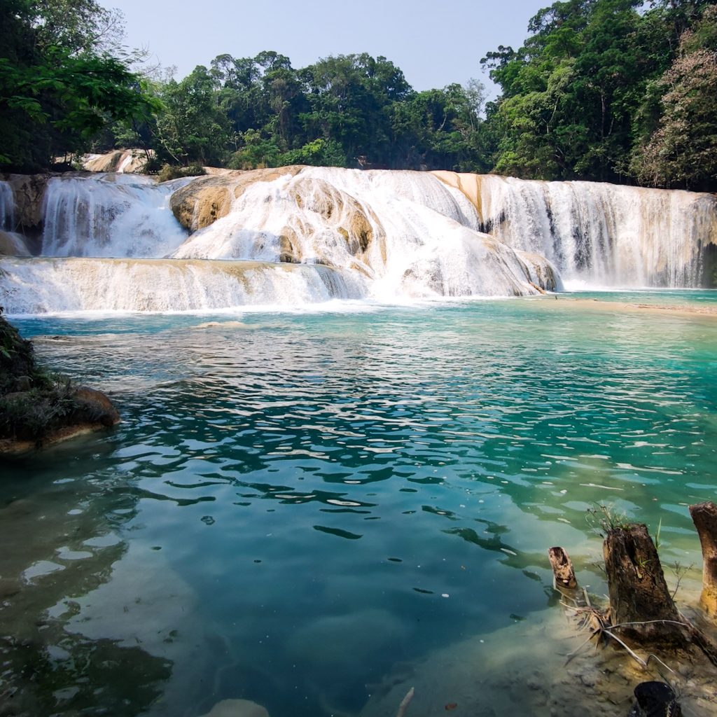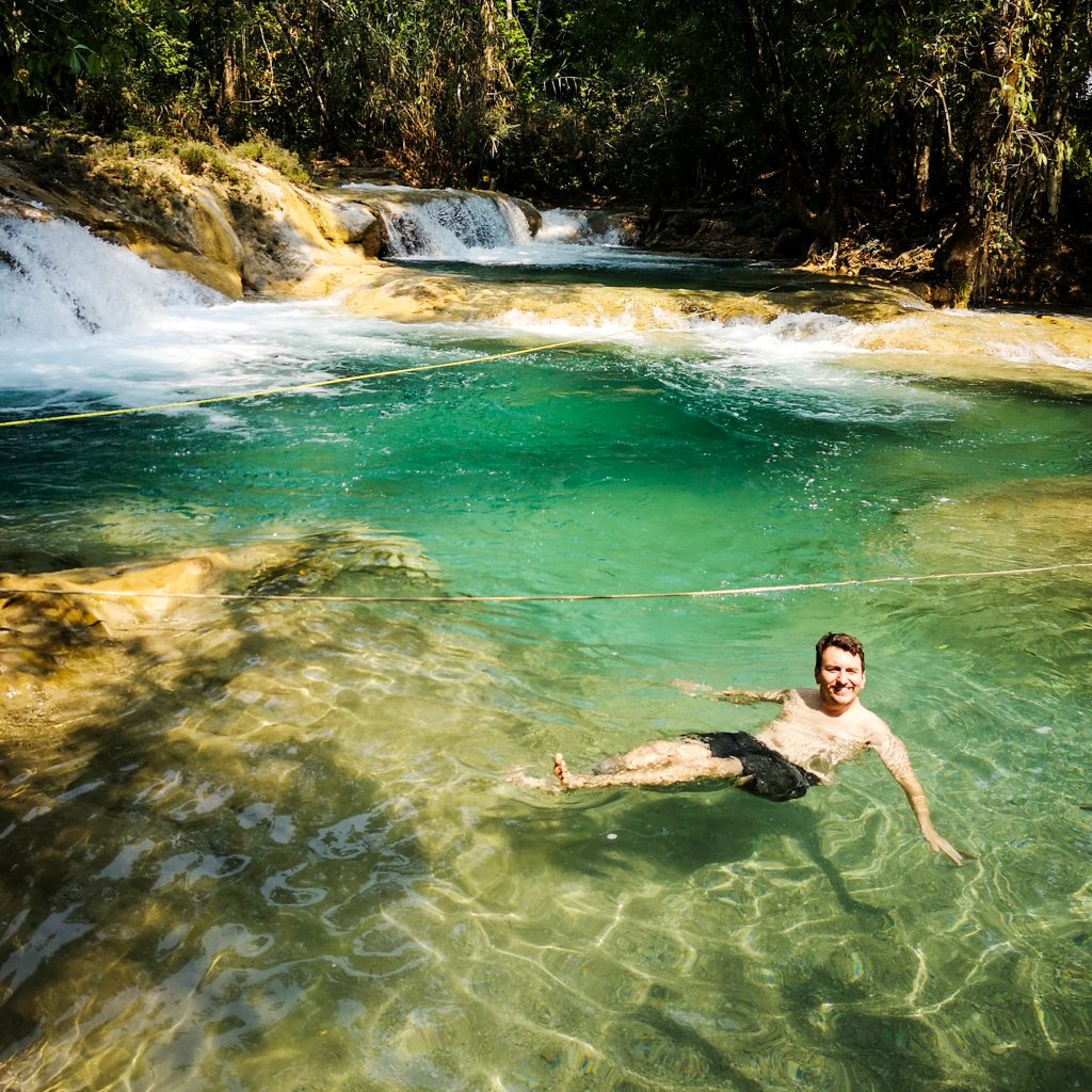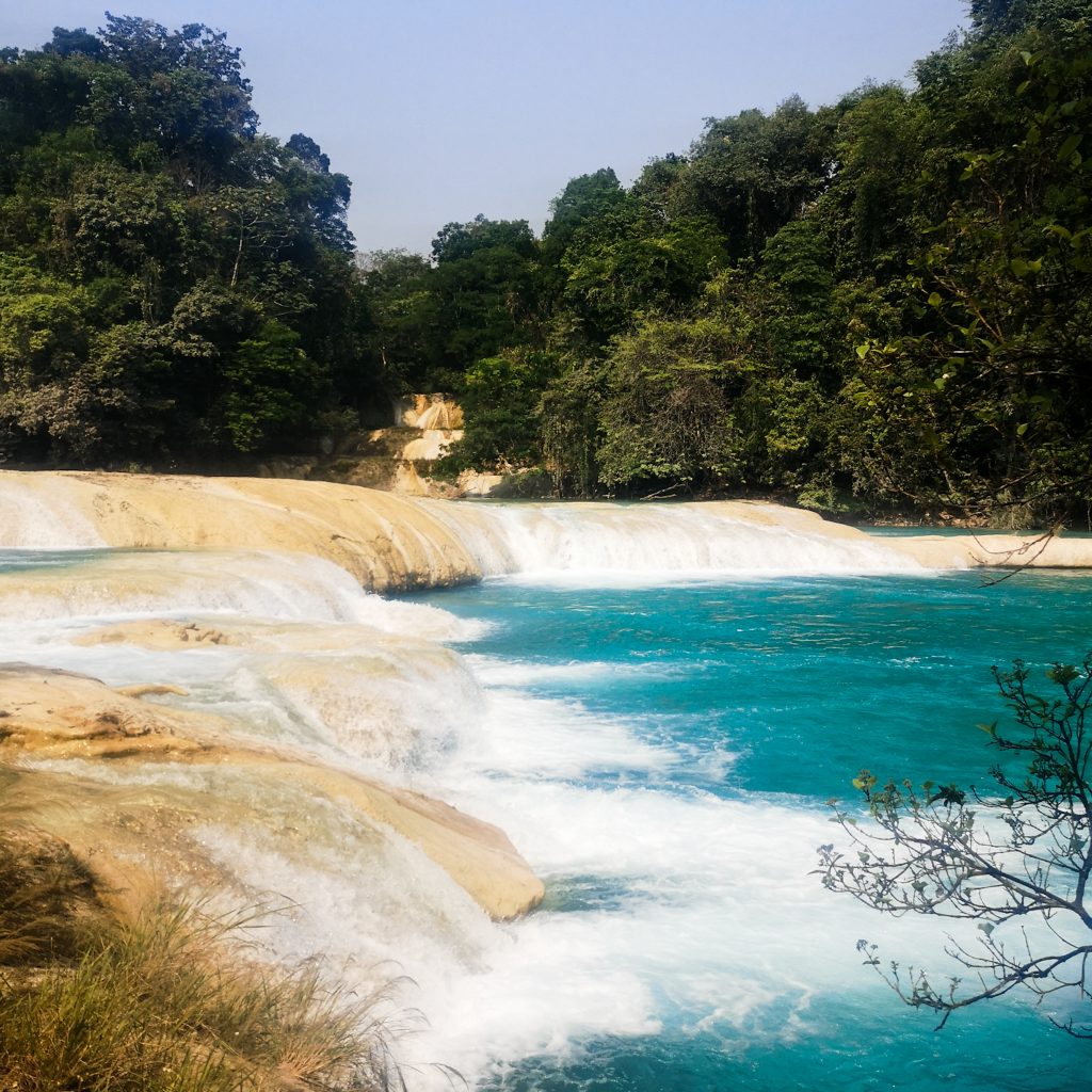 Das Wasser und die großen Kaskaden sind tatsächlich blau. Blau-türkis leuchtet das Wasser. Wir laufen entlang der Kaskaden und es kommen immer wieder Wasserfälle und Stellen zum Baden. Entlang des Weges tummeln sich zahlreiche Verkäufer. Junge Mädchen verkaufen Bananenchips und Bananen. Der anfängliche Preis von 40 Pesos sinkt schnell auf 10 Pesos, ohne dass wir überhaupt Interesse zeigen oder versuchen, zu handeln. Die Kaskaden sind wirklich schön.