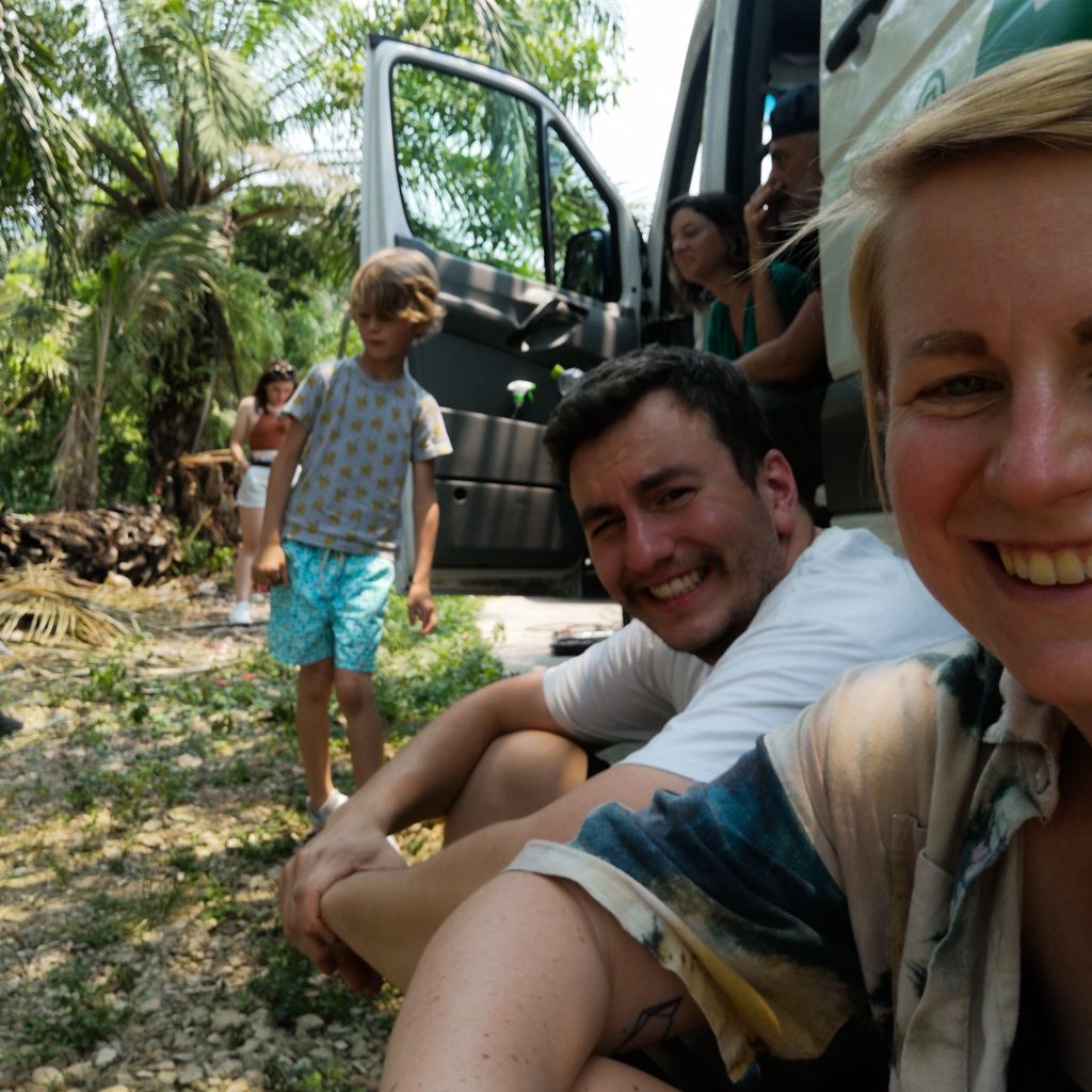 Alle sind recht entspannt, selbst die beiden Kinder beschäftigen sich mit ihrem Nintendo. Glücklicherweise sind wir in einem mini kleinen Dorf gestrandet. So können wir uns zumindest am Dorfladen ein kaltes Wasser holen und uns in den Schatten der Palmen setzen. Der Fahrer freut sich, dass wir ihm auch ein Wasser mitbringen. Caro fühlt vielleicht ein bisschen zu sehr die Situation des Fahrers und möchte ihm das Gefühl geben, dass er ja nichts dafür kann und wir die Lage entspannt sehen. Wahrscheinlich macht er sich darüber aber ohne keinerlei Gedanken und will einfach nur selbst endlich wieder in das Auto mit der Klimaanlage einsteigen. Nach einer guten Stunde scheint es dann weiter zu gehen. Ab jetzt aber leider ohne Klimaanlage. Kein Problem, es ist ja nur minimal heiß. Auf der anderen Seite sind wir sowieso schon nass geschwitzt und im erster Linie froh, dass es überhaupt weitergeht.