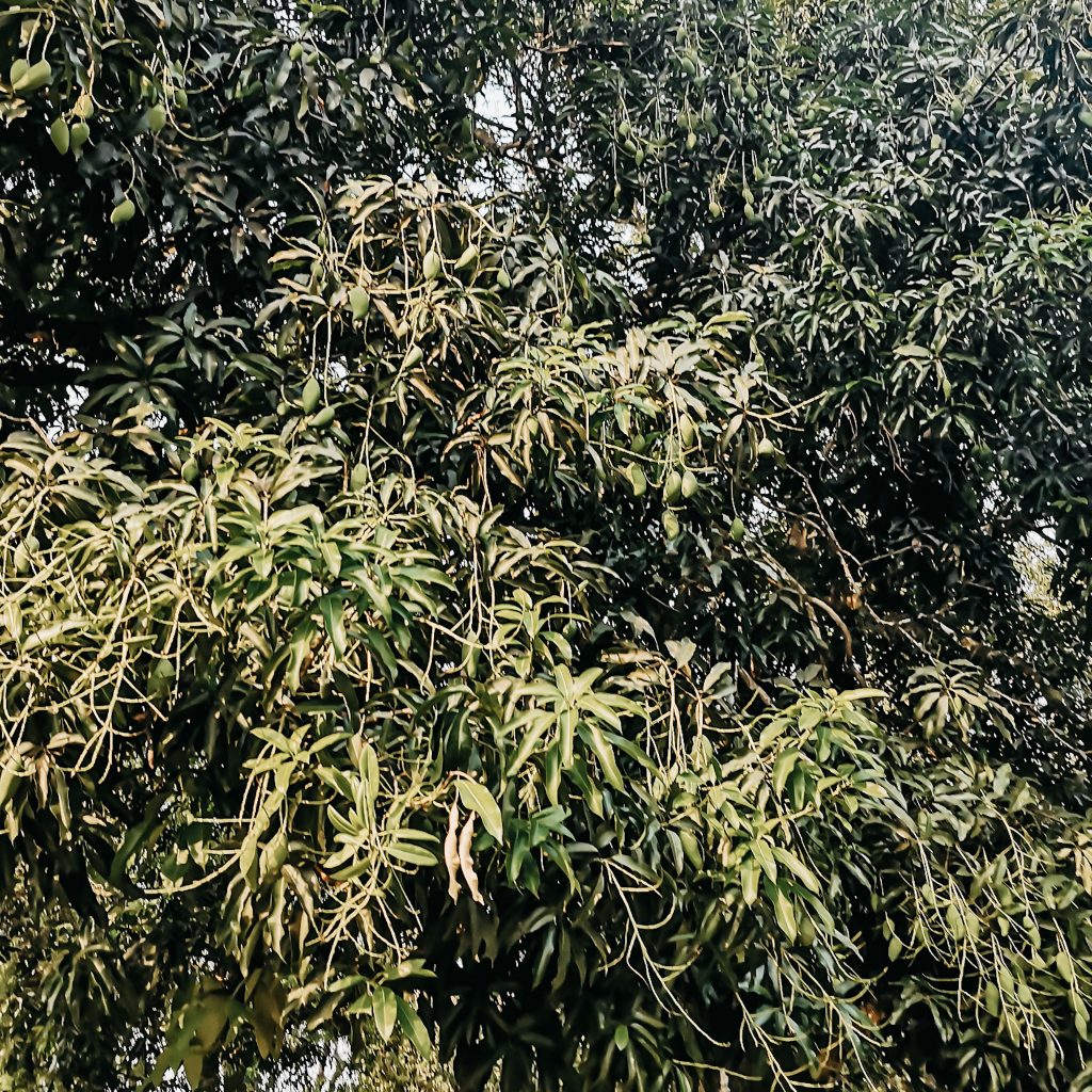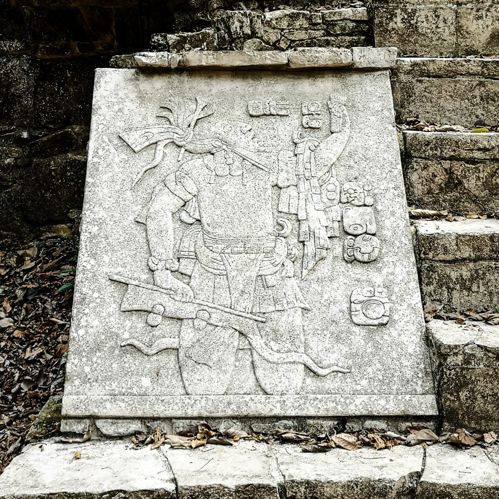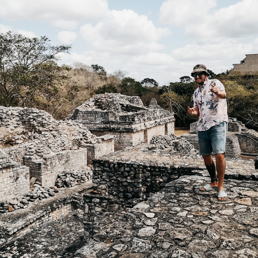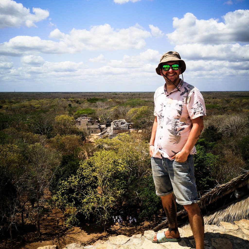 Wir sind offensichtlich spät dran als wir losziehen, denn im Park ist fast nichts mehr los und selbst die Verkäufer:innen packen schon ihre Sachen zusammen. Das ist unser größtes Glück am heutigen Tag. Die Sonne macht sich langsam auf den Weg Richtung Sonnenuntergang und die Ruinen werden in orangefarbenes, warmes Licht getaucht. Wir sind fast alleine auf dem Gelände und von den Touri-Gruppen am Tag ist nicht mehr viel zu sehen. Die Mayastätte liegt mitten im Dschungel, um uns herum sind große Bäume, dichte Wälder und eine entsprechende Geräuschkulisse. Richtig schön. Wir laufen ein bisschen über das Gelände und schauen uns die verschiedenen Tempel und Grabstätten an. Auf einen großen Tempel darf man sogar hinaufklettern. Selbst jetzt, wo die Sonne nicht mehr von oben knallt, ist es wahnsinnig anstrengend die hohen Stufen zu erklimmen. Wir treffen Luisa und Ricardo wieder, sie haben sich für die Tour mit Guide entschieden, sind aber bisher nicht sonderlich begeistert. Die Tour ist auf Spanisch und obwohl Luisa etwas Spanisch kann, verstehen die beiden leider nicht so viel. Wir ziehen alleine weiter und entdecken auf einer weiten Wiese einen riiiesigen Mangobaum.