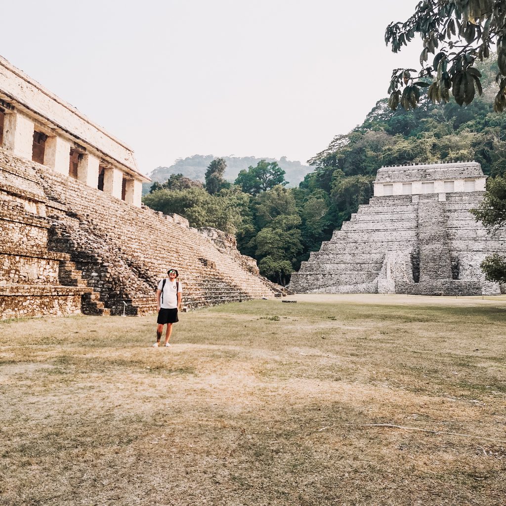 Die Mittagspause fällt offensichtlich aus, nicht schlimm, wir haben noch ausreichend Snacks und Wasser dabei. Gegen 15 Uhr kommen wir in Palenque, direkt am Nationalpark der Maya Stätte an. Im Eiltempo bekommen wir zwei Tourenoptionen angeboten. Wir lehnen dankend ab und wollen das Gelände auf eigene Faust erkunden. Geld sparen. Unsere Rolle des Guides übernimmt Konsti, der uns ein paar Fakten aus dem Internet vorliest.