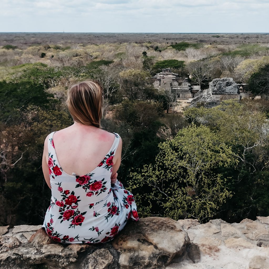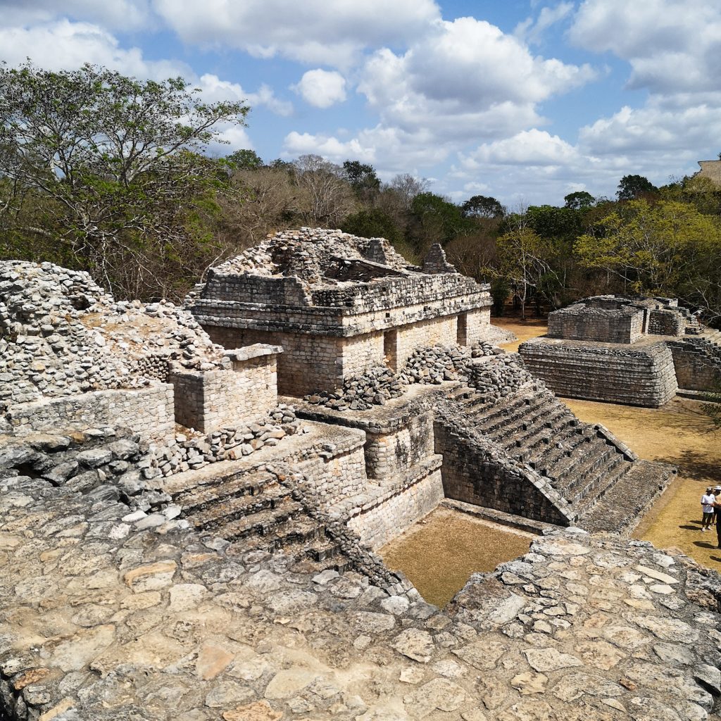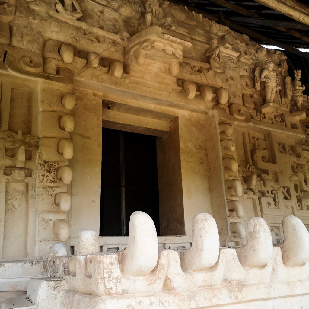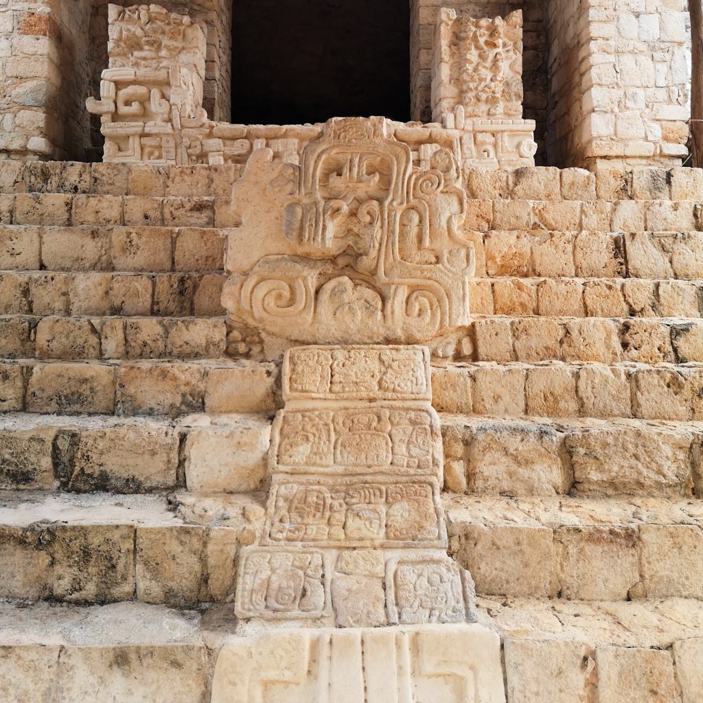 Die Akropolis (laut den Inschriften auch „Weißes Haus des Lernens“ genannt), ist das größte erhaltene Maya-Gebäude im Norden der Halbinsel Yucatan. Der höchste Punkt ist heute 31 m hoch und war ursprünglich sogar nochmal weitere 6 m höher. Es gibt 6 Stockwerke mit 72 Räumen. Das dürfte damit tatsächlich größer sein, als das Haus unserer letzten Wohnung in Köln. Dementsprechend ist der Aufstieg auch etwas anstrengender, aber vielleicht sind wir auch nicht mehr im Dachgeschoss-Treppenlaufen-Training. Auf ungefähr mittlerer Höhe lassen sich heute noch Stuckrelief-Eingänge betrachten, die einst eindrucksvoll gestaltet wurden. Es soll einen Schlangenmauleingang darstellen oder viel mehr Sinn würde hier doch der Jaguar machen, oder? Das schauen wir uns später mal genauer an.