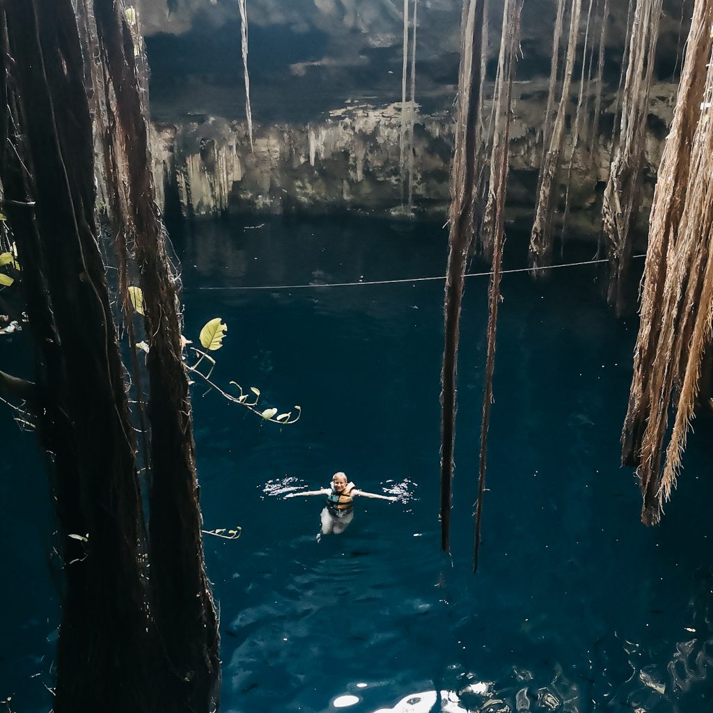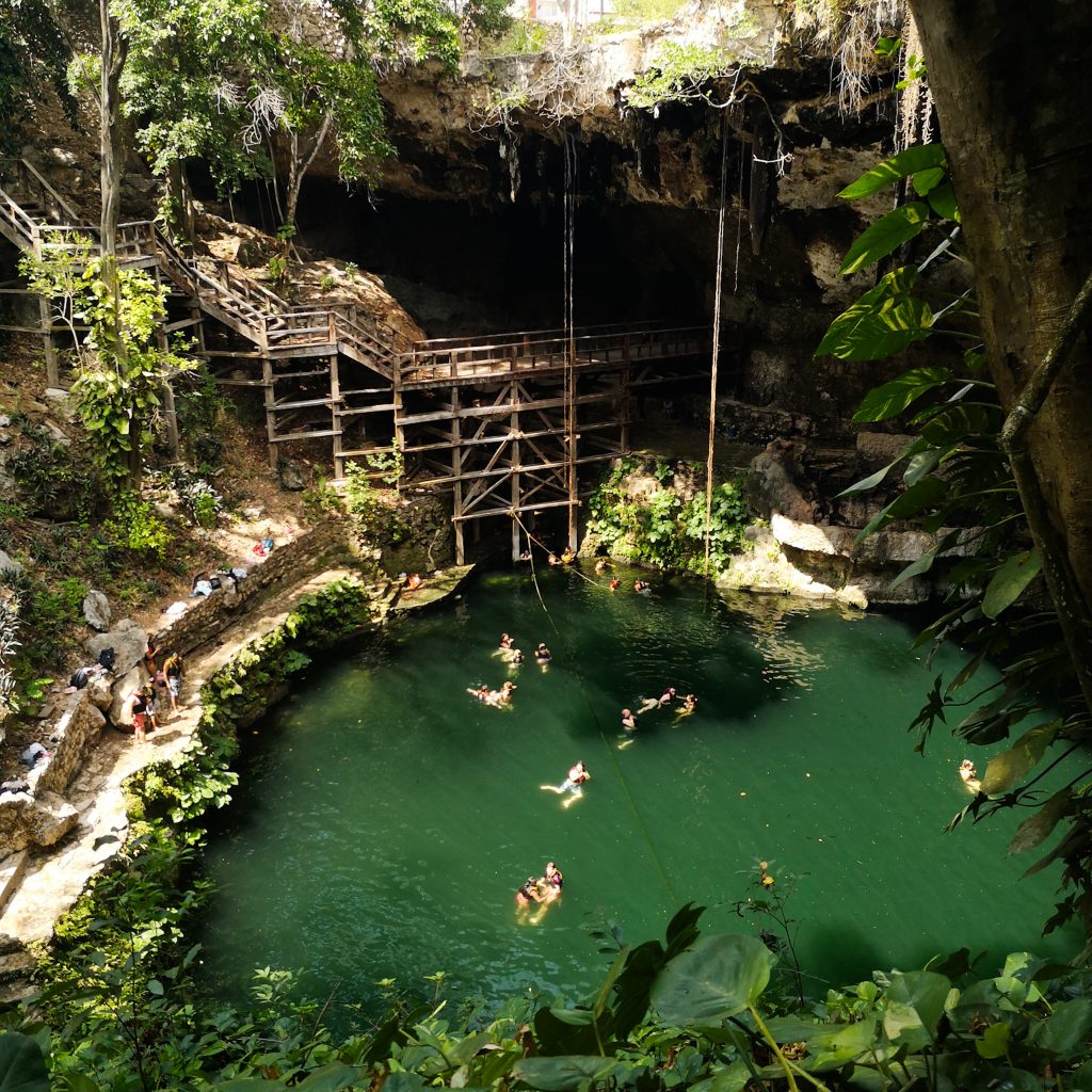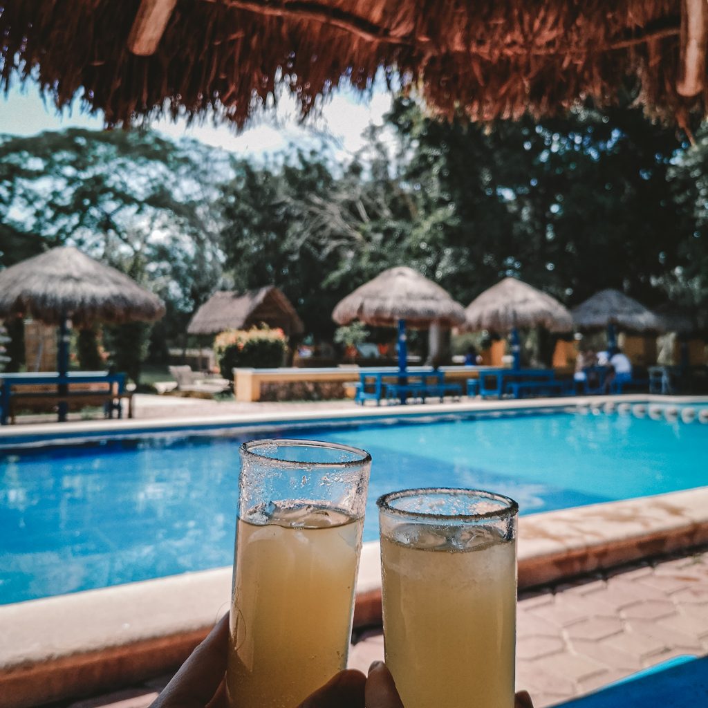 Außer uns sind nur eine Hand voll Franzosen im Wasser. Das Licht fällt durch die große Öffnung in die Cenote, überall fliegen Vögel herum und die morgendliche Stimmung ist unfassbar schön. Auch die anderen Besucher:innen lassen sich ruhig im Wasser treiben. Das Wasser ist erfrischend, aber nicht zu kalt und dank der Schwimmwesten können wir uns einfach etwas treiben lassen. Das Wasser ist richtig klar und dunkel-türkis. Irgendwann wird dann doch die Trapez-Schaukel ausgetestet. O-Ton von Konsti: Wie Helene Fischer, nur ohne sich zu verletzen. Das lassen wir mal so stehen. Wir genießen es total, hier ganz in Ruhe Zeit zu verbringen und unsere Geduld zahlt sich am Ende aus. Irgendwann sind wir ganz alleine in der Cenote. Das werden wir so schnell auf jeden Fall nicht vergessen. Neben den Schwalben-ähnlichen Vögeln, sehen wir auch ein paar richtig schöne bunte Vögel. Für die Handy Kamera sind sie nur leider etwas zu weit weg. Wir sind auf jeden Fall überrascht, wie unbeeindruckt die Tiere hier von den Menschen sind und wie viele in der Cenote zu wohnen scheinen. Als es langsam etwas voller wird, machen wir uns auf den Weg nach oben. Es ist kurz vor 10 Uhr und es kommen gerade immer mehr Menschen an. Genau die richtige Uhrzeit für zwei Palomas am Pool. Endlich mal ein bisschen Cluburlauber Feeling 😅 Wir genießen das Kaltgetränk, beobachten ein bisschen die Menschen und Angestellten in viel zu engen, hässlich gebrandeten Poloshirts und werfen noch einen Blick von dem Viewpoint von oben in die Cenote. Dann machen wir uns irgendwann auf den Weg.