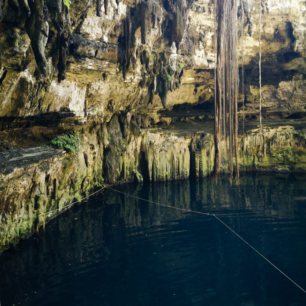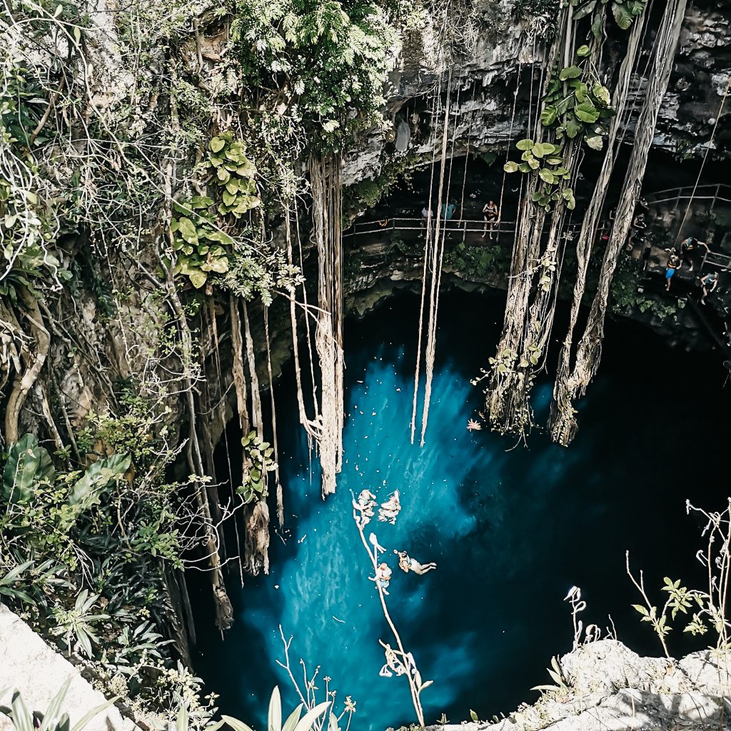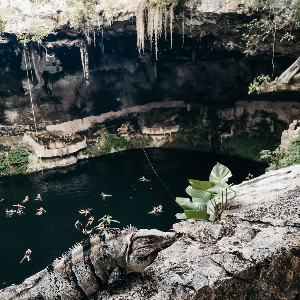 Außer uns sind nur eine Hand voll Franzosen im Wasser. Das Licht fällt durch die große Öffnung in die Cenote, überall fliegen Vögel herum und die morgendliche Stimmung ist unfassbar schön. Auch die anderen Besucher:innen lassen sich ruhig im Wasser treiben. Das Wasser ist erfrischend, aber nicht zu kalt und dank der Schwimmwesten können wir uns einfach etwas treiben lassen. Das Wasser ist richtig klar und dunkel-türkis. Irgendwann wird dann doch die Trapez-Schaukel ausgetestet. O-Ton von Konsti: Wie Helene Fischer, nur ohne sich zu verletzen. Das lassen wir mal so stehen. Wir genießen es total, hier ganz in Ruhe Zeit zu verbringen und unsere Geduld zahlt sich am Ende aus. Irgendwann sind wir ganz alleine in der Cenote. Das werden wir so schnell auf jeden Fall nicht vergessen. Neben den Schwalben-ähnlichen Vögeln, sehen wir auch ein paar richtig schöne bunte Vögel. Für die Handy Kamera sind sie nur leider etwas zu weit weg. Wir sind auf jeden Fall überrascht, wie unbeeindruckt die Tiere hier von den Menschen sind und wie viele in der Cenote zu wohnen scheinen. Als es langsam etwas voller wird, machen wir uns auf den Weg nach oben. Es ist kurz vor 10 Uhr und es kommen gerade immer mehr Menschen an. Genau die richtige Uhrzeit für zwei Palomas am Pool. Endlich mal ein bisschen Cluburlauber Feeling 😅 Wir genießen das Kaltgetränk, beobachten ein bisschen die Menschen und Angestellten in viel zu engen, hässlich gebrandeten Poloshirts und werfen noch einen Blick von dem Viewpoint von oben in die Cenote. Dann machen wir uns irgendwann auf den Weg.