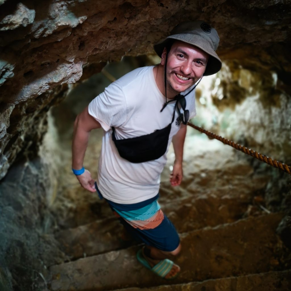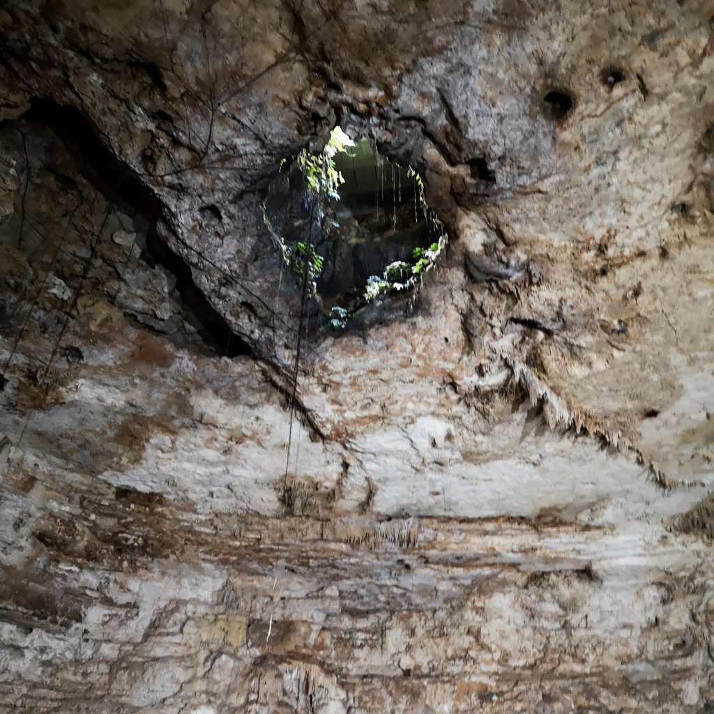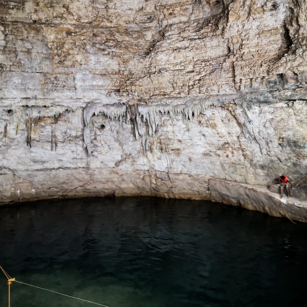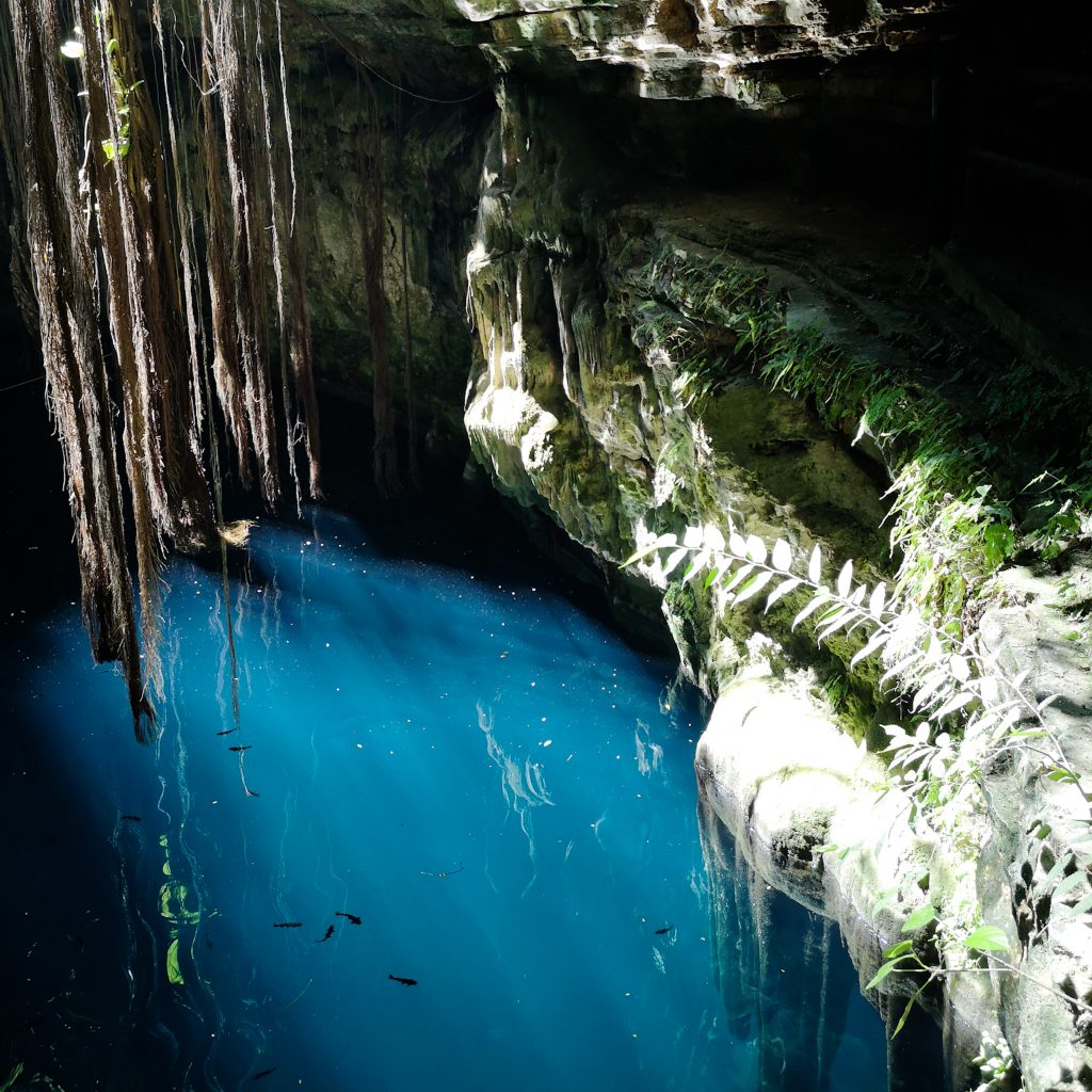 Kurz bevor wir ankommen, machen wir nochmal Halt und trinken beide eine Flasche Wasser. Wie gut es tut, etwas kaltes zu trinken. Wir fahren noch ein kleines Stück weiter ins Dorf und sind etwas verwirrt. Hier müsste die Cenote eigentlich sein. Wir drehen eine Runde über den Dorfplatz und schließlich entdeckt Konsti das kleine Schild. An einer kleinen mit Stroh bedeckten Hütte ist tatsächlich der Eingang. Okay. Wild. Hier brauchen wir keine Schwimmweste und auch der Eintritt ist wesentlich günstiger. Die Treppe nach unten gleicht einem niedrigen Höhleneingang. Eigentlich ist es auch eine Höhle. Unten im der Cenote ist die Decke zwar recht hoch, aber es kommt nur ein kleiner Tageslichtstrahl in die Höhle hinein. Auch hier ist fast nichts los.