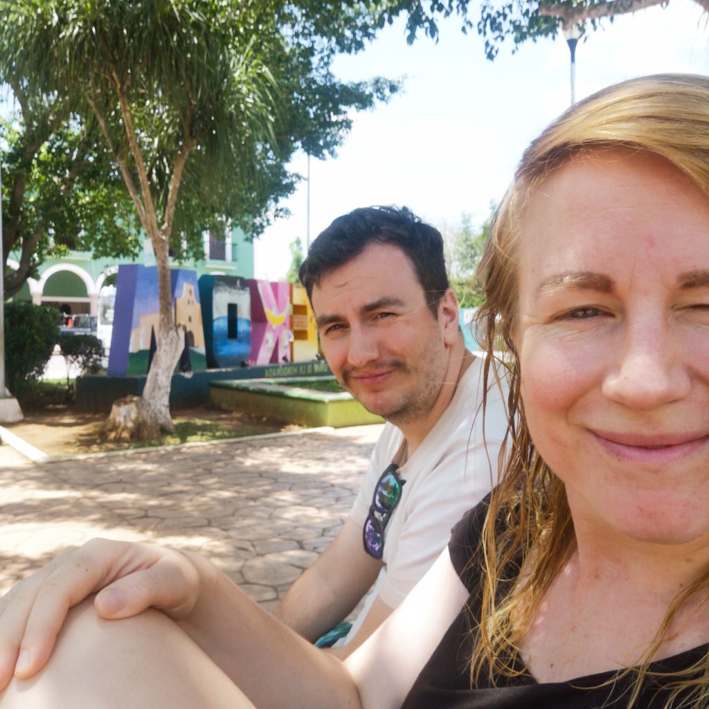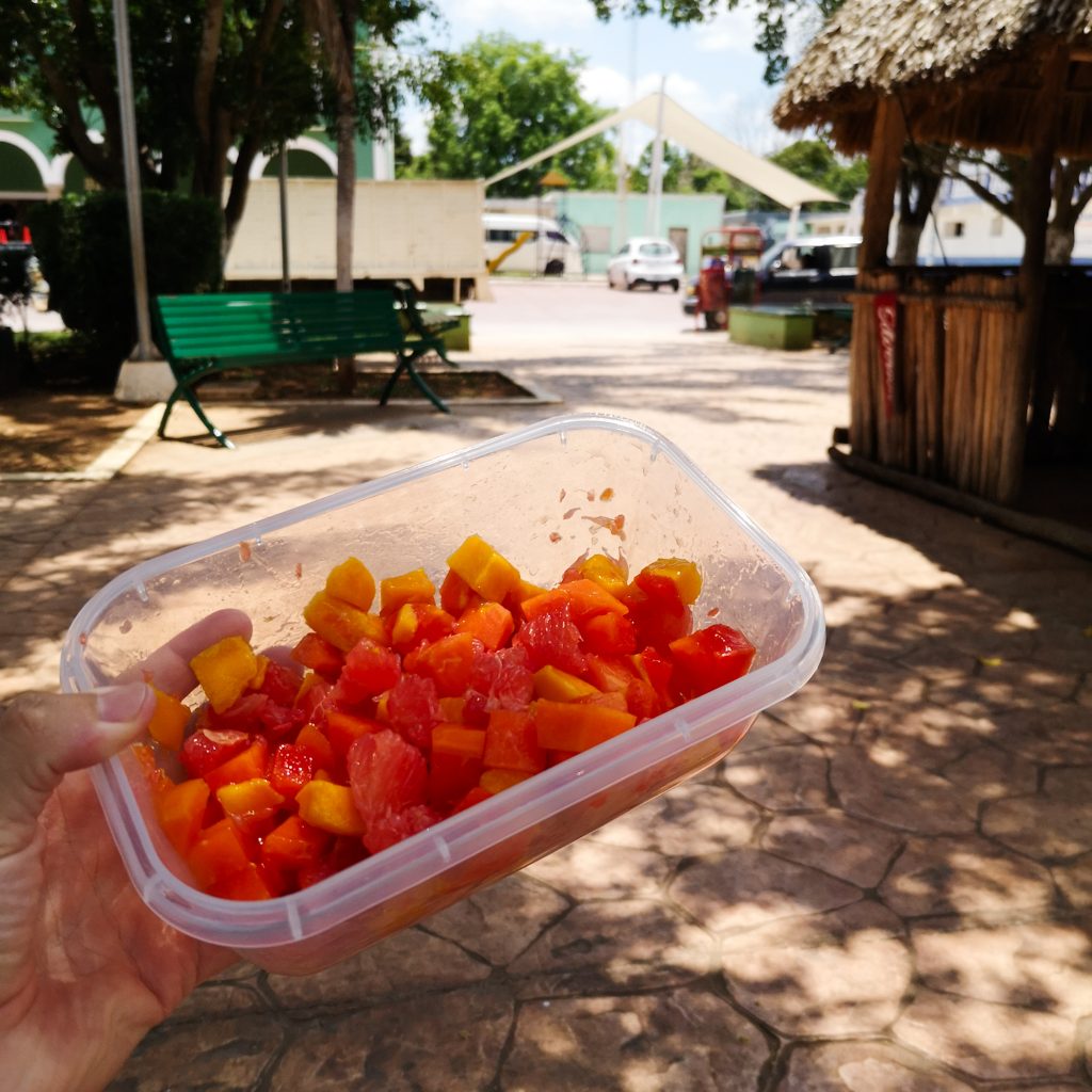 Das Wasser ist unerwartet frisch, aber nicht sonderlich tief. An ein paar Stellen können wir sogar stehen. Es ist nochmal ganz anders als unsere erste Cenote, aber trotzdem irgendwie cool. Ganz mithalten kann sie trotzdem nicht. Außerdem gestaltet sich der Ausstieg als gar nicht so einfach. Es führen zwar Stufen ans Wasser, aber sie gehen nicht bis hinein. Besonders bei Caro gleicht das Bild eher einer Robbe, die versucht, mühsam an Land zu robben. Das Video, das Konsti von ihr macht, wurde leider erst zensiert und dann gelöscht. Wir sind immer noch etwas kaputt und freuen uns sehr eine kleine Pause einzulegen. Bei Tageslicht setzen wir uns an den Dorfplatz und genießen unser Obst. Köstlich!