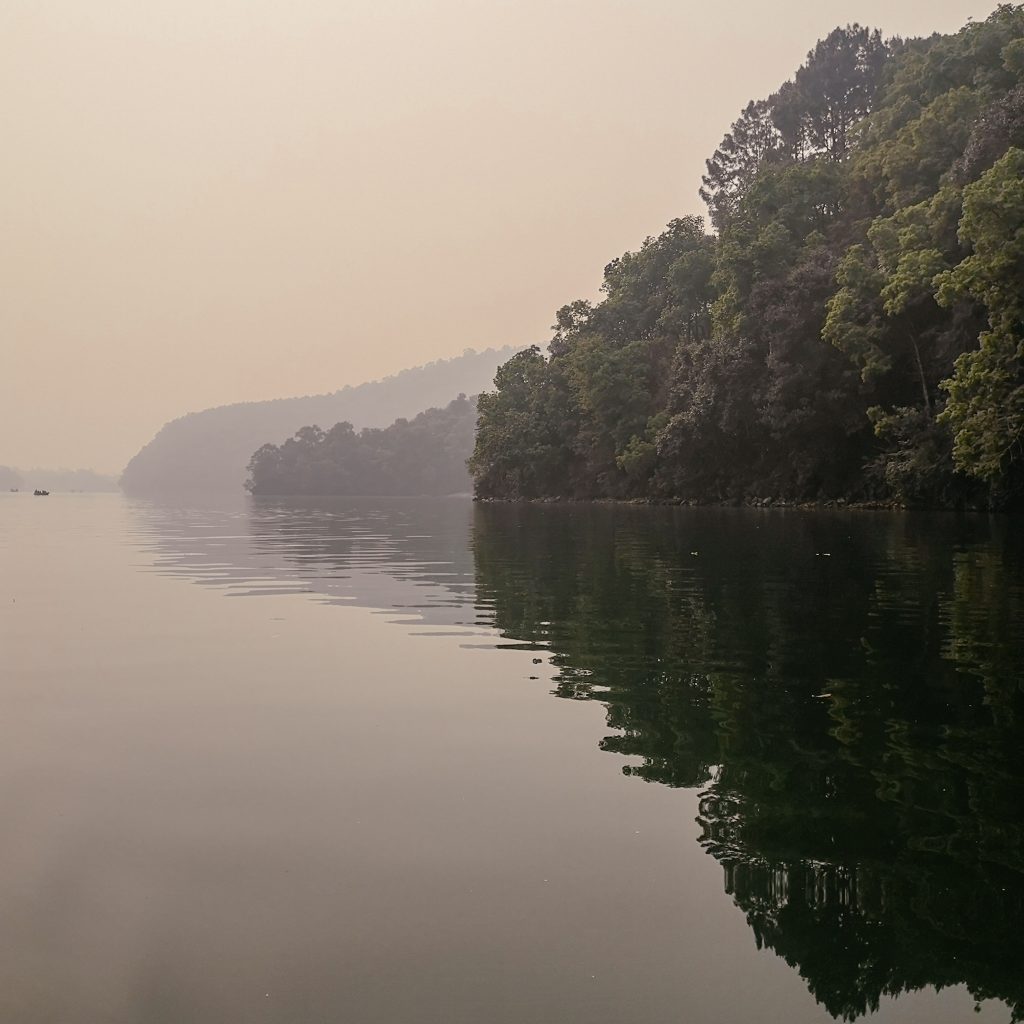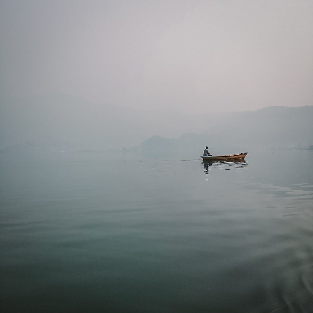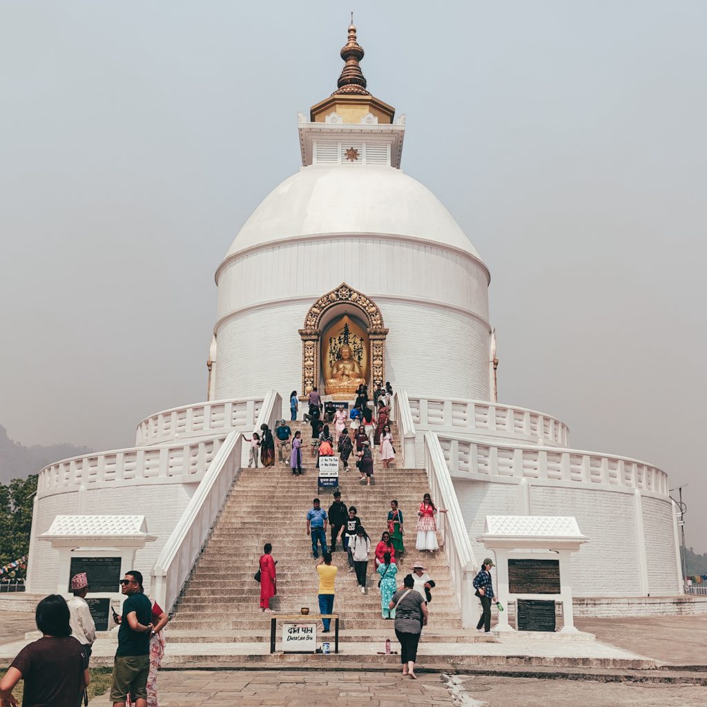 Am nächsten Tag machen wir uns am Vormittag auf den Weg zur Friedensstupa, die auf dem gegenüberliegenden Berg des Sees liegt. Wir setzen mit einem Bötchen auf die andere Seite über. Statt einem romantischen Ausblick auf den See, sehen wir.. eigentlich gar nichts. Es ist wie auch tags zuvor neblig. Wir spazieren die Stufen bergauf und kommen ganz schön ins Schwitzen. Es ist zwar neblig, aber trotzdem schön sehr warm und schwül. Oben angekommen skippen wir den Weg zum Aussichtspunkt und begeben uns direkt zur Friedensstupa. Die 35 Meter hohe Vishwa Shanty Stupa ist eine von über 80 erbauten Weltfrieden Pagoden auf der ganzen Welt. Sie sollen dazu beitragen, den Frieden unter allen Menschen und Glaubensrichtungen zu fördern. Rund um die Pagoda vier Nischen mit Buddhas aus unterschiedlichen Ländern, die sich den Himmelsrichtungen gegenüberstehen.