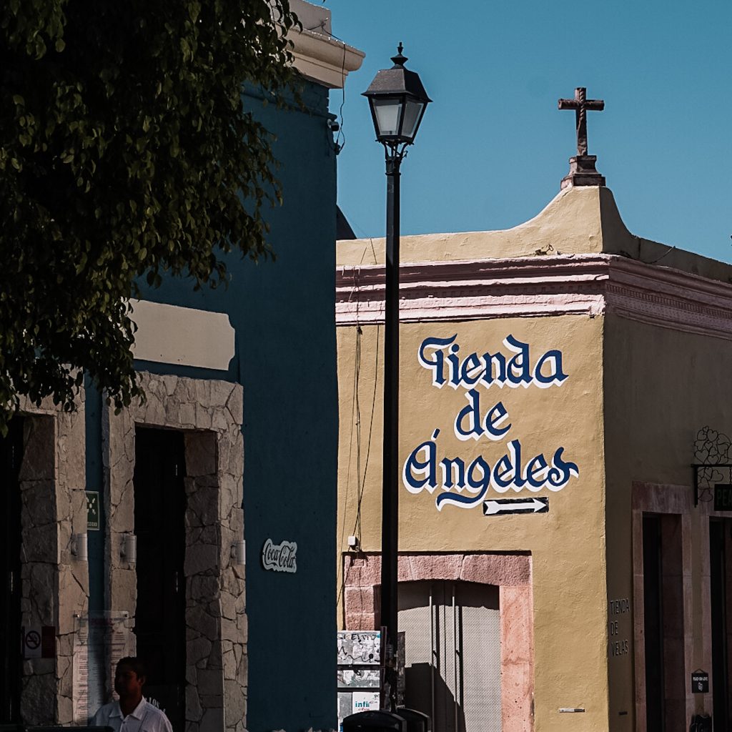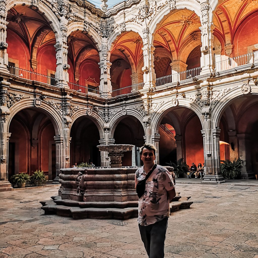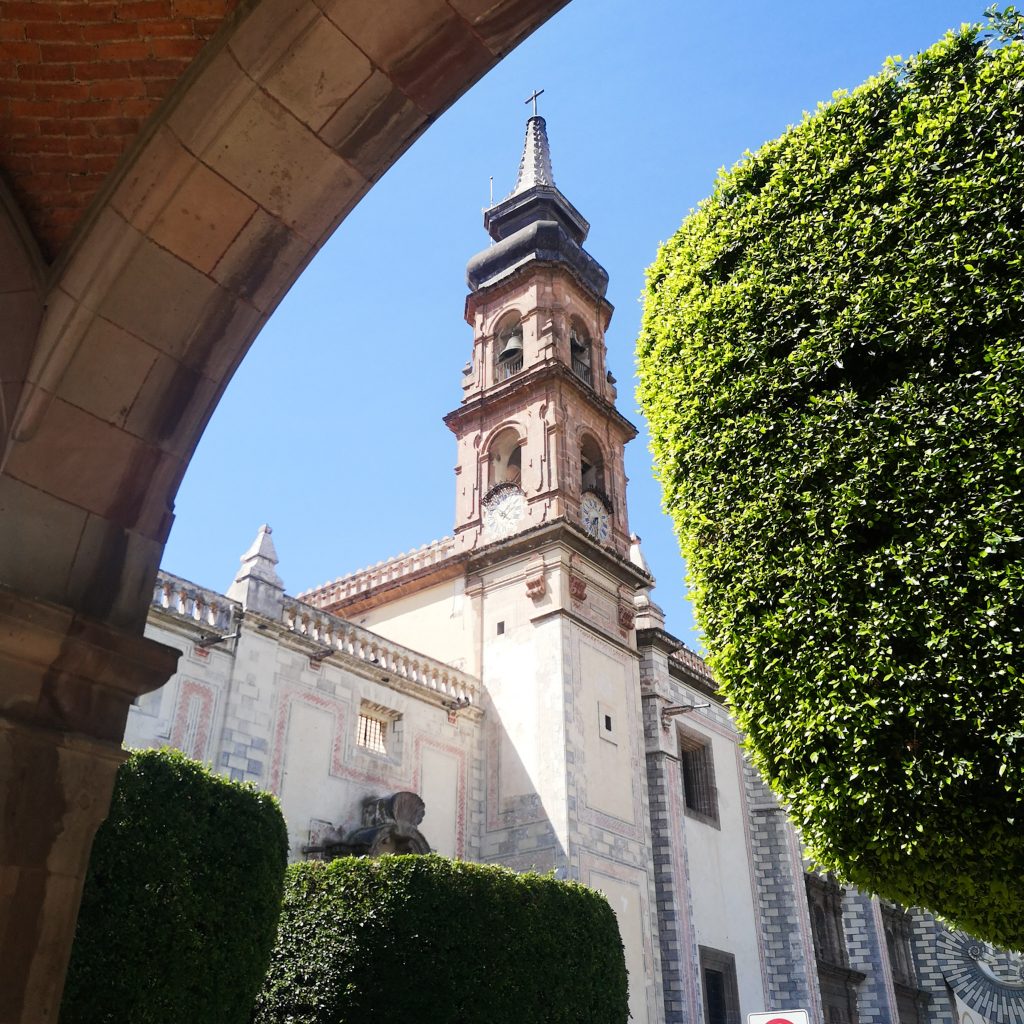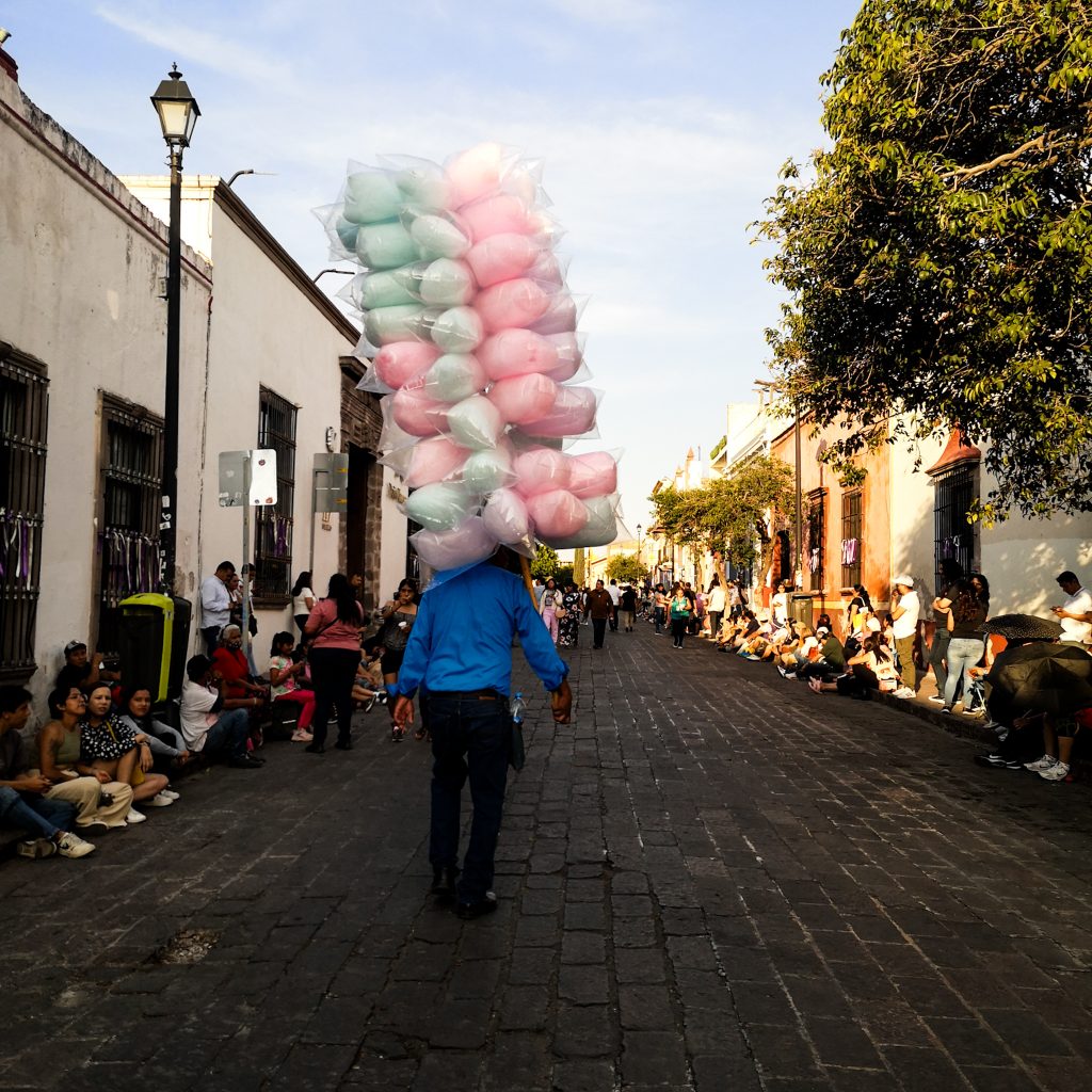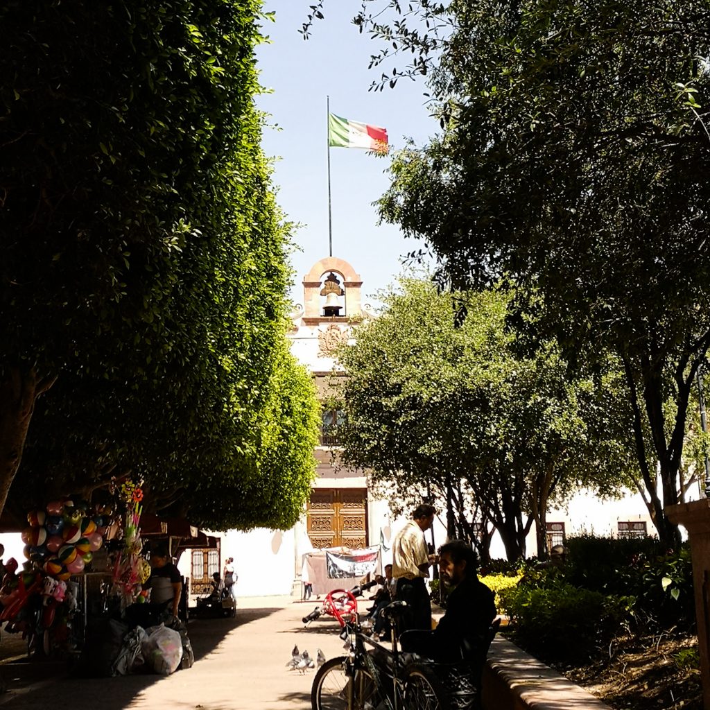Danach geht es dann aber doch auf die erste Erkundungstour. Wir besorgen uns eine Simkarte und spazieren einfach drauf los. Wir sehen zwar eine Hand voll Touris (die zumindest für uns identifizierbar sind), befinden uns aber ansonsten in einer Wolke aus gut gelaunten, spanisch sprechenden Familien, gut aussehenden Frauen, älteren Damen und Herren und natürlich ein paar vierbeinigen Begleitern der Menschen (immerhin nicht mehr in Kinderwagen oder mit Windeln). Mittlerweile steht die Sonne tief, kurz vor Sonnenuntergang, und das goldene Licht taucht die Stadt in ein noch schöneres Licht. Wie wunderschön es hier ist. Es gibt mehrere Plätze, mal sind sie voll vom Verkäufer:innen, Clowns (darauf scheinen die Menschen hier total abzufahren) und kleinen Essens- und Getränkeständen. Mal sind sie aber auch fast leer und einzig und alleine auf den am Rand stehenden Banken nehmen Menschen Platz, die sich unterhalten oder einfach den Moment zu genießen scheinen. Auch wir nehmen auf einer der Bänke Platz und werden prompt vom zwei Männer angesprochen. Ja, offensichtlich sieht man uns an, dass wir keine gebürtigen Mexikaner:innen sind. Trotz Konstis extra für Mexiko herangezüchteten Schnörres. Vielleicht liegt es aber auch einfach an Caro, deren Haut- und Haarfarbe sich wahrscheinlich nicht einmal mit einer Färbung oder intensivsten und langwierigen Sonnenbädern anpassen ließe. Jedenfalls erzählen die beiden uns, dass Querétaro eine sehr gute Destination in Mexiko ist. Hier gibt es angeblich wesentlich weniger Tourist:innen, eine wunderschöne Altstadt (dem können wir schonmal kopfnickend zustimmen) und nette Menschen. Einer der Männer kommt aus Neuseeland und der andere aus Mexiko selbst, in Querétaro sind sie aktuell zum Arbeiten, wir können sie also als recht stabile Quelle für diese Infos einstufen. Ach cool, das freut uns. Das klingt nach genau dem richtigen Start für uns.