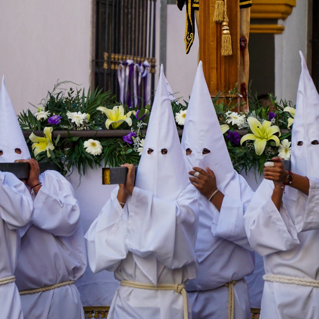 Wir laufen entlang der Straße und suchen uns ein Plätzchen zwischen den anderen Besucher:innen. Die Menschen jeden Alters stehen am Straßenrand und gemeinsam warten wir, dass es losgeht. Mit etwas Verspätung ist es dann soweit und die Prozession beginnt. Sie ist tatsächlich schweigend und für uns in jedem Fall mal eine ganz andere Erfahrung. Zunächst kommen ein paar gleichgekleidete Gruppen mit Kindern, jungen Frauen und älteren Damen. Die älteren Damen haben Kerzen (LED-Version) in der Hand und die jungen Frauen tragen unterschiedliche Gegenstände, Jesusbilder, Krüge, Blumen,… Immer wieder zwischendurch gibt es Männer, die kurz auf einer Trompete spielen. Danach folgen viele, sehr sehr viele Gruppen von Männern. Wir tippen auf unterschiedliche Altersklassen, ihre Gesichter können wir unter ihren Kostümen nicht sehen. Sie tragen Roben und spitze Hüte und ähneln dem Outfit des Ku Klux Klans.