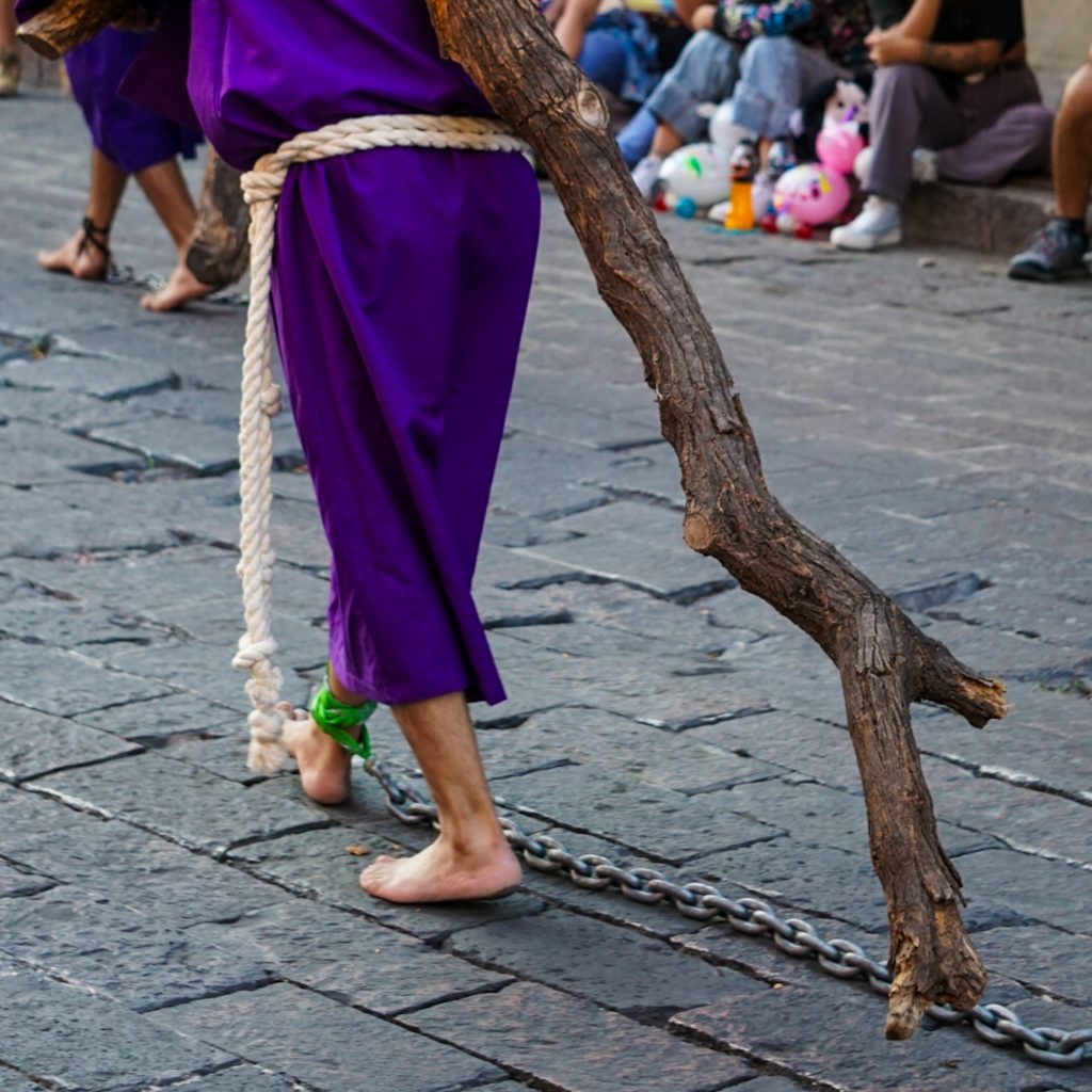 Und nicht nur das. In erster Linie tragen sie Kreuze aus Baumästen, manche sogar richtige Baumstämme. Wir können wirklich nur erahnen, wie schwer die Last, vor allem für die gesamte Prozession sein muss. Hinzu kommen bei den meisten noch Ketten, die sie um ihre Füße gebunden haben. Und sie laufen zudem auch noch barfuß. Wir sind offen gestanden nicht ganz so gut in dieser Materie, aber das diese Leute den Leidensweg Jesu gedenken und diesen selbst nachempfinden, ist deutlich zu erkennen. Mit der „Via Crucis“ soll der Moment nach der Verurteilung von Jesus nachgestellt werden, bei der er das Kreuz selbst auf einen Hügel schleppen musste, bevor er dort von den Soldaten gekreuzigt wurde. Die zusammengehenden Gruppen haben meist unterschiedliche Roben-Farben, lila, schwarz, dunkelgrün, grau, weiß und auch rot.
