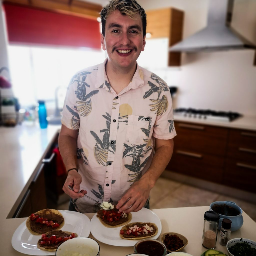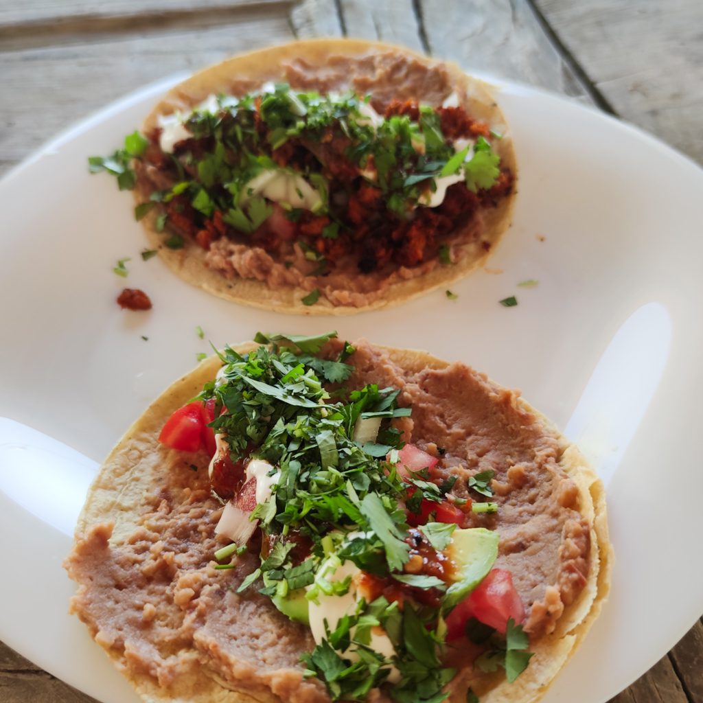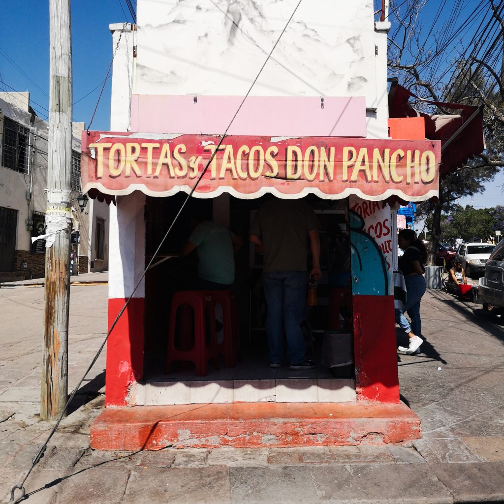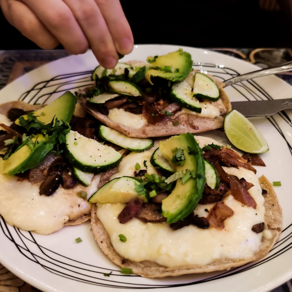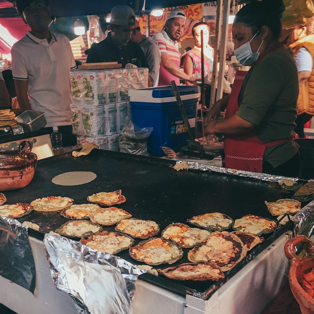 Jetzt wird es Zeit für ein Abendessen. Da wir es ja aus Japan gewohnt sind, stellen wir uns in einer kleinen Schlange vor einem offensichtlich gut besuchten Restaurant an. Es dauert zwar ein bisschen, aber dann bekommen wir ein Plätzchen zugewiesen. Es gibt zwar kein mexikanisches Bier zum Anstoßen, dafür aber köstliches Essen. Wir haben keine Ahnung, was wir genau essen, aber es ist köstlich. Beide Gerichte sind mit Mais-Tortillas, einmal kleine runde belegte Tortillas mit einer Bohnenmasse und verschiedenen Toppings und einmal ein großer, Pizza-ähnlicher Fladen, der mit Bohnen, Käse und einer Crema überbacken zu sein scheint. Dazu stehen natürlich Salsas auf dem Tisch. Obacht: scharf. Daran können wir uns schonmal gewöhnen. Aber die Kombi aus Schärfe, Säure von der Limette und für Caro auch noch Avocado gefällt uns sehr. Das könnte jetzt jeden Tag so gegessen werden.