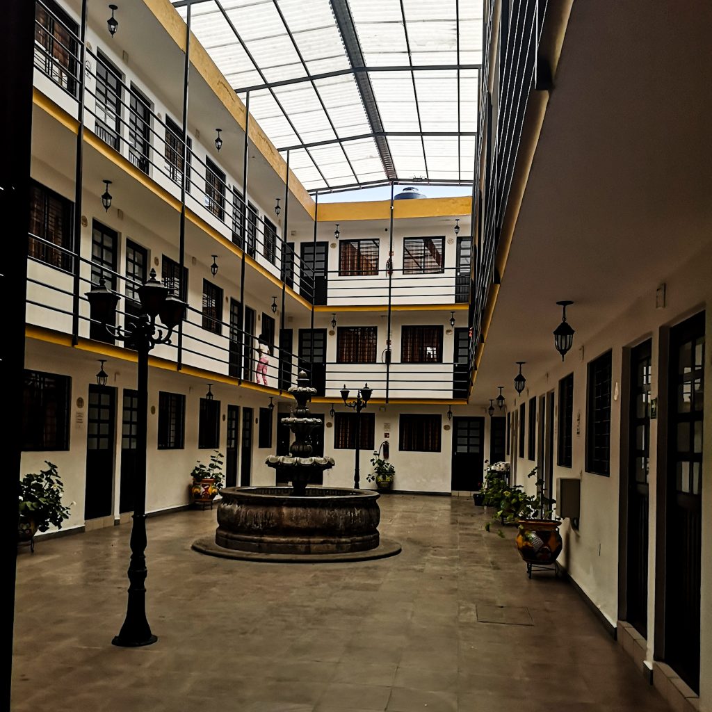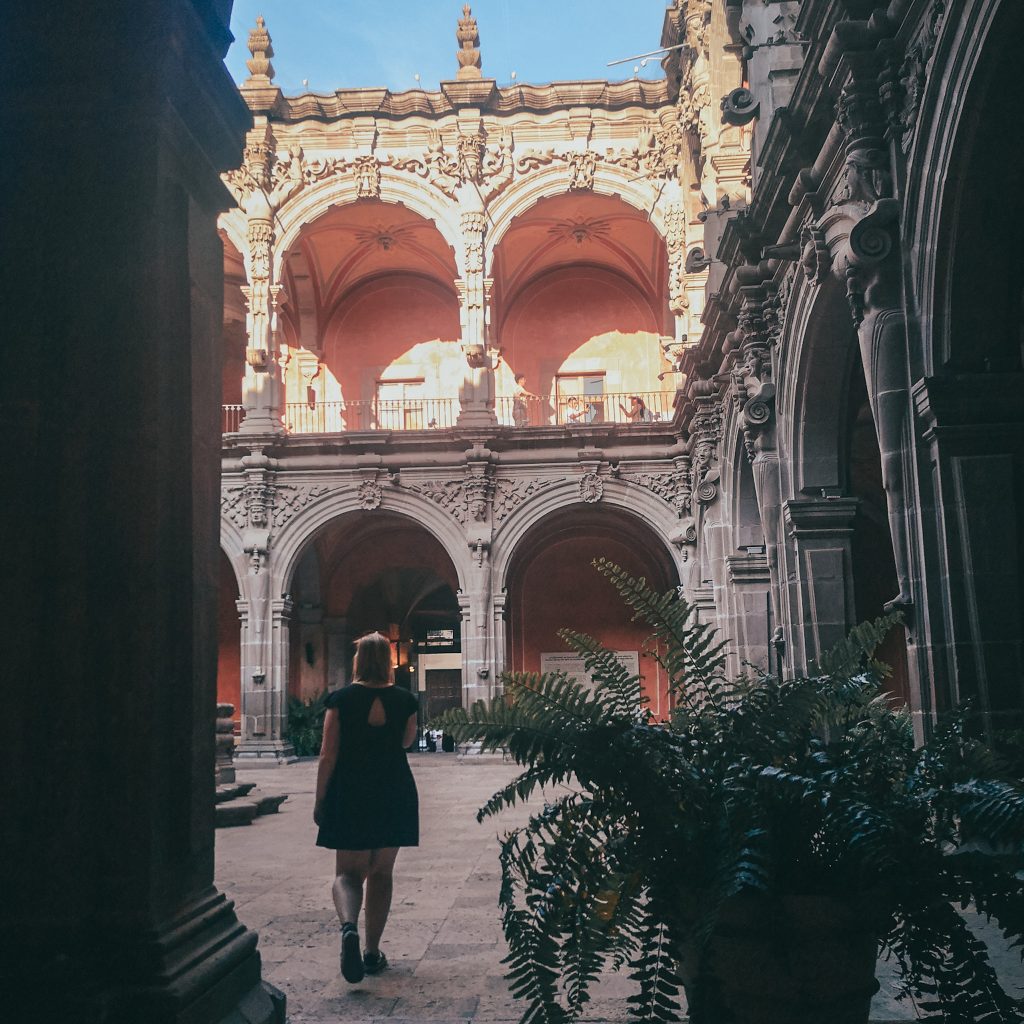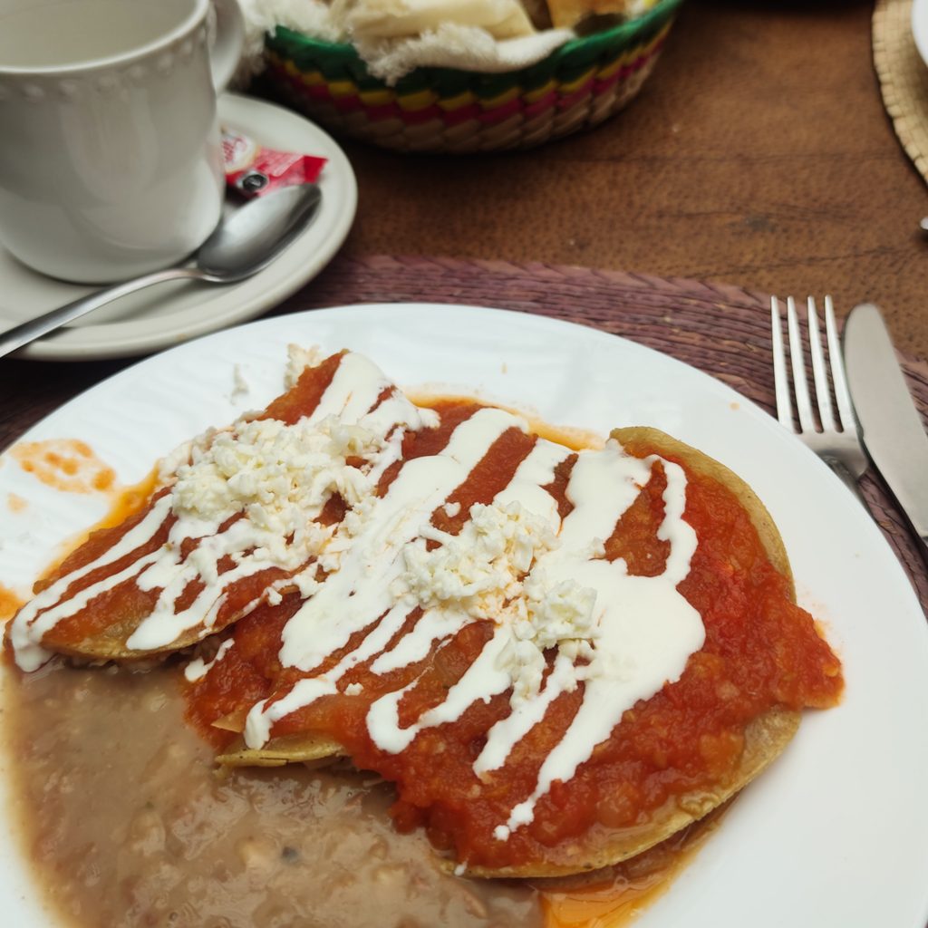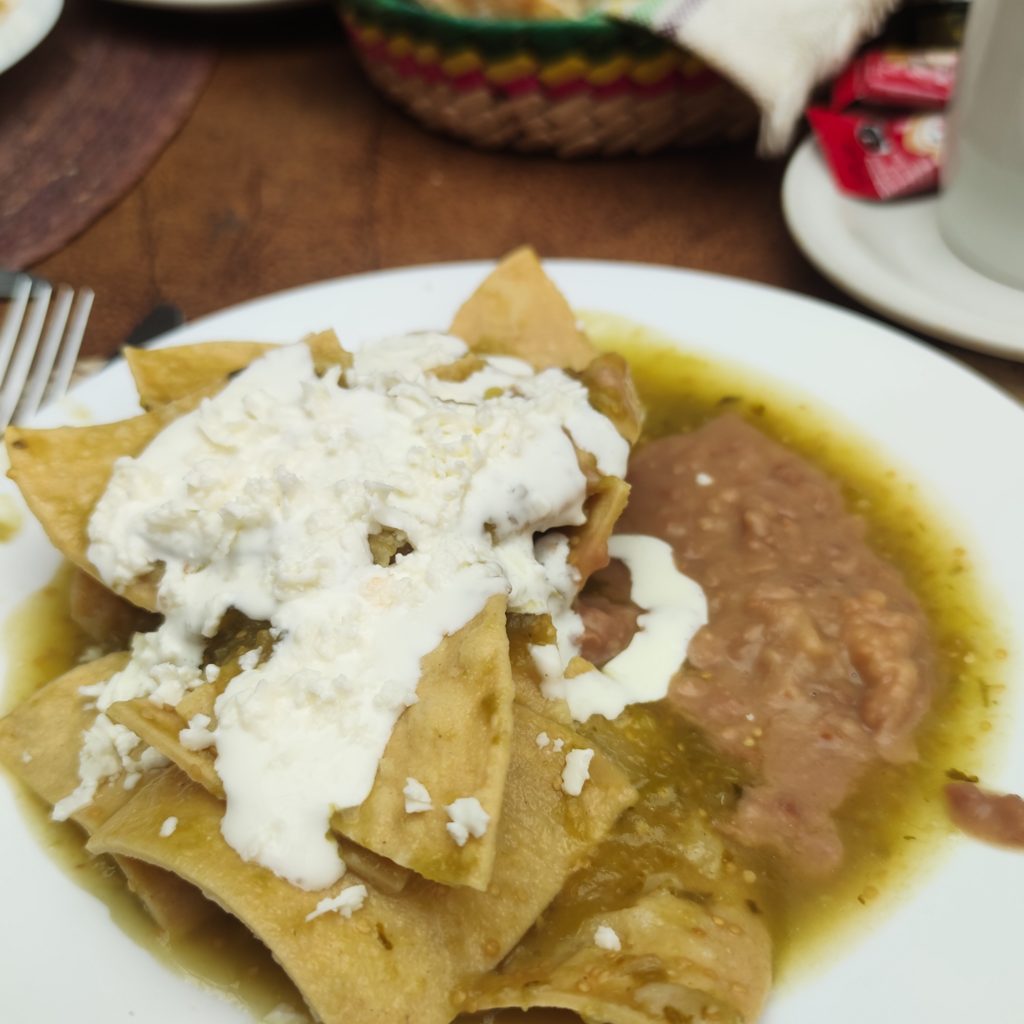 Nach einer erfrischenden Dusche beschließen wir, direkt gegenüber zu frühstücken. In einem kleinen Innenhof nehmen wir Platz und sind erneut gezwungen unsere Spanischskills auszupacken. Beim Angebot haben wir die Wahl zwischen Kaffee und Tee, Saft oder Früchten und einer „Hauptspeise“, von der wir mal wieder die Hälfte nicht verstehen. Die nette Dame möchte uns zwar ausreden, dass wir Früchte statt dem Saft nehmen, da die Papaya zu dieser Jahreszeit „muy feo“ schmeckt, aber wir antworten nur „no pasa nada“. „Feo“? War das nicht hässlich? Naja, dann gibt’s wohl hässliche Papaya zum Frühstück, kein Problem 😉 Vegetarisch ist hier übrigens kein Problem, sprachlich, aber auch weil das Konzept „Vegetarismus“ ein Begriff ist. Da wir noch keine Übersicht über die normalen Zutaten der traditionellen Speisen haben, sagen wir sicherheitshalber immer dazu, dass wir kein Fleisch essen. Heute ist Chilaquiles-Premiere. Das typisch mexikanische Frühstück besteht auch Reste-Tortillas von vorherigen Tagen, die erst zerrissen, frittiert und dann mit Salsa Verde oder Roja serviert werden. Getoppt werden die nun etwas härteren Tortilla-Stücke mit etwas Crema und Käse. Klingt ungesund? Ist es irgendwie auch, aber ehrlich gesagt schmeckt man das Fett nicht allzu sehr. Außerdem gibt’s mit Käse gefüllte Enchiladas, ebenfalls mit Salsa Rojo oder Verde. Wir trinken noch gemütlich einen weiteren Kaffee und dann geht die Erkundungstour der Altstadt in die zweite Runde.