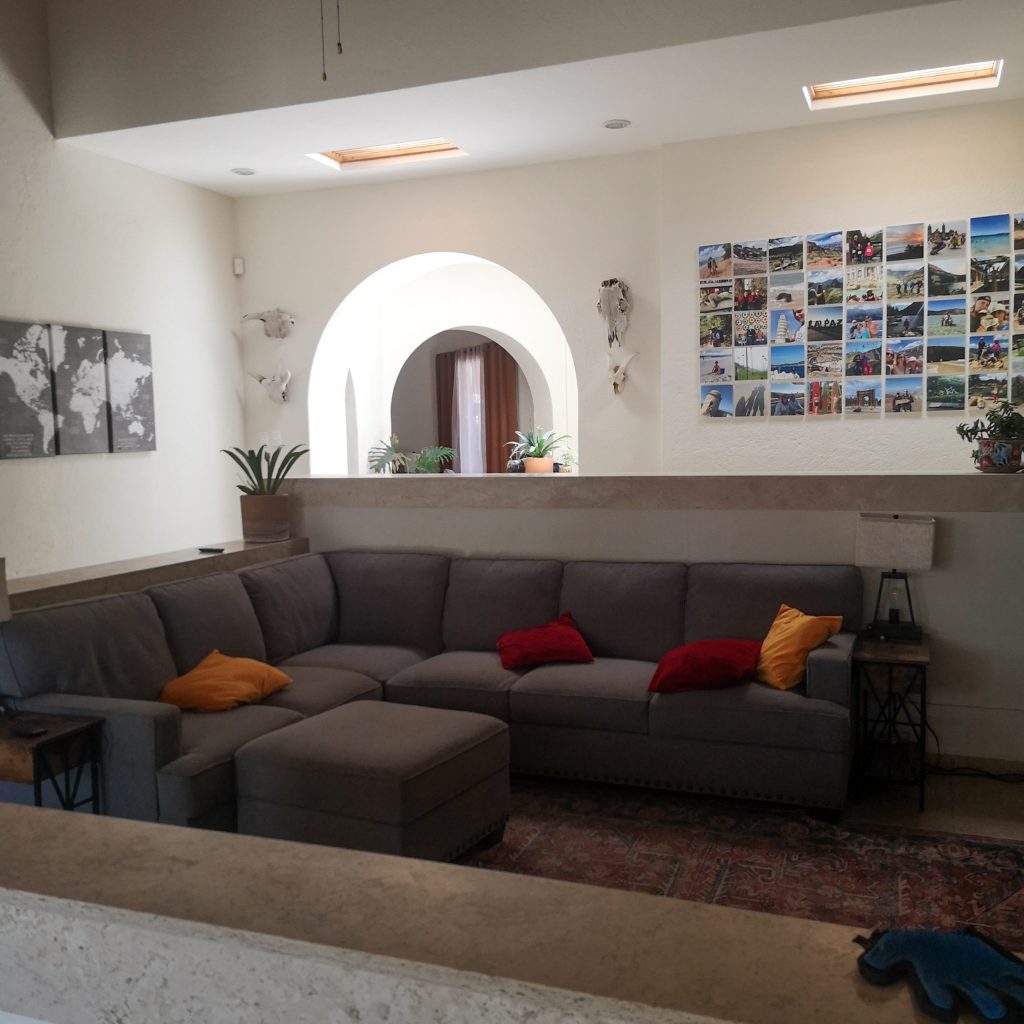 Im Schnelldurchlauf bekommen wir alles gezeigt, stellen kurz drei Fragen und keine 10 Minuten später, verabschiedet die Familie sich und steigt in ein Uber zum Flughafen. Das ging wirklich schnell. Den Guide für den Housesit haben wir quasi parallel geschickt bekommen und schauen uns diesen jetzt erstmal in Ruhe an. Sowohl wir als auch die Hunde sind gerade noch etwas überfordert. Widmen wir uns erstmal den wichtigen Dingen: den Tieren. Frida und Moxxie verstehen schnell, dass wir nun ihre Aufpasser:innen mit durchaus passablen Streichel- und Spiel-Skills sind. Franky hingegen ist etwas skeptisch und hegt noch insgeheim die Hoffnung, dass seine tatsächliche Familie gleich wieder zur Tür herein kommt. Er platziert sich erstmal auf der Sofalehne mit Blick in die Einfahrt des Hauses. Für Franky ist es das erste Mal, dass die Familie verreist, er wohnt erst seit ein paar Monaten hier. Wir sind sehr gespannt, wie wir uns hier mit den Tieren und in diesem großen Haus einleben.