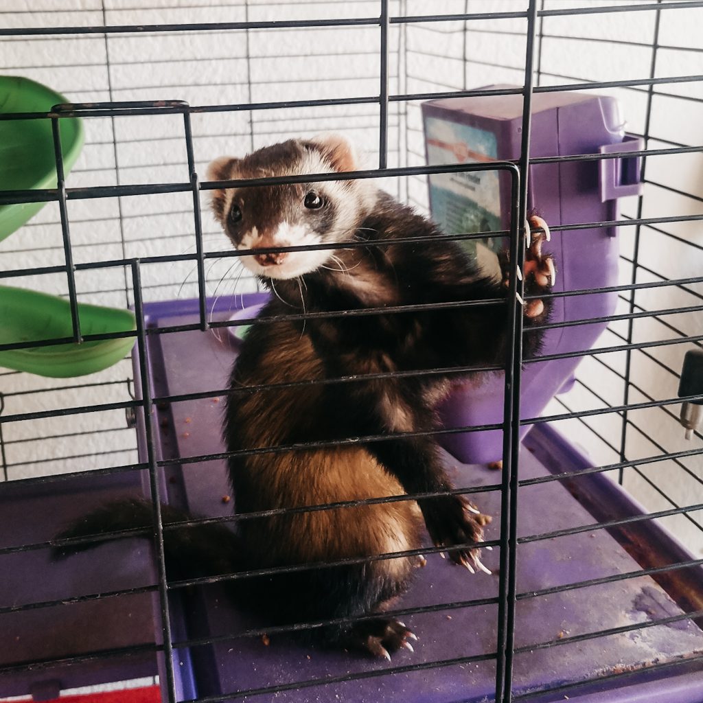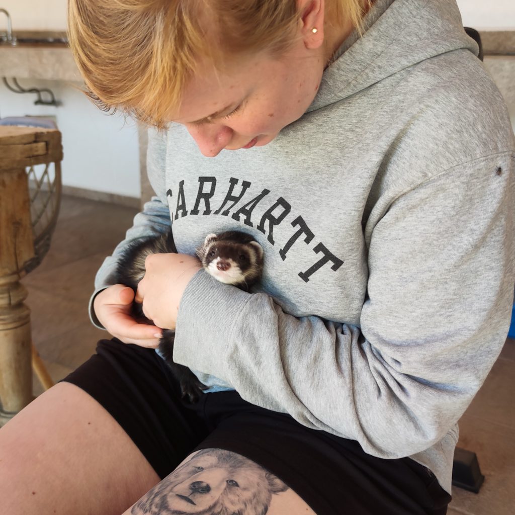 Hier befindet sich auch das Eigenheim von Chuck, dem Frettchen. Das bekommen wir kurzerhand einmal auf den Arm gesetzt: Hallo Chucky!