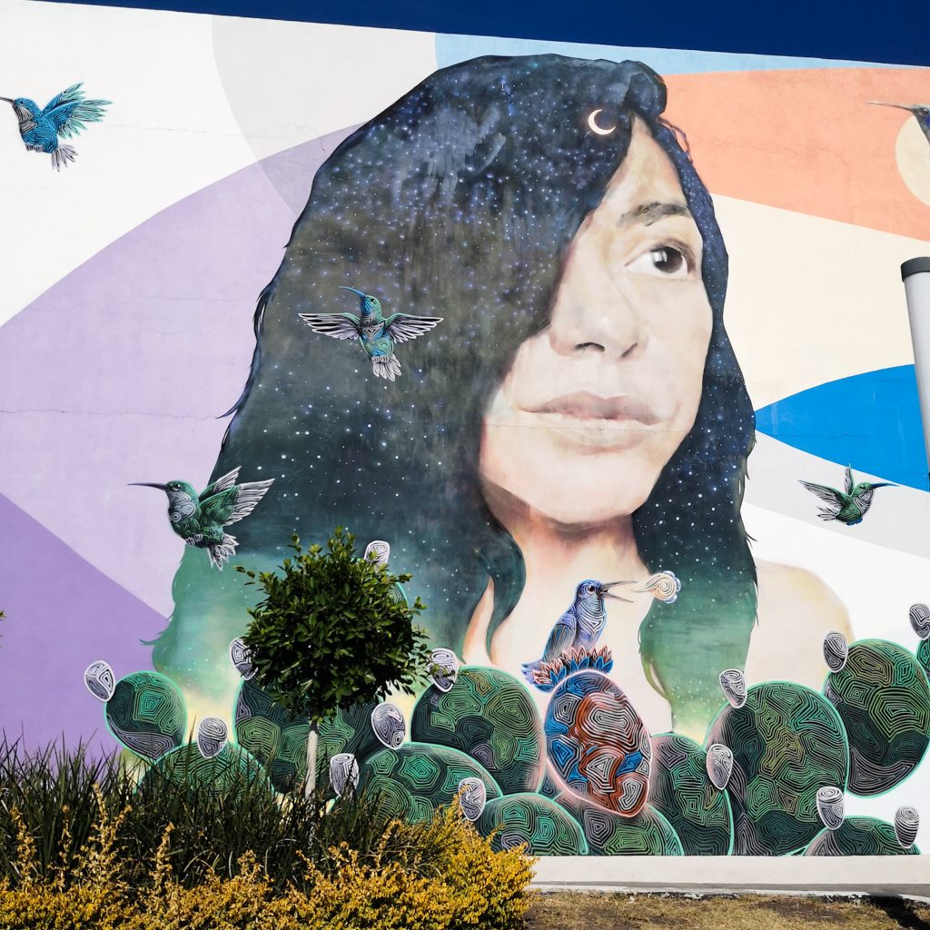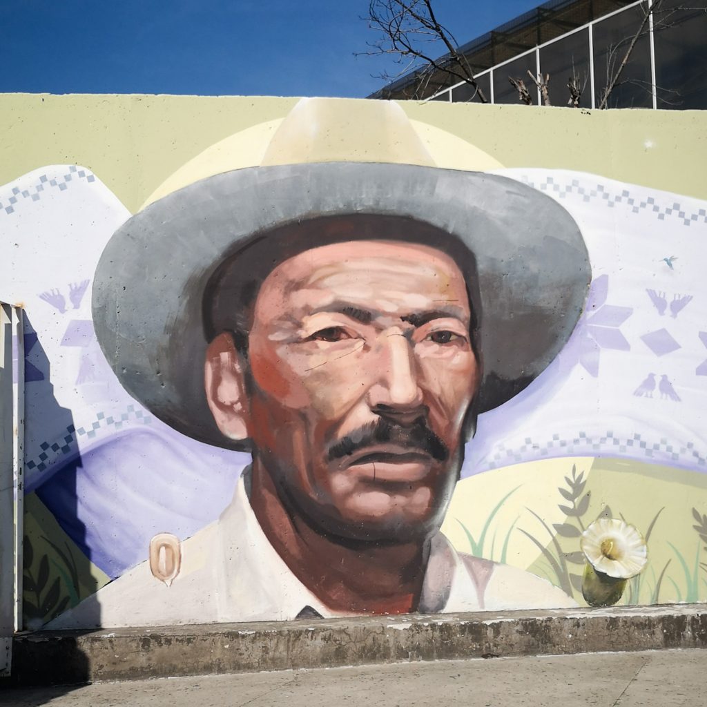 Beim Centro Cultural Gómez Morín gibt es wechselnde Ausstellungen verschiedener Künstler:innen. Wir besuchen zwar keine Ausstellungen, wollen uns aber die vielen Kunstwerke auf der Fassade des Gebäudes ansehen.