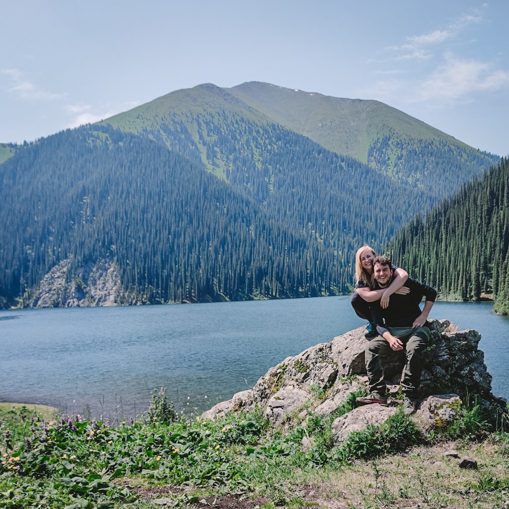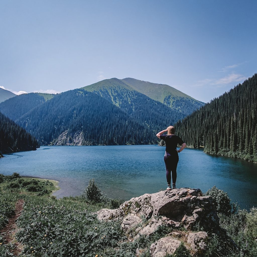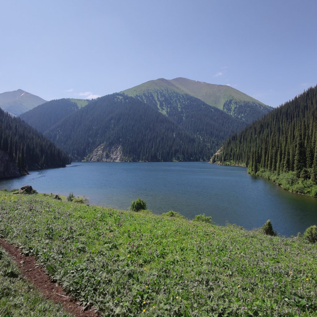 Der Wecker klingelt heute früh. Wir haben uns heute die Wanderung vom Kolsai Lake 1 zur Numero 2 vorgenommen. Es soll anstrengend werden und da Caro immer noch nicht wieder ganz fit ist, wollen wir zumindest früh starten. Der erste See liegt ziemlich nah beim Parkplatz von gestern. Als wir dort ankommen, sind nur ein paar ältere, russische Männer dort, die lautstark Technomusik hören und Fotos von sich machen. Wir laufen schnell los, müssen aber feststellen, dass ihre Geräuschkulisse uns noch etwas begleiten wird.