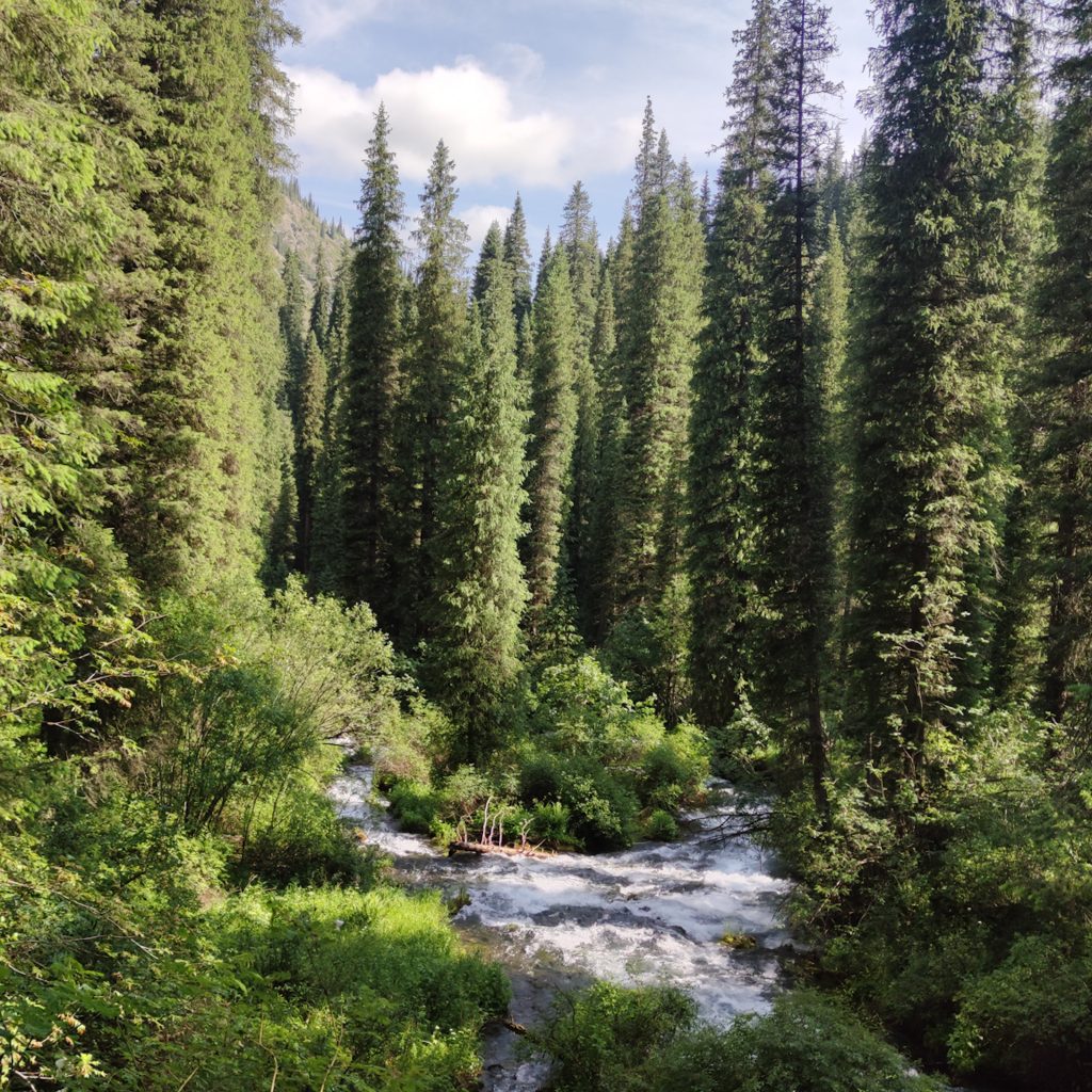 Der erste Teil der Wanderung geht direkt am Kolsai Lake 1 entlang. Leider nicht auf einer Höhe, sondern immer wieder hoch und runter. Das richtige Warm-up ist also schonmal gesichert. Schon jetzt ist die Aussicht richtig schön und schnell lassen wir die Schandflecken des ersten Sees (Bootsverleihe und sonstige Touri-Lokalitäten) hinter uns. Am Ende des Sees laufen wir eine ganze Zeit entlang des Flusses, der vom zweiten in den ersten See mündet. Zwischen den Bäumen fällt das Licht der Sonne durch, der Boden und unsere Umgebung sind von der Nacht und dem Regen aber noch ganz nass und feucht. Nach einer guten Stunde legen wir an einer Wiese in der Sonne unsere Frühstückspause ein. Es gibt Brot mit Frischkäse und Gurke – unser Dauerbrenner, aber es schmeckt ganz hervorragend. Und die Stärkung werden wir brauchen, denn bald erwartet uns erst der anstrengende Teil der Wanderung. Wir müssen nämlich noch knapp 500 Höhenmeter zurücklegen, wobei ein Teil der Strecke ca. 40 Grad Steigung hat. Nach dem Frühstück dann eine miese Feststellung: Wo ist Caros Sonnenbrille? 😱 Jedenfalls nicht mehr auf ihrem Kopf. Uns beschleicht eine Vermutung. Beim Ausziehen des Pullover wurde diese kurz abgelegt und „sicher“ an den Busch gehangen. Na hoffentlich bleibt sie da auch sicher bis zur Rückkehr. Jetzt umzudrehen wäre auf jeden Fall Quatsch.
