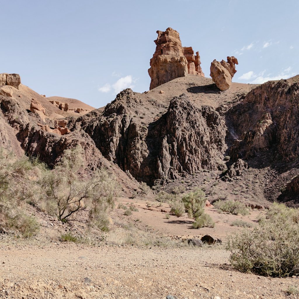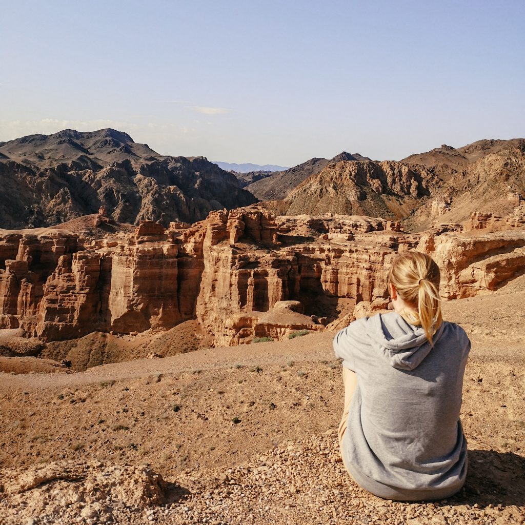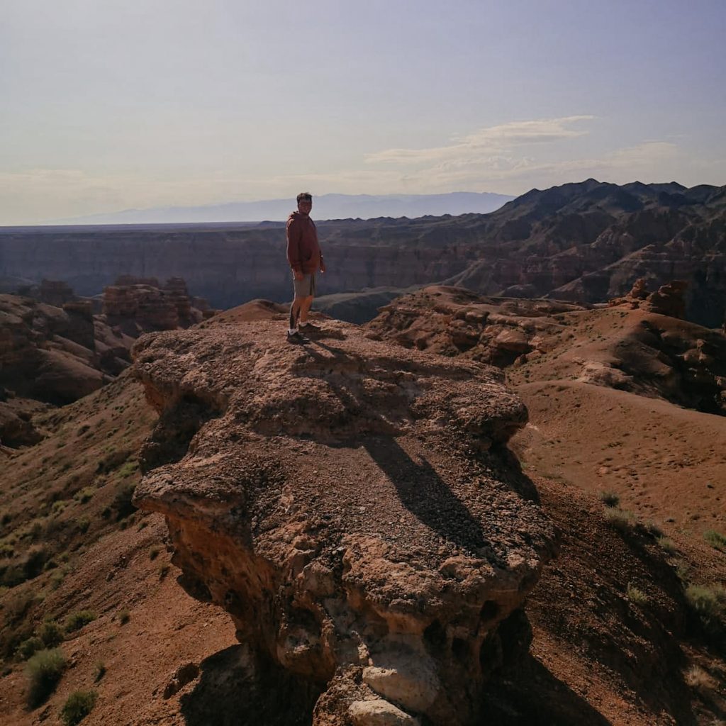 Wir machen uns kurz fertig und starten zeitnah in den Canyon. Bevor hier gleich die Touri-Massen einlaufen, starten wir mit der ersten Route „auf“ dem Canyon, danach gibt es eine zweite Route, die „durch“ das Tal des Canyons bis zum Fluss führt. Jeweils mit gleichem Hin- und Rückweg. Der Vergleich mit dem großen Bruder aus den USA liegt rein optisch gar nicht mal so fern. Mit nur 50 km vom Anfang bis zum Ende ist er eben nur etwas kleiner. Der Charyn Canyon folgt dem Hauptlauf des Charyn River. Die Schlucht erreicht eine Tiefe von 370 Metern. Besonders im Sonnenlicht leuchtet das rote Sedimentgestein beeindruckend schön. Direkt beim ersten Fotostopp werden wir genaustens beobachtet. Rechts und links tauchen plötzlich viele kleine Wühlmäuse auf, die neugierig aus ihren Löchern schauen und dabei kaum Scheu sind. Der Ausblick ist traumhaft schön.