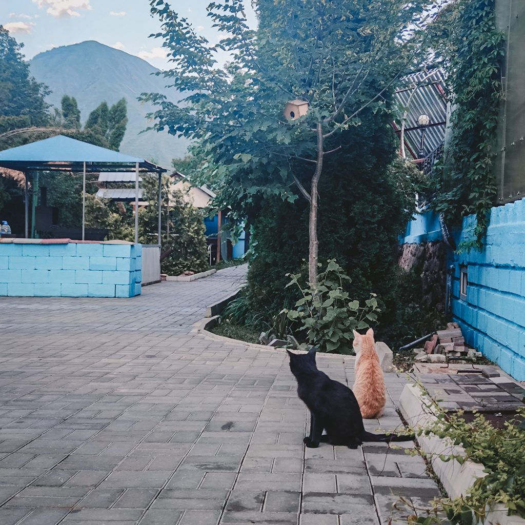 Das sogenannte Hostel ist in diesem Fall eher ein einfaches Resort. Auf einem großen Gelände, gibt es mehrere kleine Ferienhäuschen, einen Pool, einen großen Gemeinschaftsgrill und auch zwei 8er Dorms mit dazugehöriger Küche. Überall wachsen Pflanzen und Blumen. Es ist alles etwas in die Jahre gekommen und der Faible für Sonnenblumen (insbesondere bei der Einrichtung der Küche) ist sicher nicht jedermanns Sache, aber wir fühlen uns direkt wohl. Es ist super sauber, die Hausdame Natalya empfängt uns sehr herzlich und auf Deutsch (sie hat zuvor im Almaty als Übersetzerin gearbeitet und ist jedes Mal hellauf begeistert, wenn sie deutsche Gäste empfängt) und zu guter letzt: Es gibt hier super viele Katzen und die meisten lassen sich dazu breit schlagen sich von uns streicheln zu lassen.