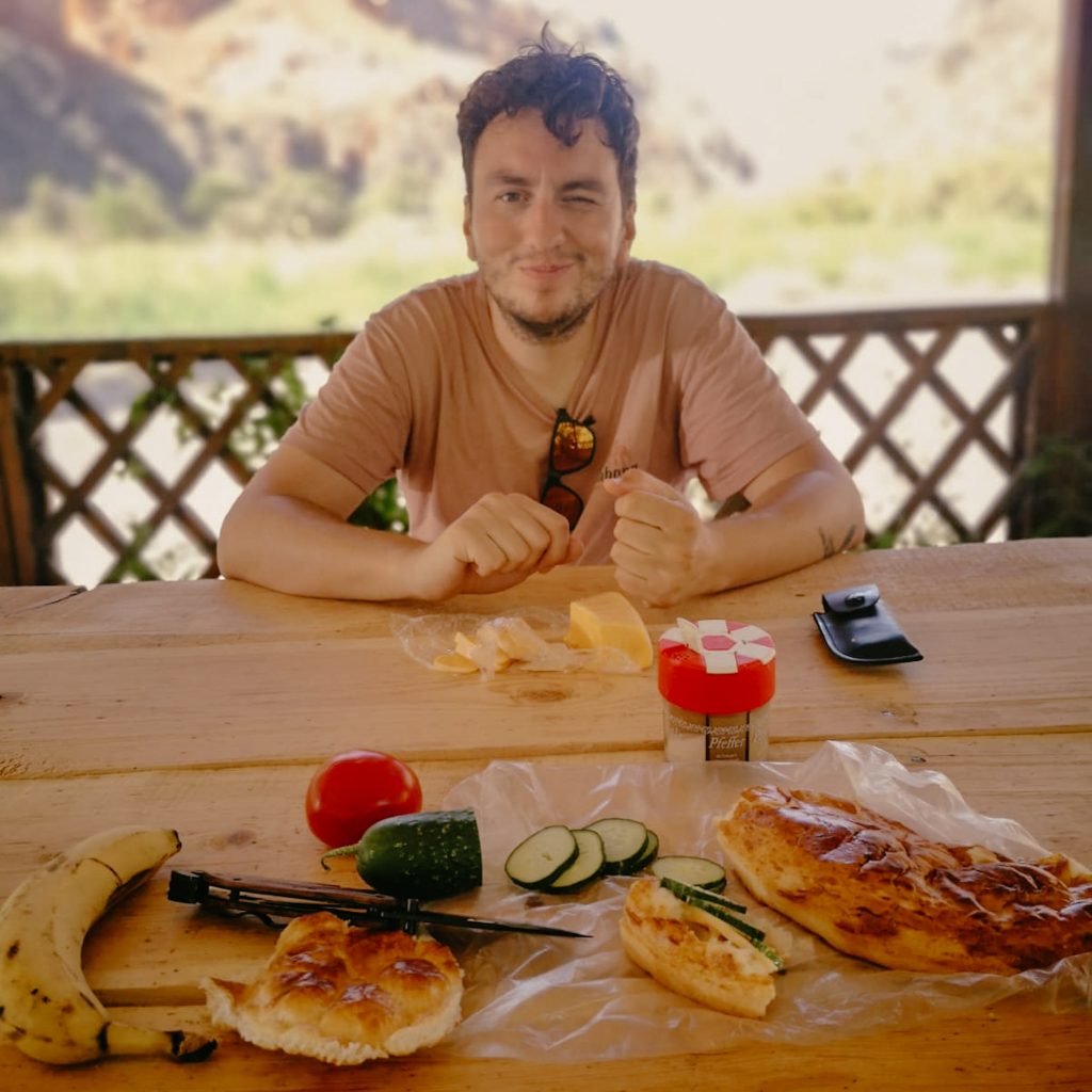 Dann wird es lauter. Eine Gruppe an Menschen teilt von nun an mit uns das Paradies. Sie sind auf Pferden unterwegs – unverschämt, das steht man extra früh auf und die anderen lassen sich auf dem Rücken der Pferde tragen 😅 Sie begrüßen uns aber nett und sind anschließend in ihrem Element. Sie sind nämlich nicht zum Entspannen hier, sondern versuchen ihr Glück beim Angeln. Wir genießen unseren Rohkost-Kichererbsensalat, Brot und den Rest Frischkäse. Hier oben schmeckt alles nochmal besser. Nach einer langen und ausgiebigen Pause, machen wir uns wieder auf den Weg nach unten.