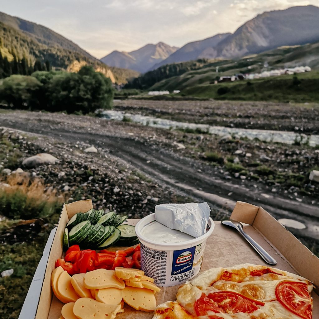 Wir haben zwar einen groben Plan, was wir uns anschauen wollen, aber mehr auch nicht. Es ist später Nachmittag und wir beschließen noch unser nächstes Ziel anzusteuern, damit wir dieses am nächsten Morgen früh besichtigen können: den Charyn Canyon. Bis dahin sind es noch ca. 3 Stunden Fahrt. Der zweite Beschluss: Wir möchten die Nacht im Auto verbringen. Nach einem kurzen Probeliegen auf dem Parkplatz, sind wir einstimmig der Meinung, dass wir unseren Rücken dies für eine Nacht zutrauen können. Wir haben noch Nudelreste mit Pesto und Salat von Caros Geburtstag und für das Frühstück haben wir eine Art Fladenbrot und Käse am Start.