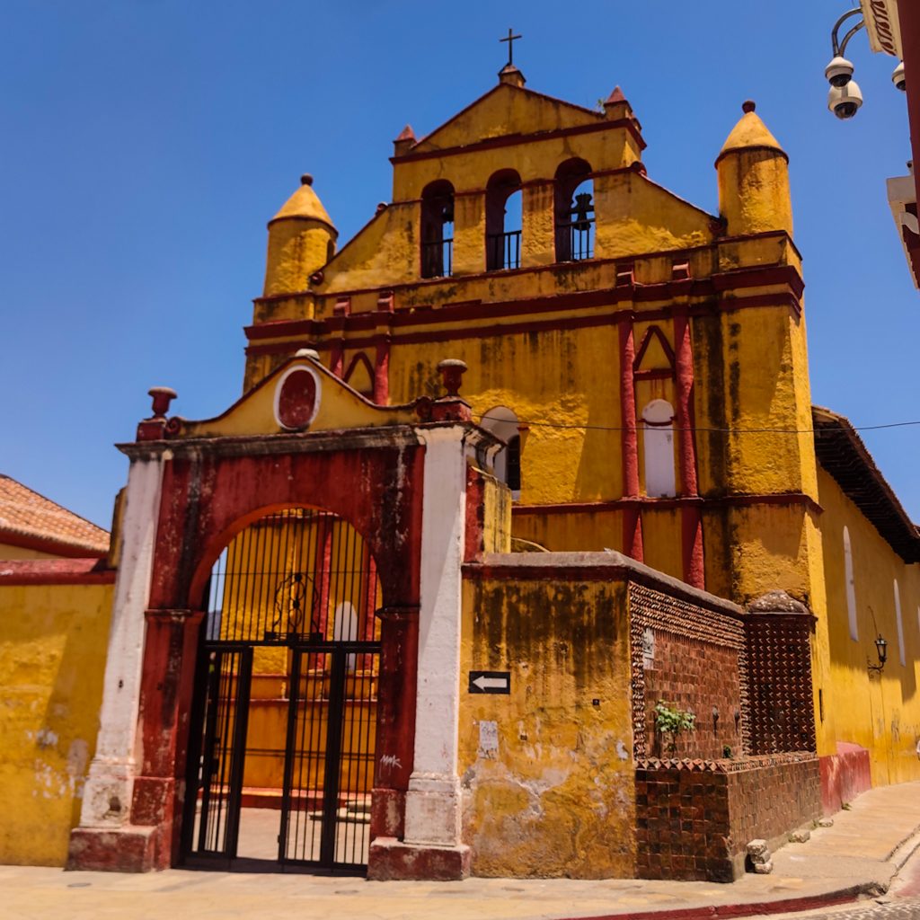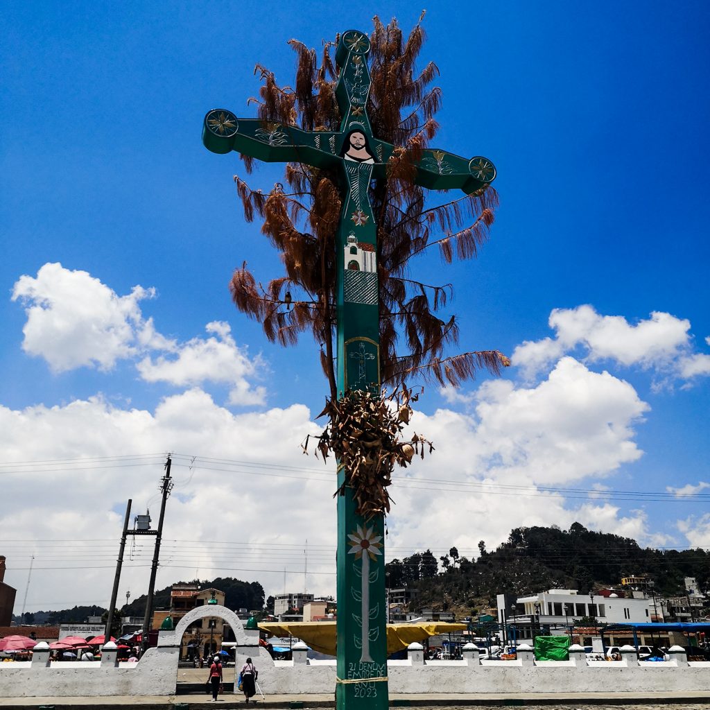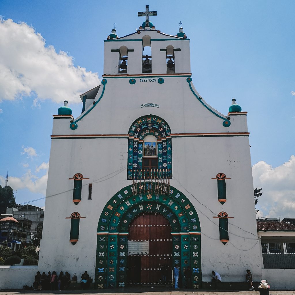 Als wir ankommen, steuern wir zunächst die Kirche an. Sophia hat bei der Freewalking Tour in San Cristobal gefragt, ob es auch Kirchen/Tempel/Glaubenshäuser gibt, in denen keine Tieropfer erbracht werden. Daraufhin wurde ihr der Besuch hier empfohlen. Und tatsächlich, hier sieht es ganz anders aus als gestern in Chamula. Es sind nur ein paar Menschen in der Kirche, die tatsächlich auch zum größten Teil noch wie eine Kirche aussieht. Was uns direkt auffällt: Die Blumen. Es gibt mehrere Altäre und Figuren. Vor ihnen hängen große Blumenteppiche. Alle mit frischen Blumen aufwendig zusammengesteckt. Und überhaupt, überall hier sind frische Blumen, richtig schön. Es ist auch wesentlich heller, es gibt Sitzbänke und keine Kiefernadeln auf dem Boden. Die Figuren, die überall an den Seiten stehen, haben meist einen kleinen Spiegel um den Hals hängen. Wir haben zuvor gelesen, dass der Spiegel die Seele des Menschen widerspiegelt und dass, sobald man in den Spiegel schaut, ein Teil der Seele in diesen übergeht. Auch daher ist es hier natürlich auch ausdrücklich verboten, Fotos zu machen. Insgesamt fühlen wir uns hier etwas wohler, wobei der gestrige Besuch noch etwas spannender war.