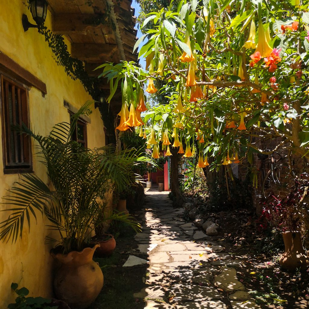 Übersetzt bedeutet dies übrigens so viel, wie das Gasthaus der Großeltern, was direkt am wunderschönen Keramikbild an der Außenwand zu erkennen ist. Hinter einem Holztor durchschreiten wir erstmal einen kleinen Weg mit riesigen Engelstrompeten, deren große weiße Blüten über unseren Köpfen hängen und wahnsinnig gut duften – zum Reinbeißen. Danach befinden wir uns im Innenhof, wo auch die Rezeption ist. Wir werden sehr nett begrüßt und hangeln uns mal wieder mit unserem Spanisch durch. Check in ist leider erst ab 14 Uhr, schade. Aber dafür können wir unsere Sachen unterstellen und erstmal frühstücken, das ist hier nämlich inklusive. Obwohl es noch recht früh ist, sind viele Menschen unterwegs und wir sind verwundert, wie viele Zimmer es hier geben muss. Über zwei Innenhöfe/Gärten verteilt sitzen überall Gäste in kleinen Sitzecken und lassen sich das Frühstück schmecken.