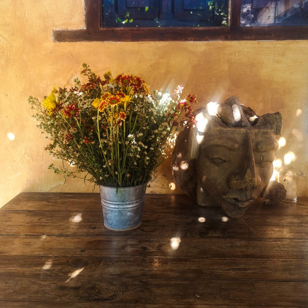 Bildet euch damit bitte selbst euer Bild. Viele der Anwesenden kannten sich auf jeden Fall bereits, umarmten sich lang und herzlich und begrüßten aber auch uns sehr offen und mit einem Lächeln. Unter ihnen identifizieren wir auch ein paar Expats, die anscheinend hier gestrandet sind. Wir kommen ein bisschen ins Gespräch, ein Mexikaner, der lustigerweise heute Geburtstag hat, spricht sogar ein bisschen Deutsch. Warum? Weil er sich für deutsche Literatur interessiert und sie in Originalsprache lesen und verstehen möchte. Ähm ja, ok. Eine ältere Dame, die augenscheinlich etwas in der Hippiezeit hängen geblieben ist, erzählt, dass sie heute Vormittag ein Portmonee bei sich im Garten gefunden hat. Hm, das hat dann wohl jemand nach einem Raub über ihren Zaun geworfen. Ein paar haben weitere Kinder dabei, andere noch mehr Hunde. Es kommen immer mehr Menschen und so langsam fragen wir uns, wie all diese Menschen in das Temazcal passen sollen. Auf einem kleinen Regalbrett breiten die Leute lauter Produkte zum Verkauf aus. Notizbücher, Tücher, riesige Kakao-Früchte, Honig und selbstgemachte Trüffel. Mittlerweile haben wir eigentlich schon wieder Hunger, aber irgendwie wollen wir jetzt auch nicht mehr richtig etwas essen. Ein paar der anwesenden Männer ziehen sich um und schmeißen sich in Badehosen. Wir haben keine Wechselklamotten dabei. Nur ein Handtuch, das war wahrscheinlich nicht so clever. Ein paar der Männer tragen Eimer mit Wasser vom Fluss nach oben und befüllen eine große Wassertonne. Ein paar Kräuterbündel (Caro meint, Kamille zu erkennen) werden in Wasser eingeweicht. Es wird noch das Geld eingetrieben, wir bezahlen 15 Euro pro Person und dann scheint es wirklich loszugehen.